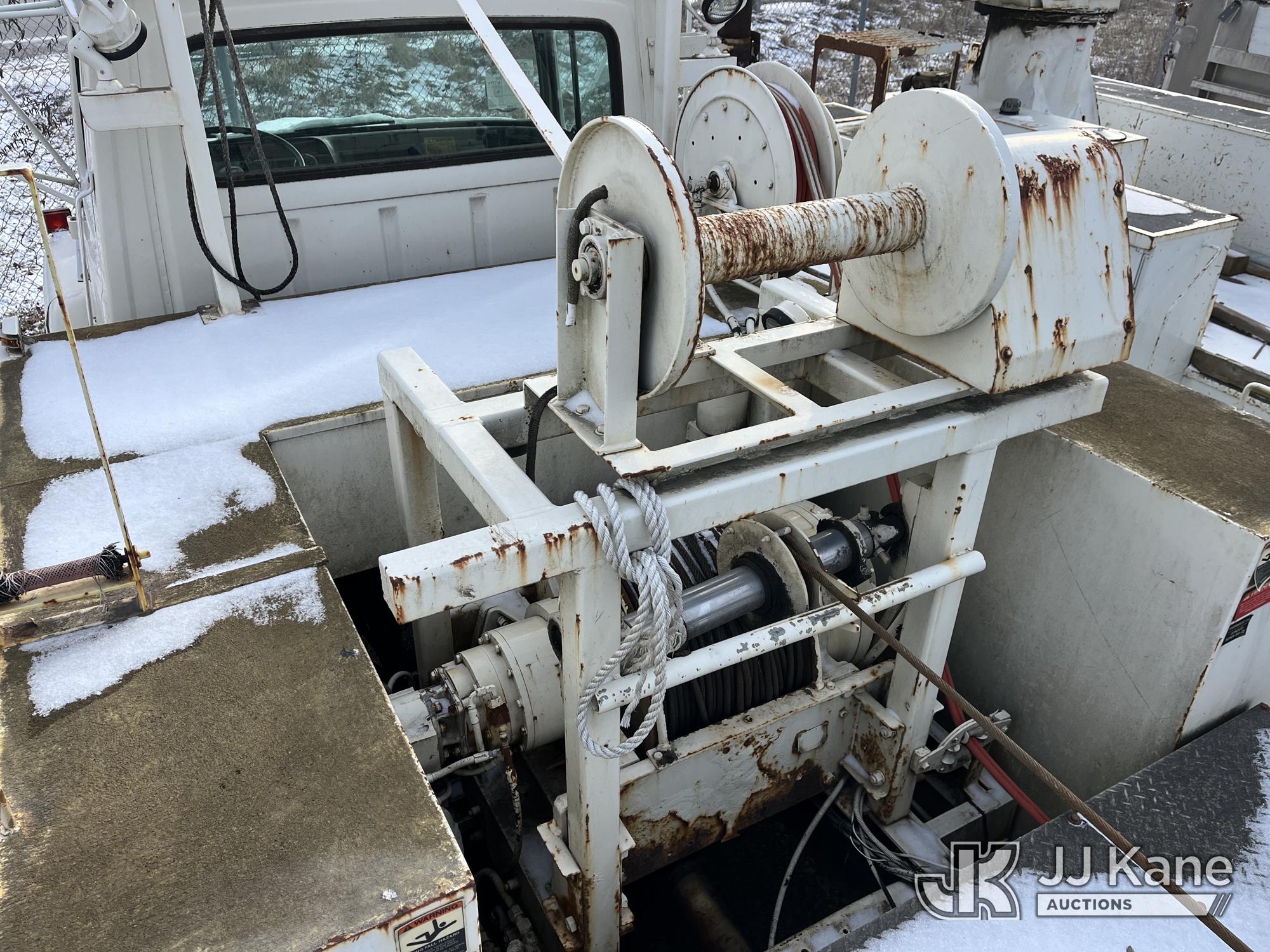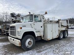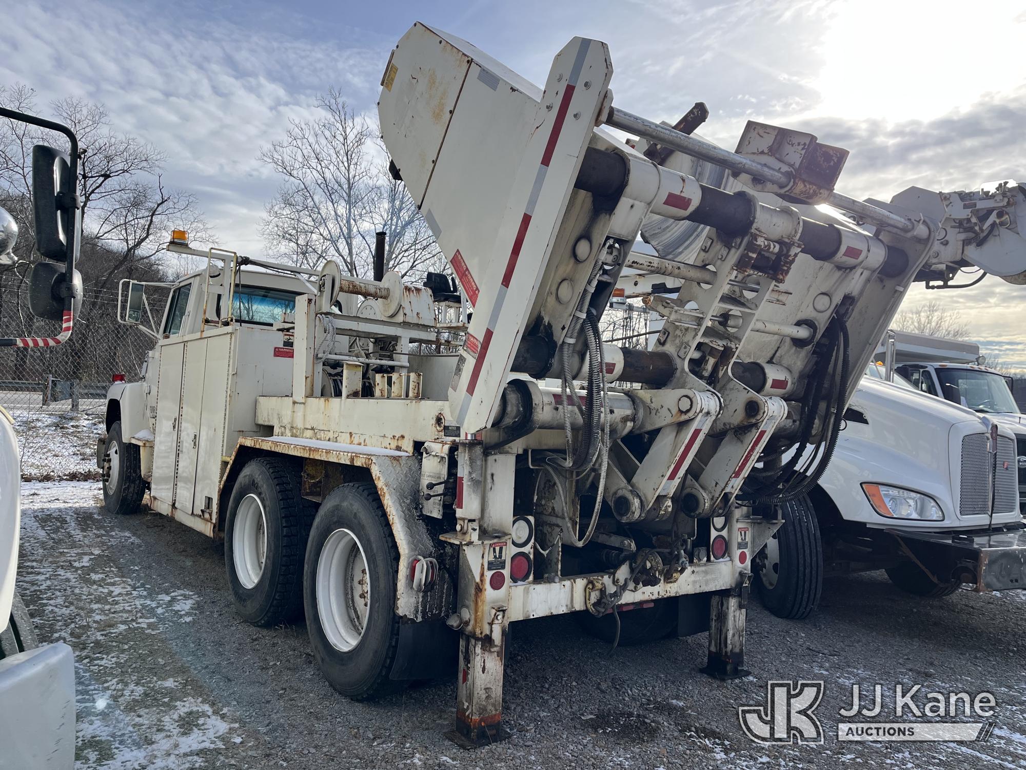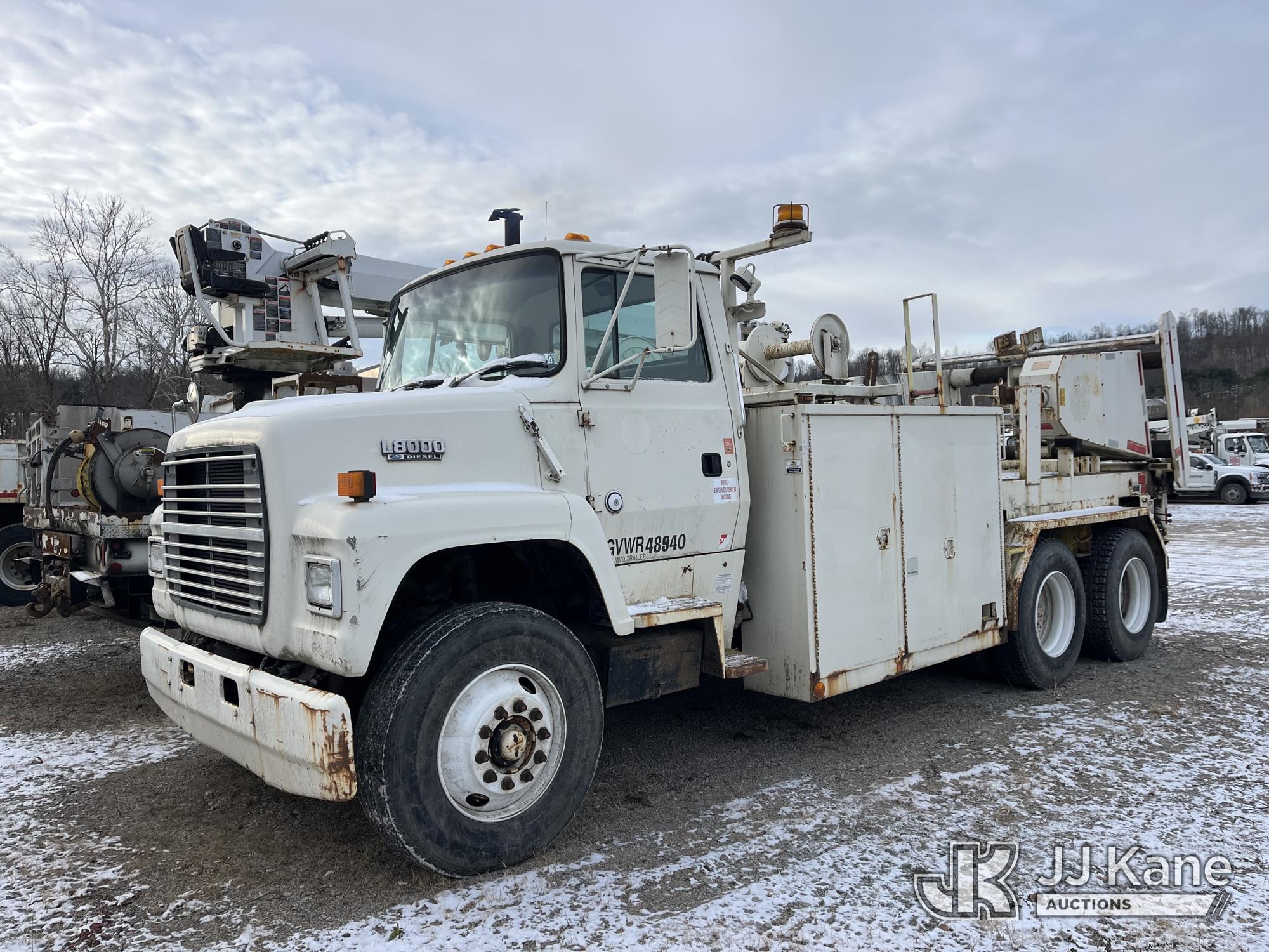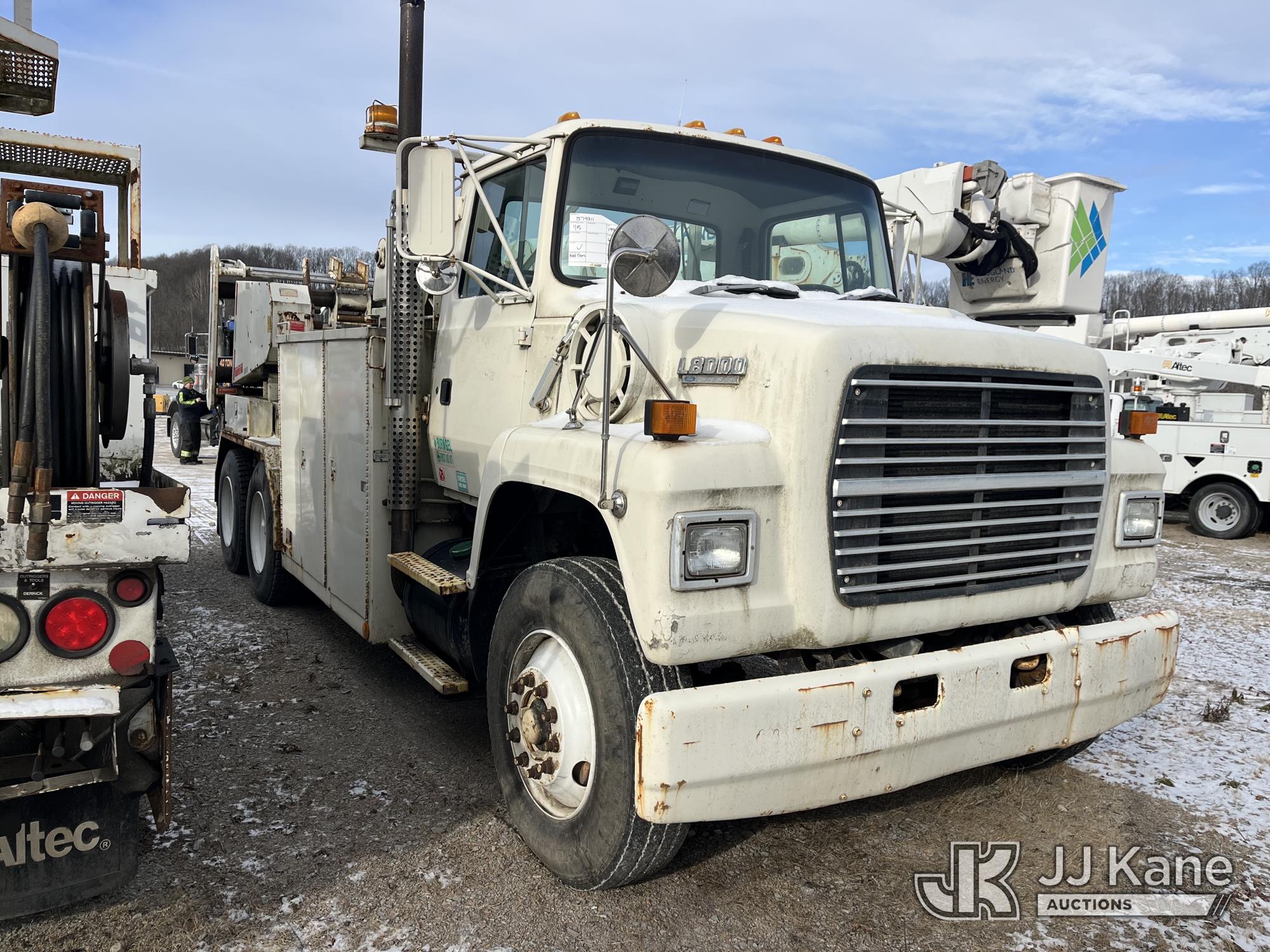 Sterling LP108, 16,000 Lb Underground Cable Puller s/n 12900408119, rear mounted on 1991 Ford LNT8000F T/A Flatbed/Utility Truck, 7.8L L6 Turbo Diesel, 4X2, Auto, with Bed Winch, (Exempt from Odometer Disclosure - Reads 67,537 miles) (Runs, Not Moving, Outriggers & Reel Loader Operate, Missing Serial Plate, Rust Damage, Seller States: Bad Transmission) (Reads 793 hours) This is a Titled Item*