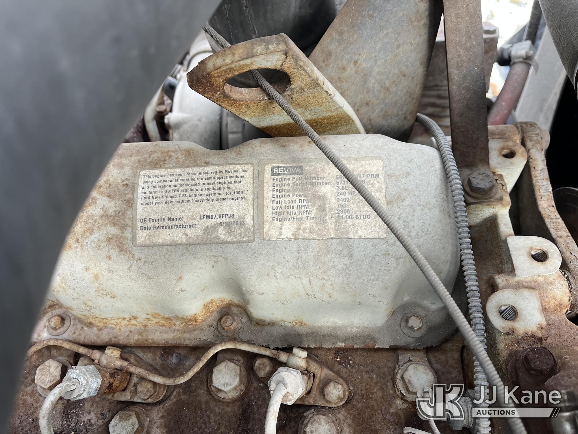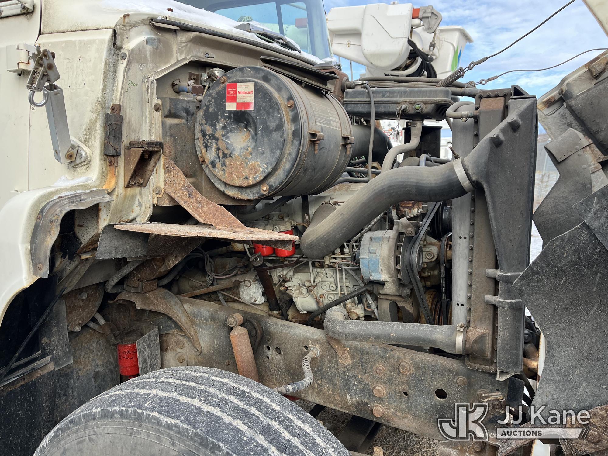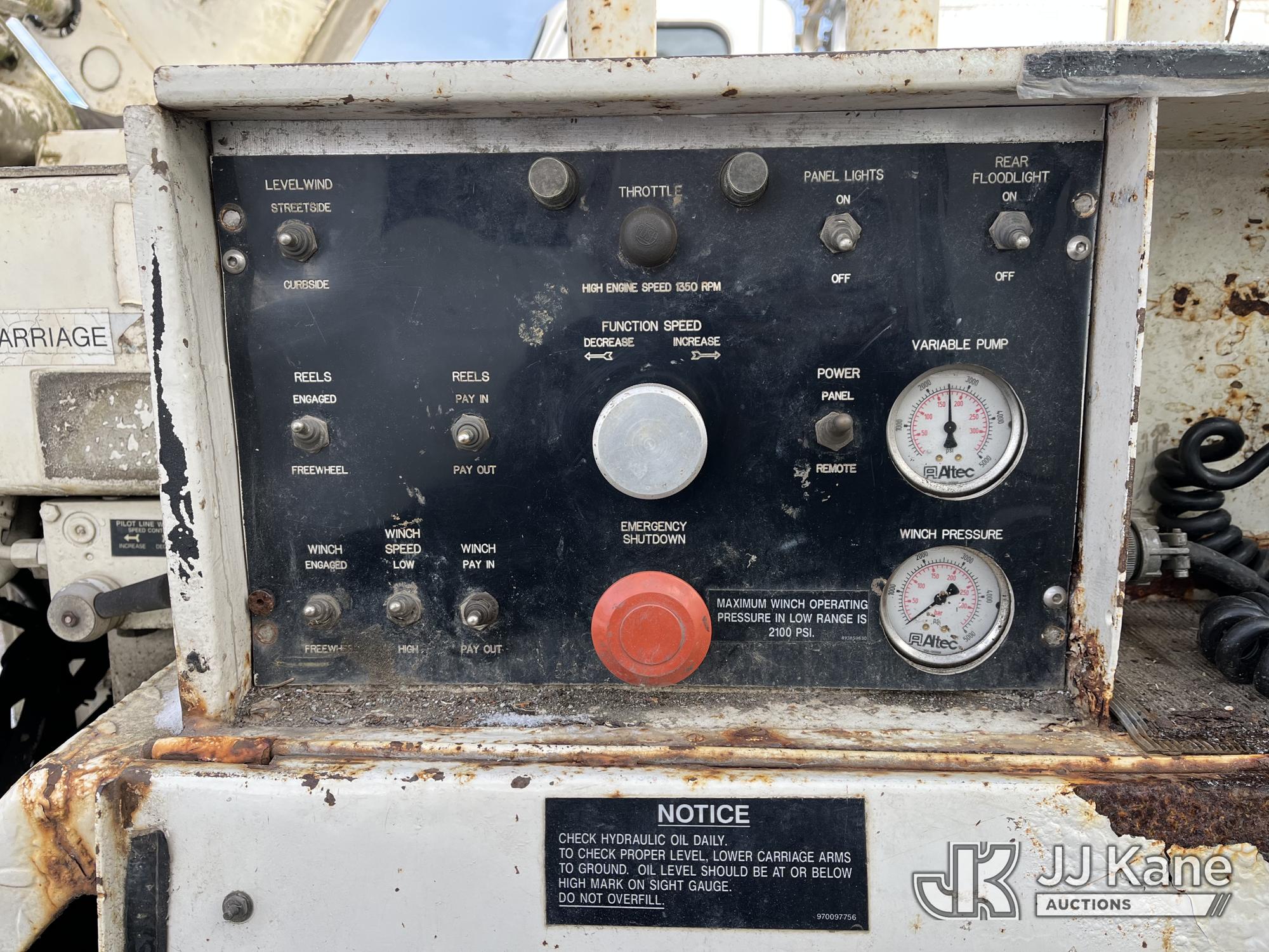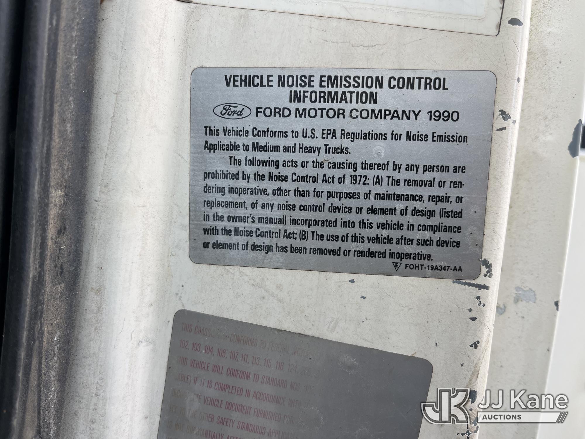 Sterling LP108, 16,000 Lb Underground Cable Puller s/n 12900408119, rear mounted on 1991 Ford LNT8000F T/A Flatbed/Utility Truck, 7.8L L6 Turbo Diesel, 4X2, Auto, with Bed Winch, (Exempt from Odometer Disclosure - Reads 67,537 miles) (Runs, Not Moving, Outriggers & Reel Loader Operate, Missing Serial Plate, Rust Damage, Seller States: Bad Transmission) (Reads 793 hours) This is a Titled Item*