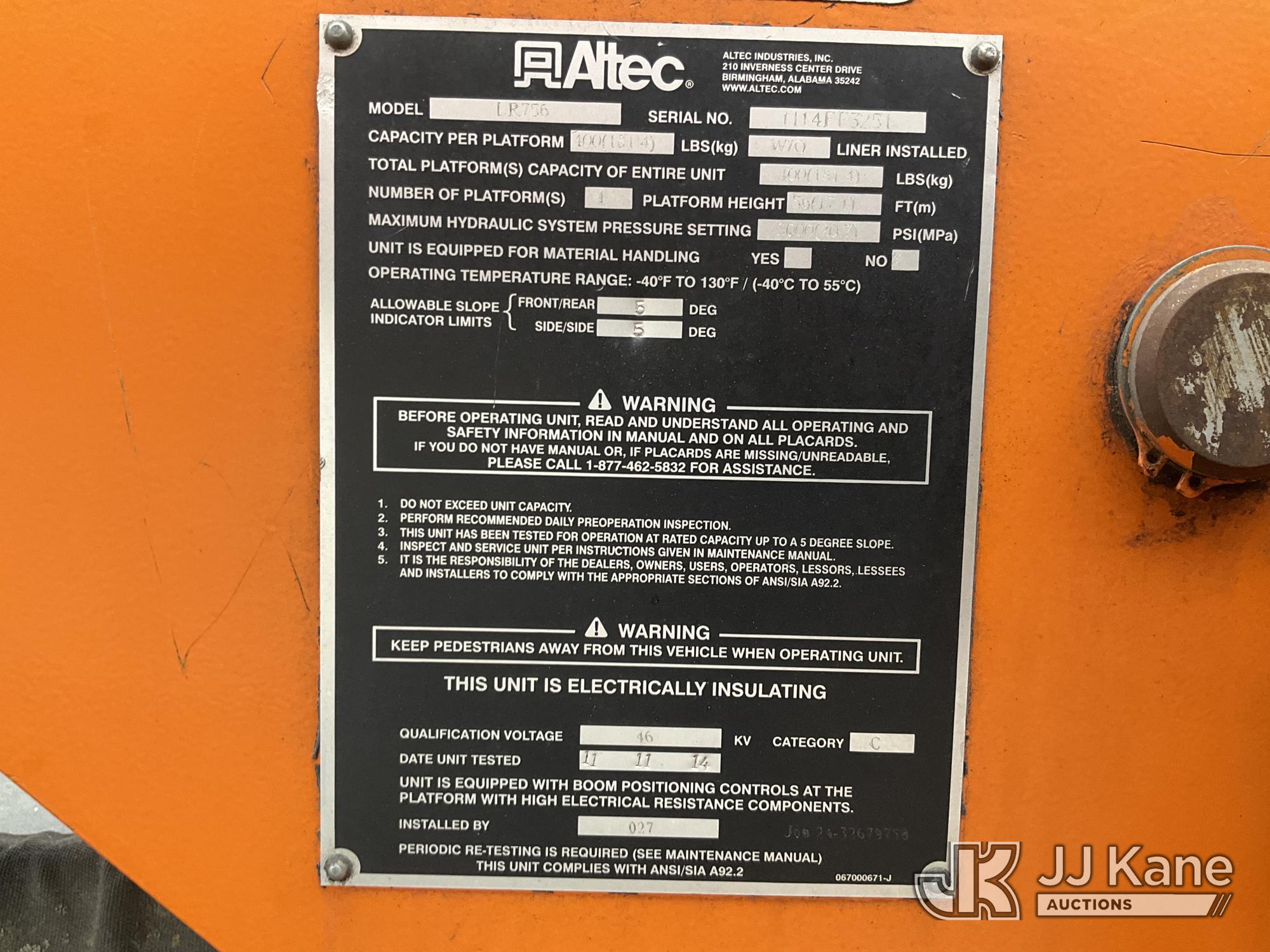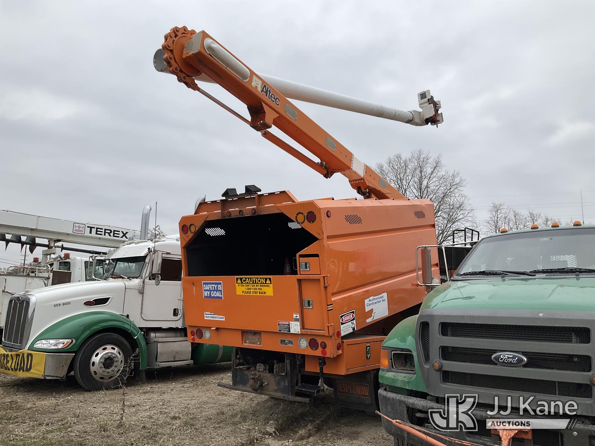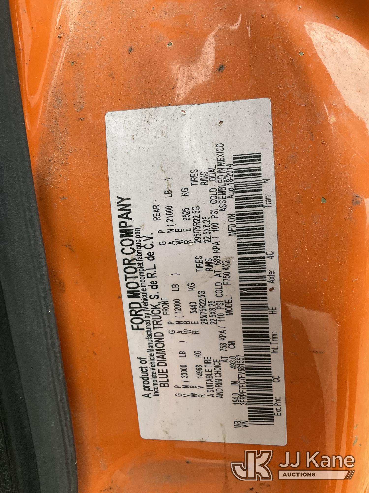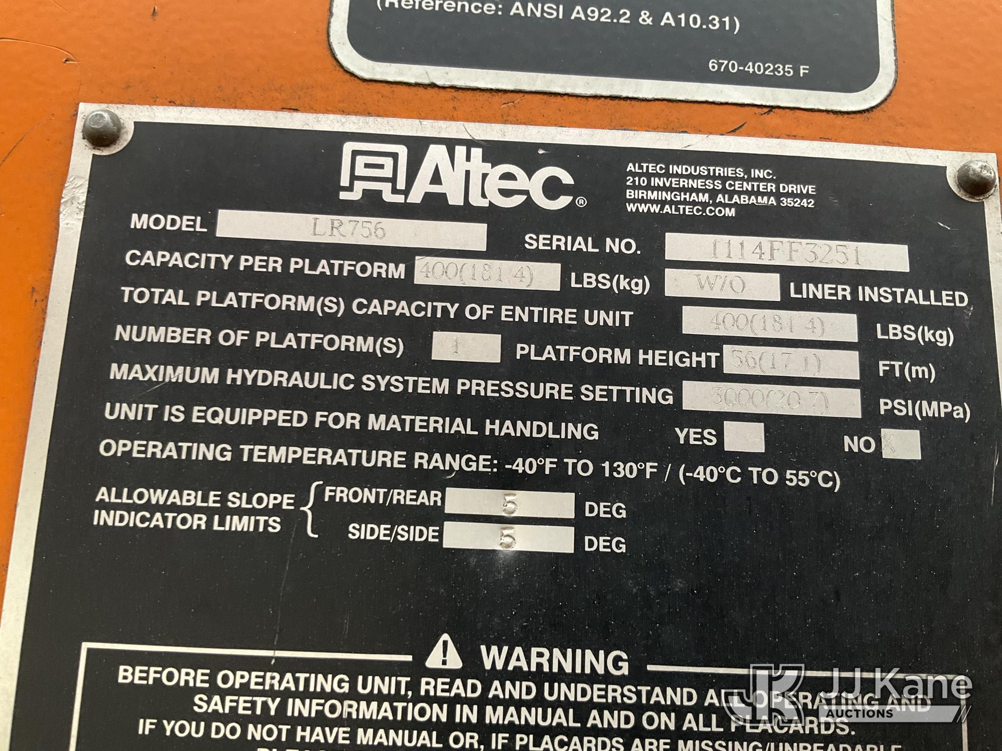 Altec LR756, 61 ft, Over-Center Bucket Truck s/n 1114FF3251, with single man bucket, two hydraulic outriggers, mounted behind cab on 2015 Ford F-750 Regular Cab 2WD DRW Chipper Dump Truck, 6.7L L6 DIESEL 6-spd, (83,947 miles) (Runs, Moves, Operates) (Driveshaft Hardware Missing - Unsafe to Drive, No Bucket, Rust) (Seller States: Electrical and Fuel System Issues) This is a Titled Item*