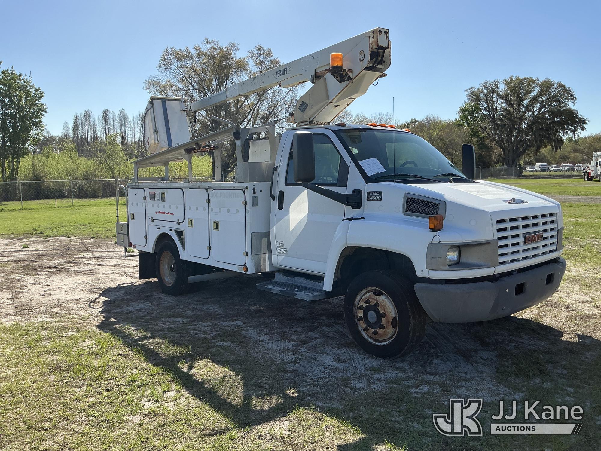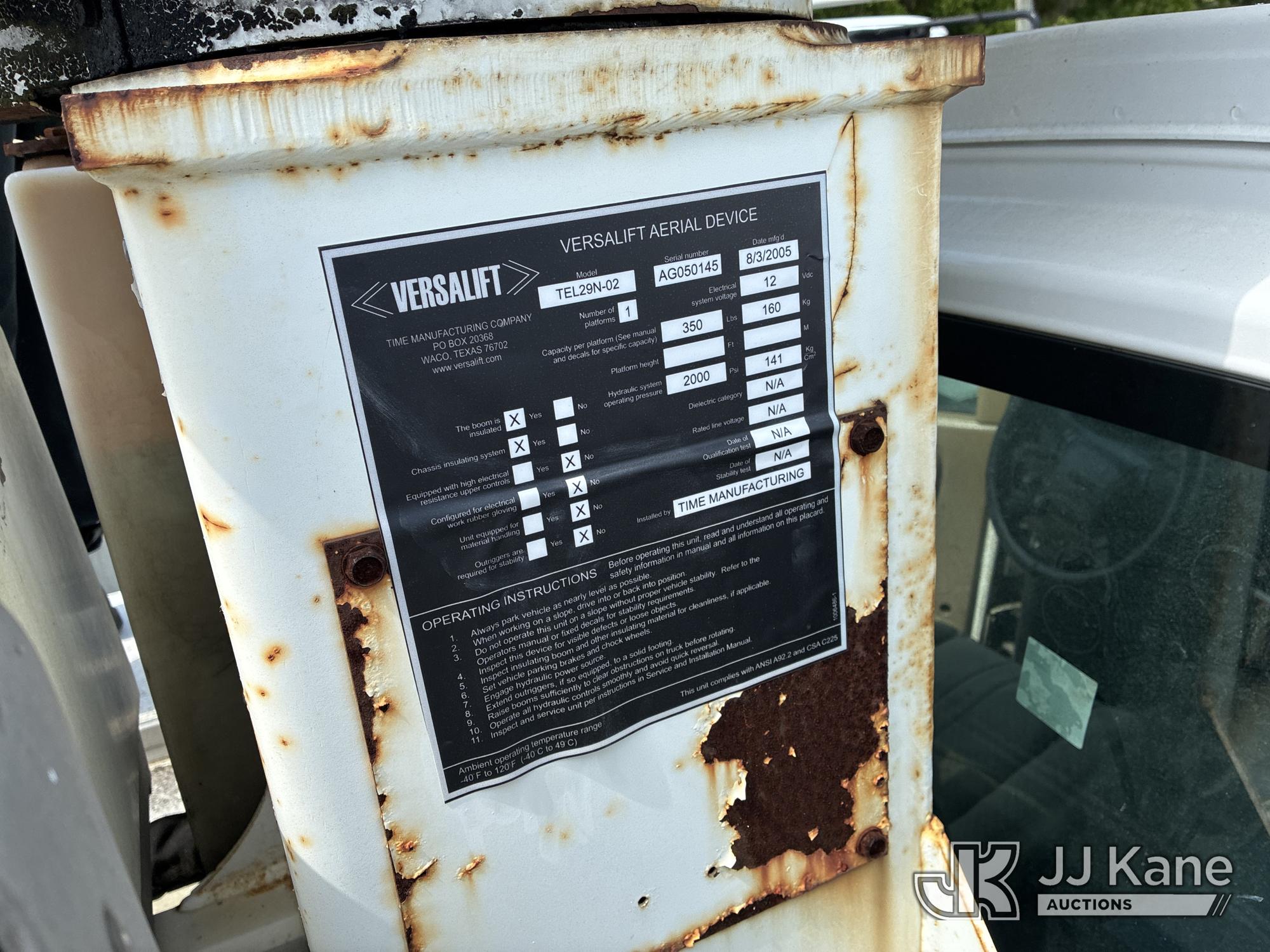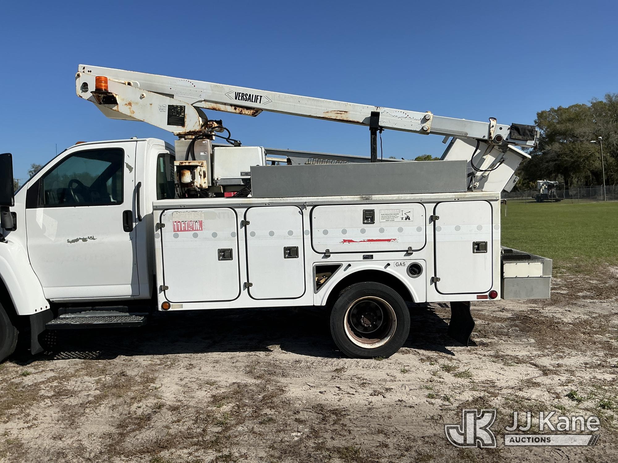 Versalift TEL29N-02, Telescopic Non-Insulated Bucket Truck s/n AG050145, with single-man bucket, mounted behind cab on 2005 GMC C4500 Service Truck, 8.1L V8 OHV 16V Gas, 4X2, Auto, A/C, with Onan generator, (Exempt from Odometer Disclosure - Reads 137,088 miles) (Runs, Moves, Upper Operates) (Tilt Bucket INOP, Hydraulic Leak, Needs Batteries, Brake Light On) (FL Residents Purchasing Titled Items – tax, title & registration fees will be collected at the maximum rate of $400.00 under 25,999 and $800.00 for Over 26,000 and $250.00 trailers – Proof of insurance is mandatory; Out of State Residents Purchasing Title Items – tax will be collected based upon your state rate.) This is a Titled Item*