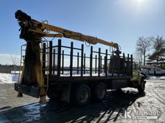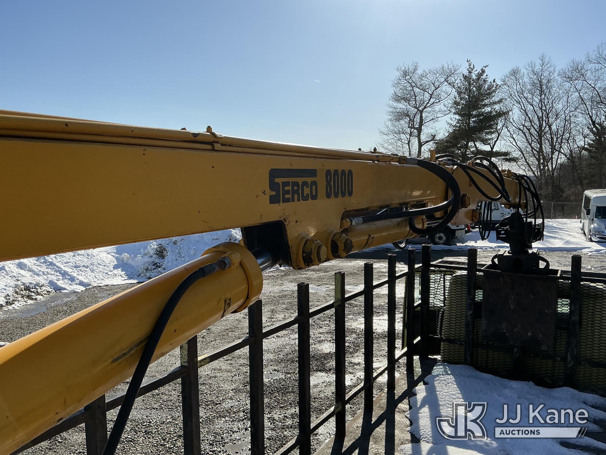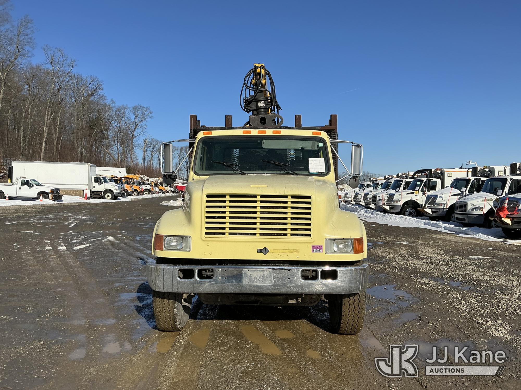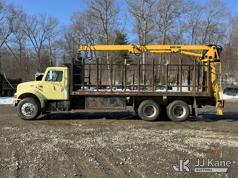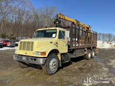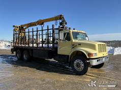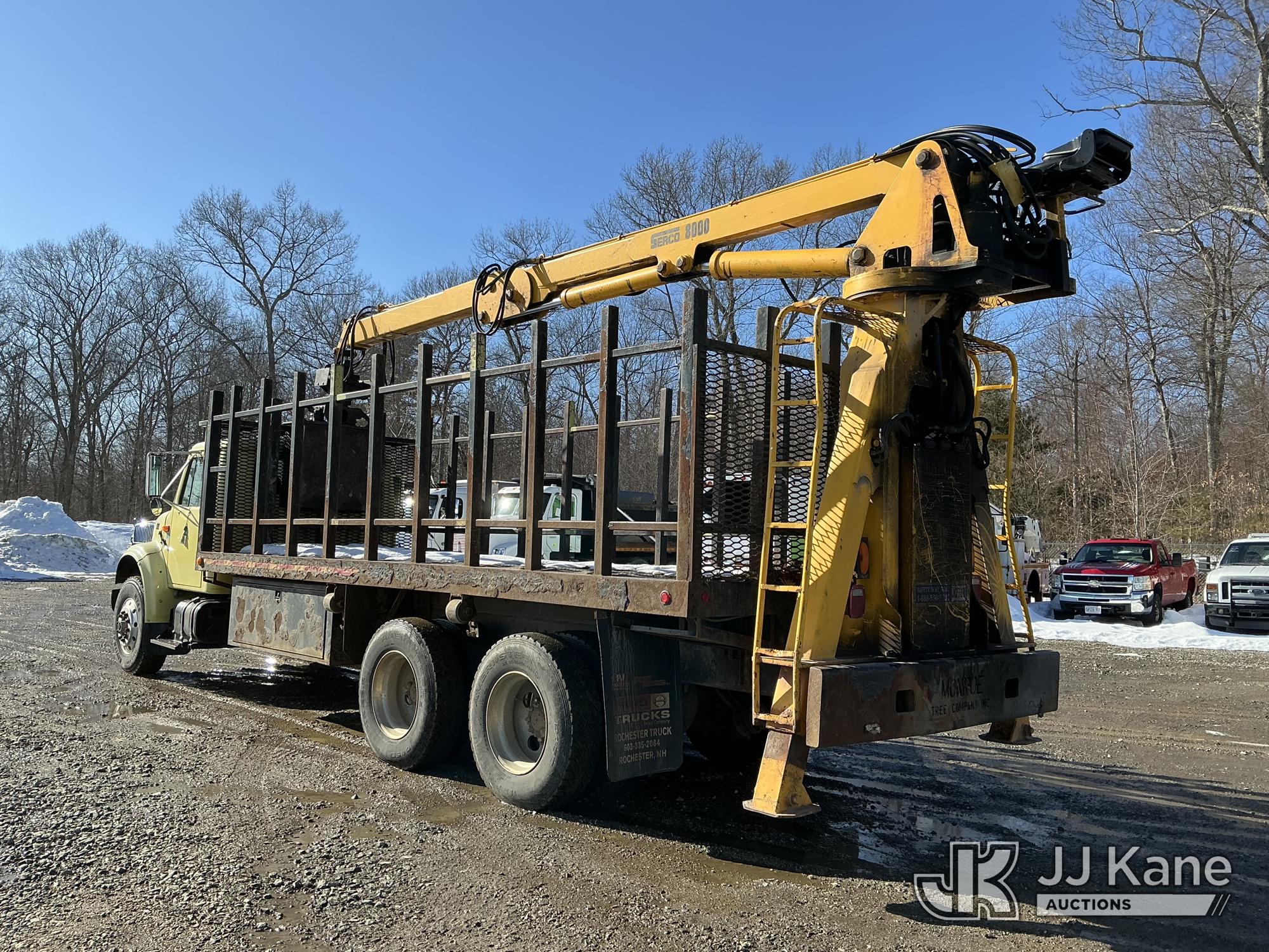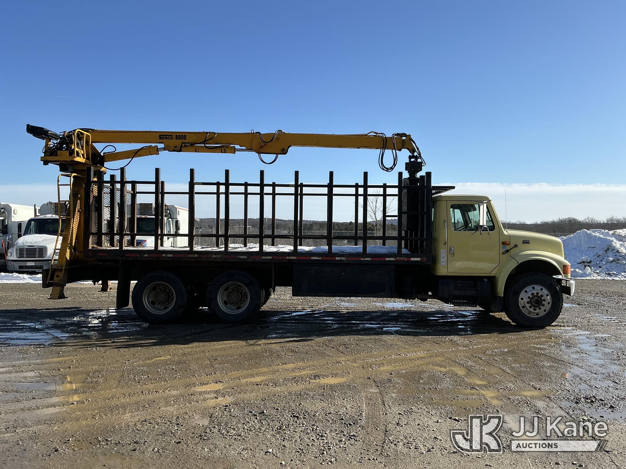 Serco 8000, 8,000 Lb Grappleboom/Log Loader Crane s/n L3814, with 27 ft reach & 2 hyd outriggers & riding console, rear mounted on 1998 International 4900 T/A Flatbed/Log Truck, DT530 6X4, diesel, Auto, (Exempt from Odometer Disclosure - Reads 120,040 miles) (Runs & Moves) (Road Side Outrigger Control Seized, Upper Condition Unknown, Road Side Door Handle Inoperable, Seller States: Loader Valve Bank & Rotary Manifold Are Leaking & Need Replacement) (Reads 8,253 hours) This is a Titled Item*