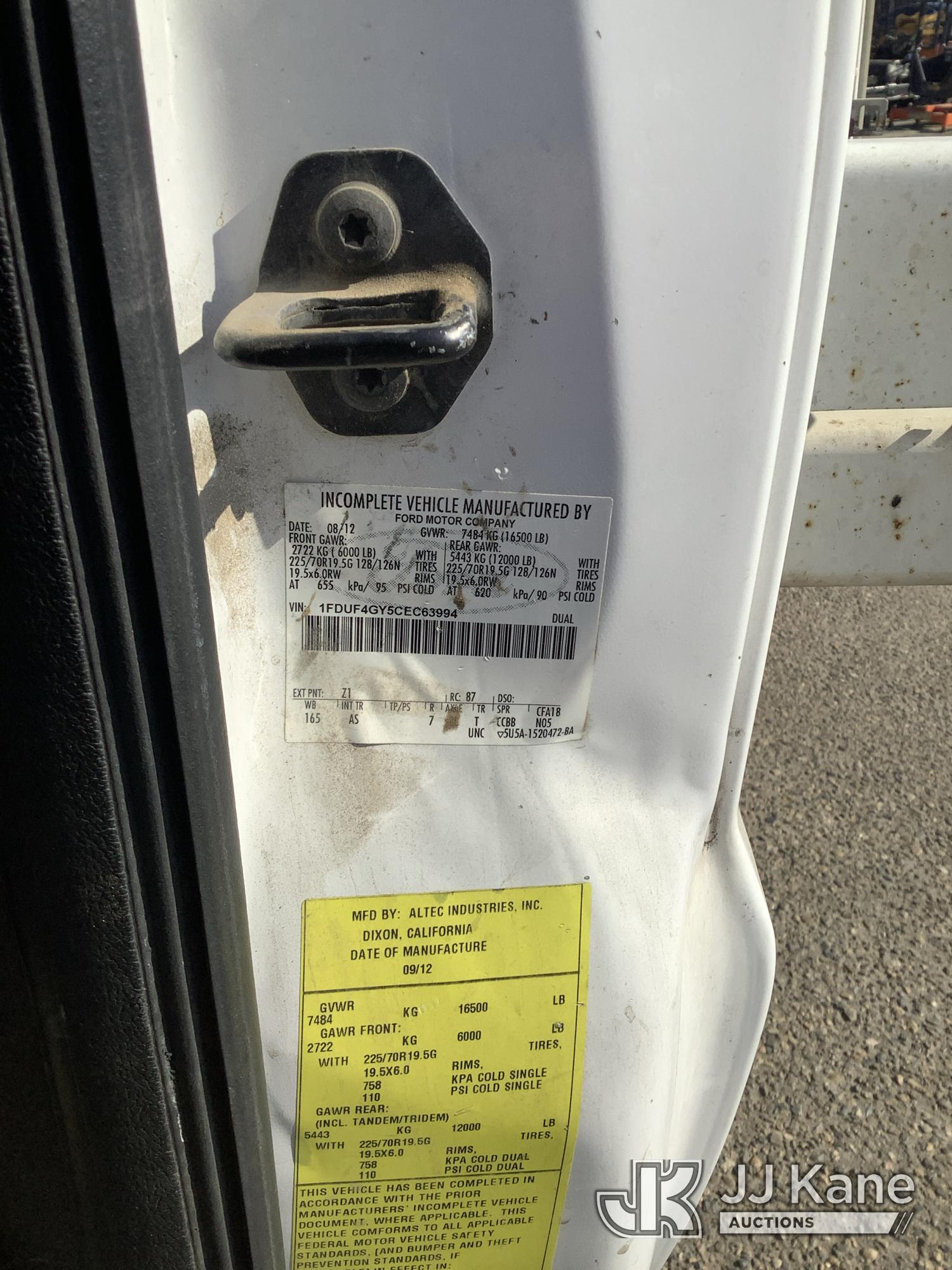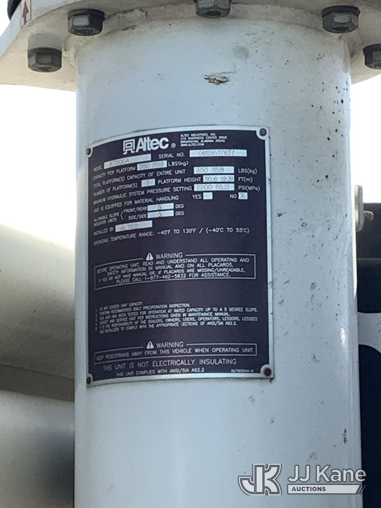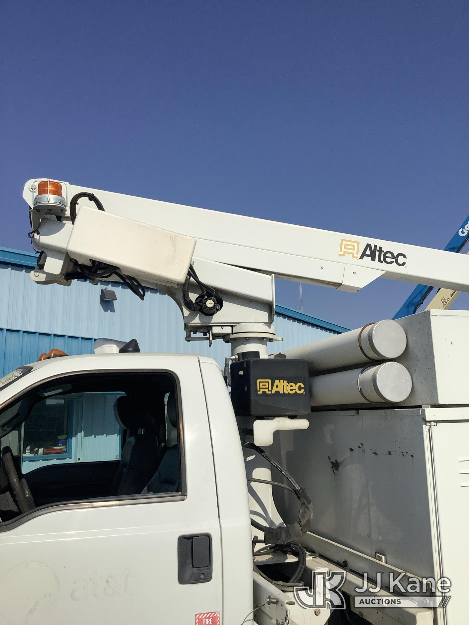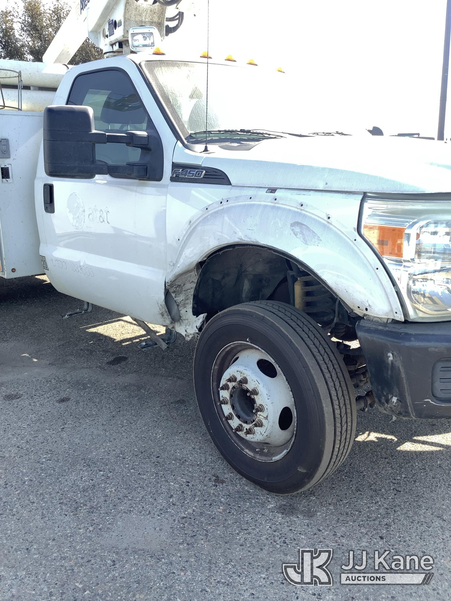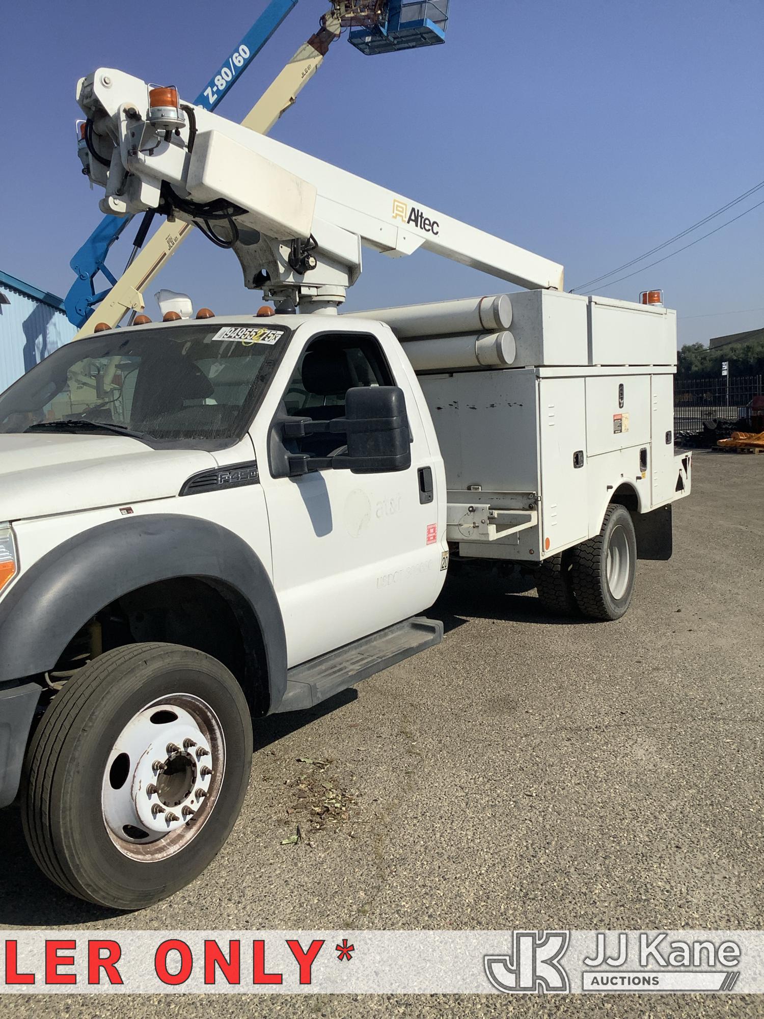 Altec AT200-A, 35 ft, Telescopic Non-Insulated Bucket Truck s/n 0812BV17837, with single man bucket, mounted behind cab on 2012 Ford F-450 SD Service Truck, 10-cyl gas, RWD, Auto, (141,983 miles) Element Lease Return (**Dealer Only**) (Runs & Moves) (Major Body Damage, Missing Parts, Hydraulic Leak)(This item has been removed from service due to the listed safety repairs that were not completed. The safety items below must be completed by an approved OEM facility before the unit can return to service: UPPER BOOM TIP DAMAGED/CUT OFF; PLATFORM MISSING; REQUIRES ANSI INSPECTION FOR REPAIR/REPLACEMENT REQUIREMENTS, COMPLETE ANY REQUIRED TESTING AND REPAIRS AFTER INSPECTIONS ARE COMPLETED) (Bidding Restricted to Licensed Vehicle Dealers Only), This is a Titled Item*