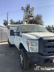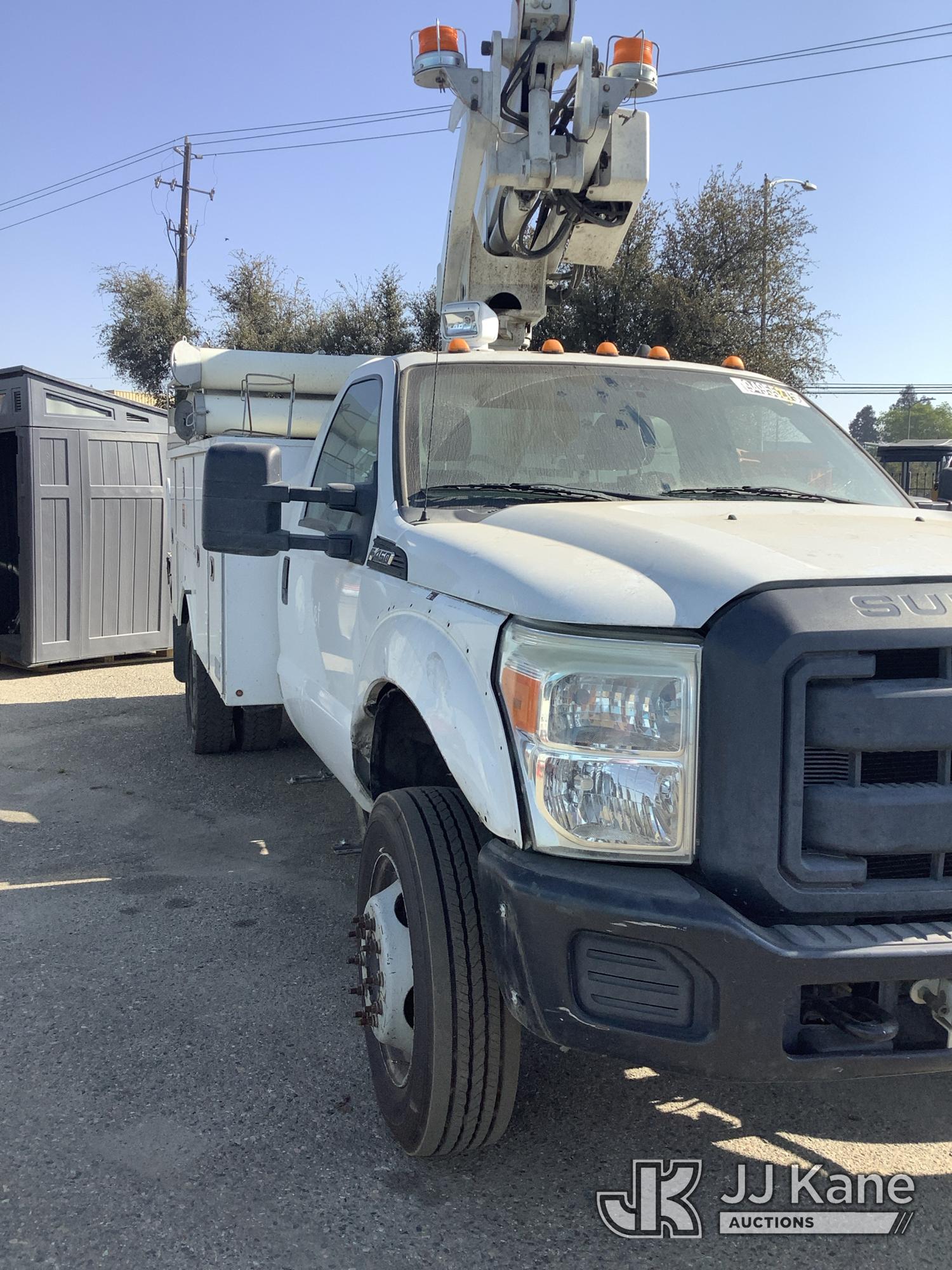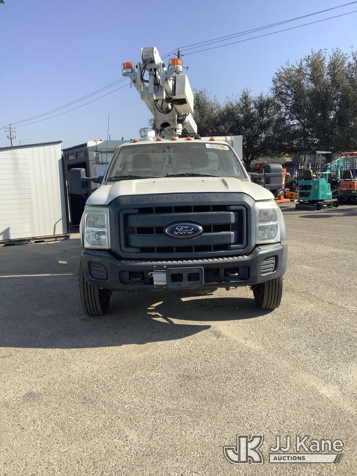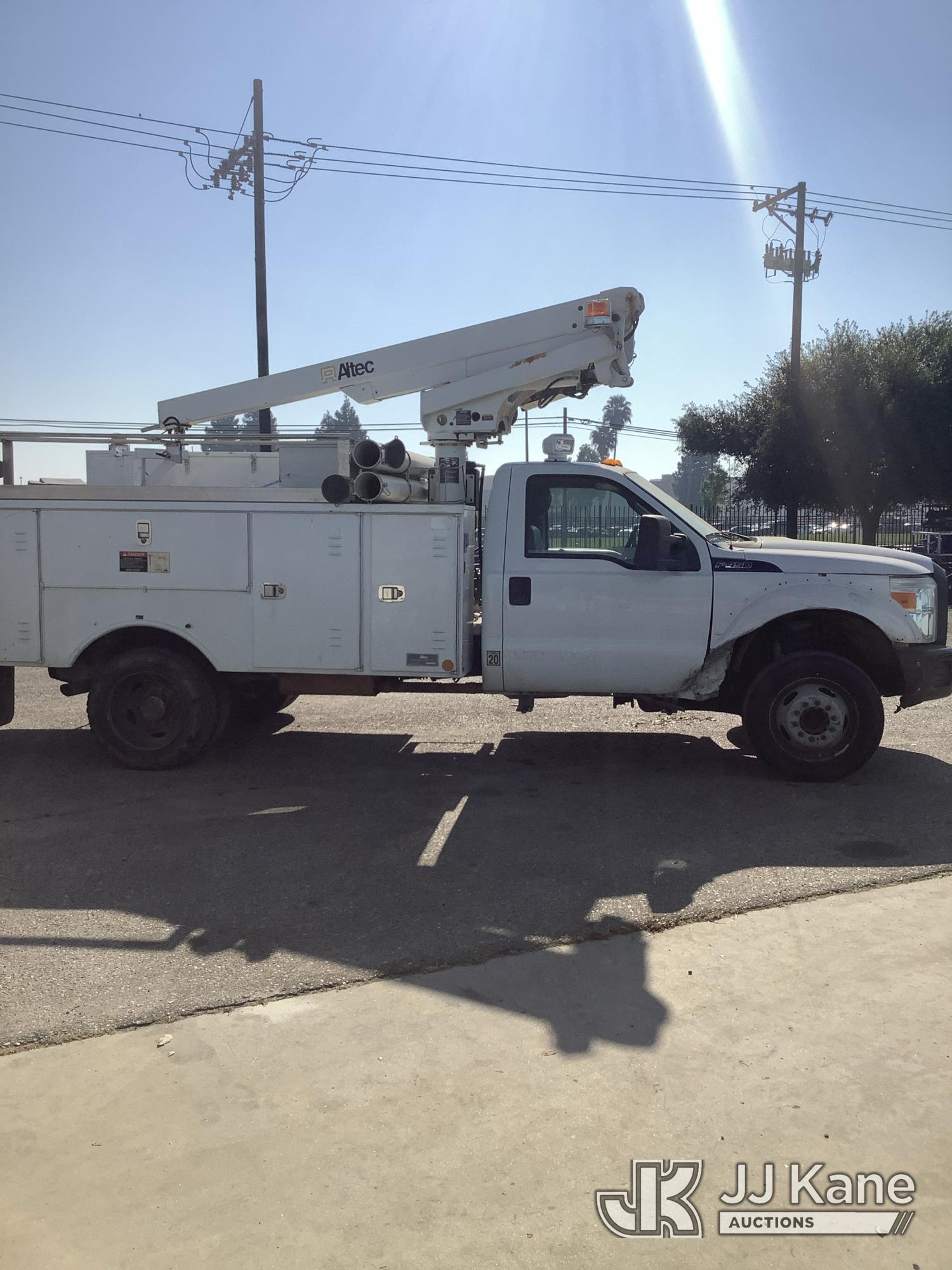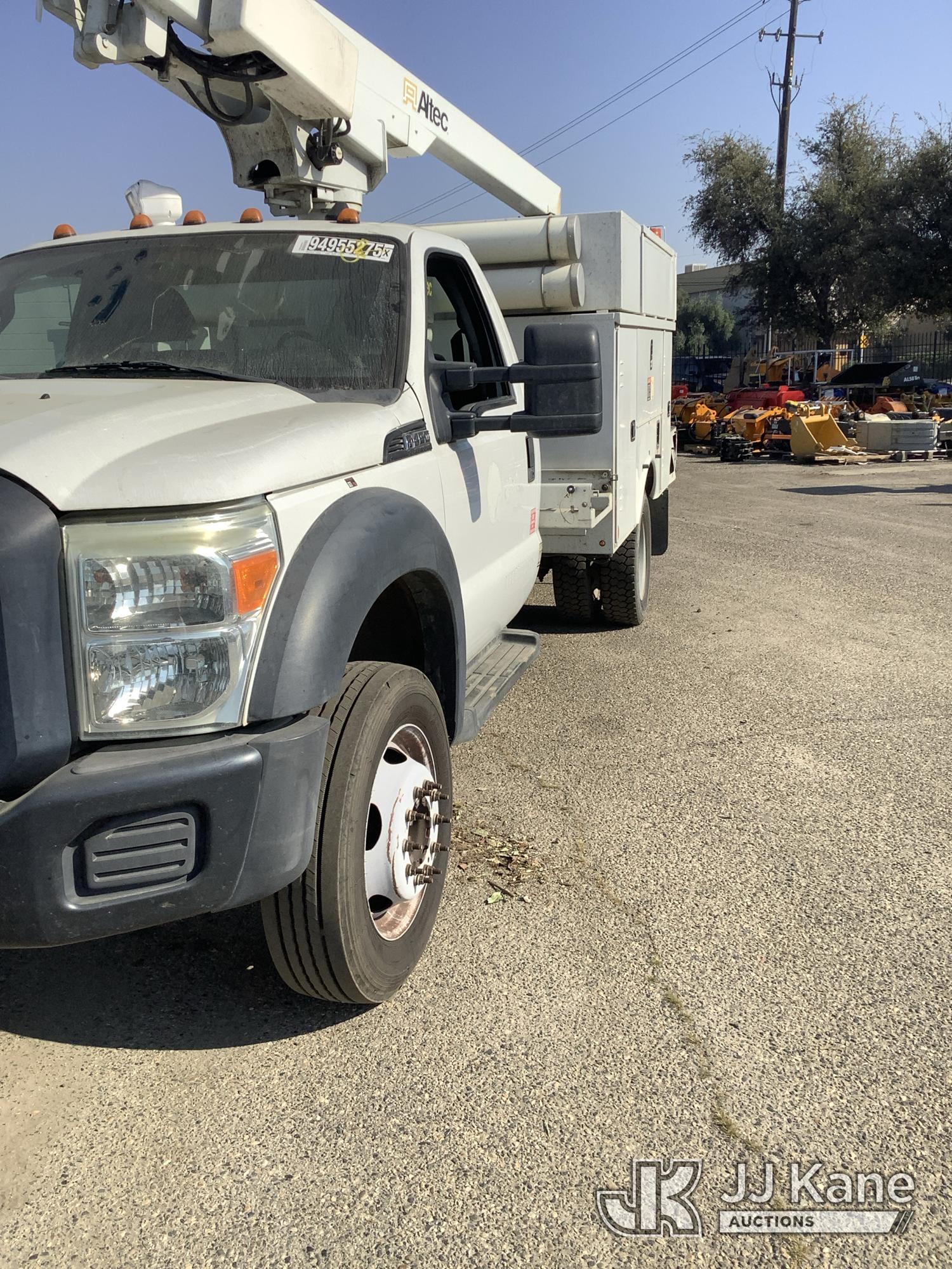 Altec AT200-A, 35 ft, Telescopic Non-Insulated Bucket Truck s/n 0812BV17837, with single man bucket, mounted behind cab on 2012 Ford F-450 SD Service Truck, 10-cyl gas, RWD, Auto, (141,983 miles) Element Lease Return (**Dealer Only**) (Runs & Moves) (Major Body Damage, Missing Parts, Hydraulic Leak)(This item has been removed from service due to the listed safety repairs that were not completed. The safety items below must be completed by an approved OEM facility before the unit can return to service: UPPER BOOM TIP DAMAGED/CUT OFF; PLATFORM MISSING; REQUIRES ANSI INSPECTION FOR REPAIR/REPLACEMENT REQUIREMENTS, COMPLETE ANY REQUIRED TESTING AND REPAIRS AFTER INSPECTIONS ARE COMPLETED) (Bidding Restricted to Licensed Vehicle Dealers Only), This is a Titled Item*