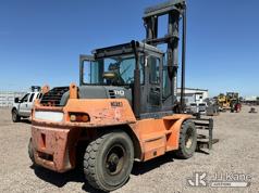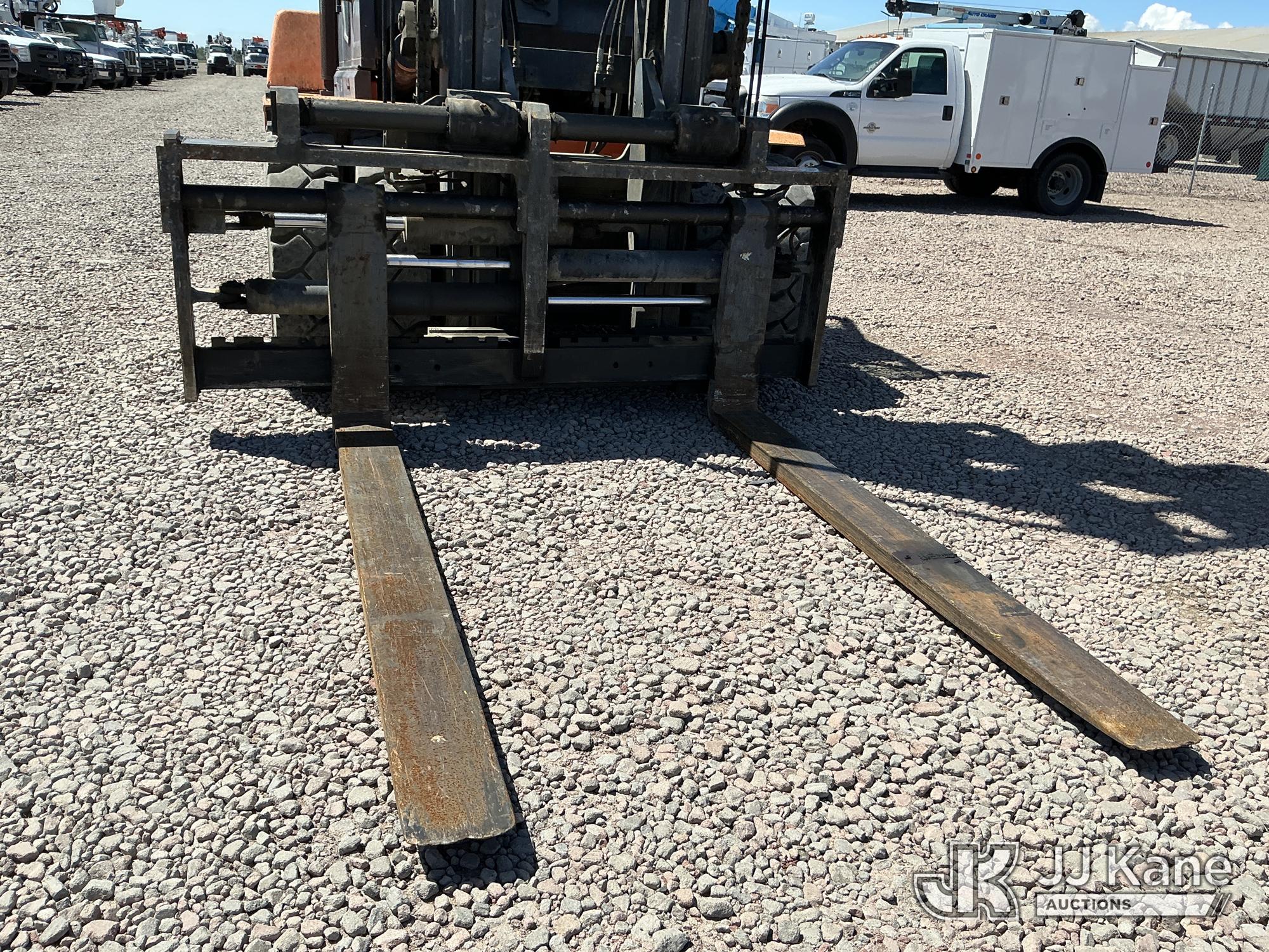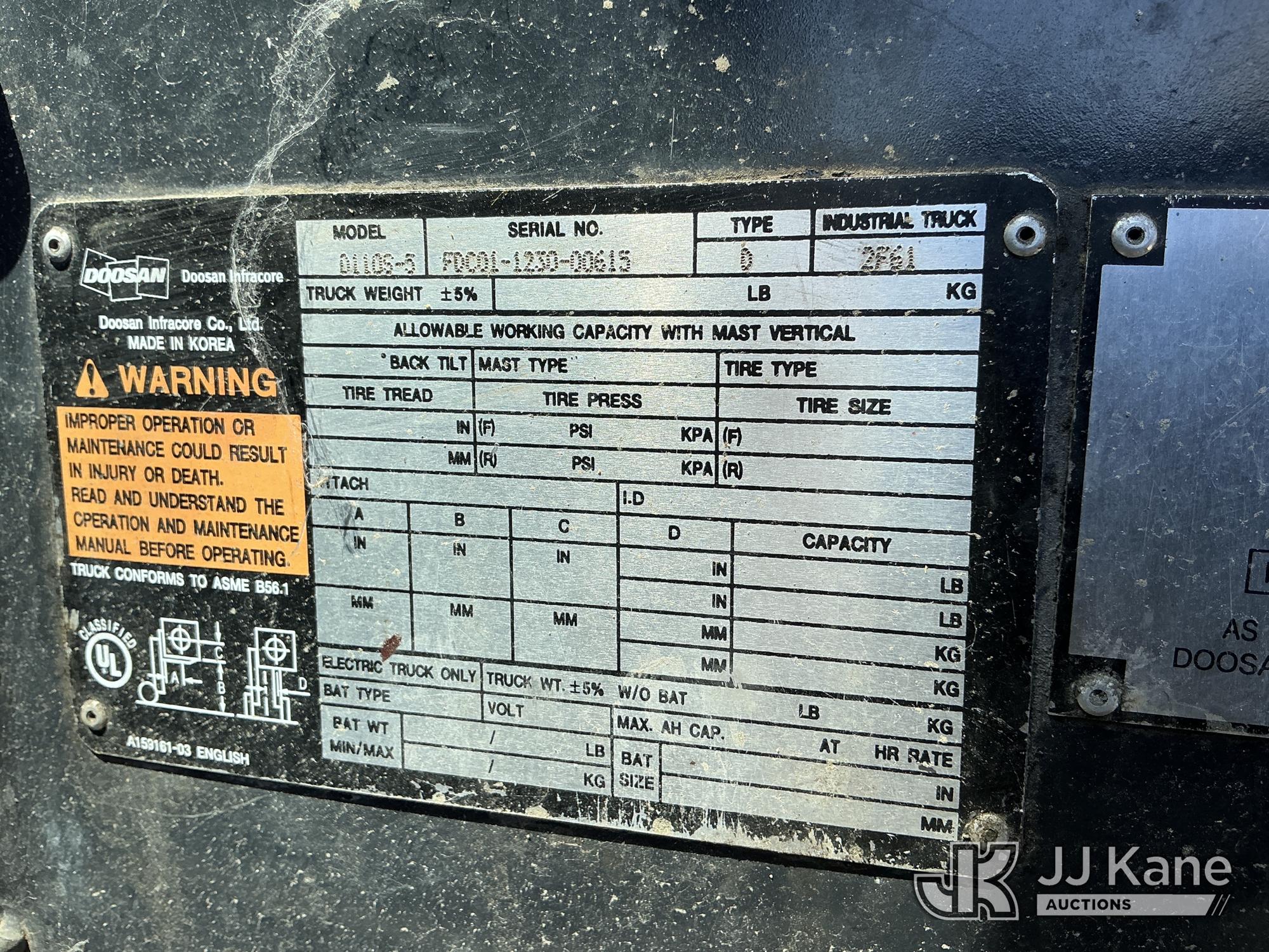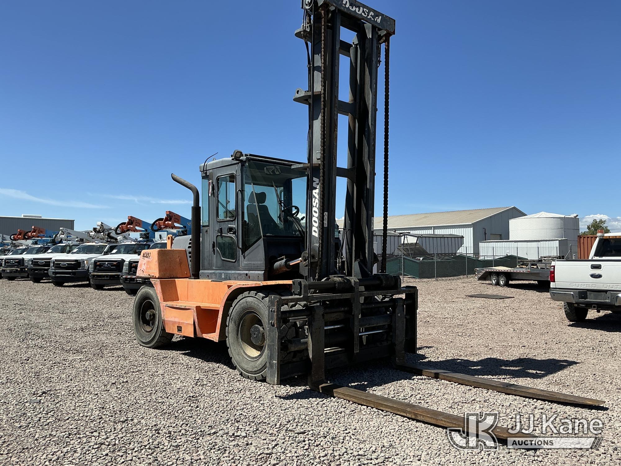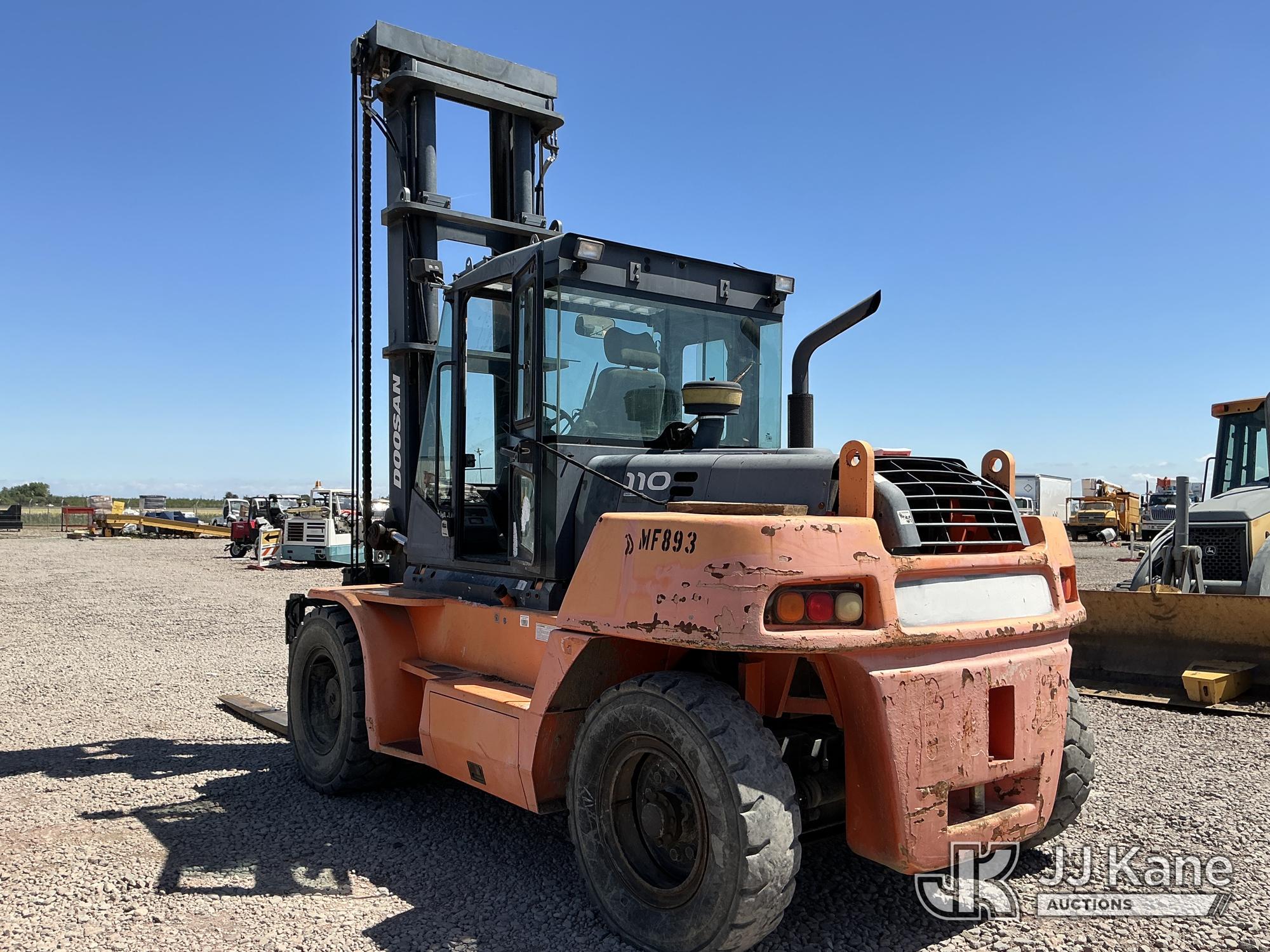 2011 Doosan D110S-5 Pneumatic Tired Forklift, s/n FDC01-1230-00615, 6-cyl, diesel, powershift, with 24,000 lb cap, side shift, 2 Stage Mast, 8ft Forks & EROPS, (Runs & Operates, Faulty Parking Brake) (Reads 6,524 hours) May be subject to ARB Regulations*
