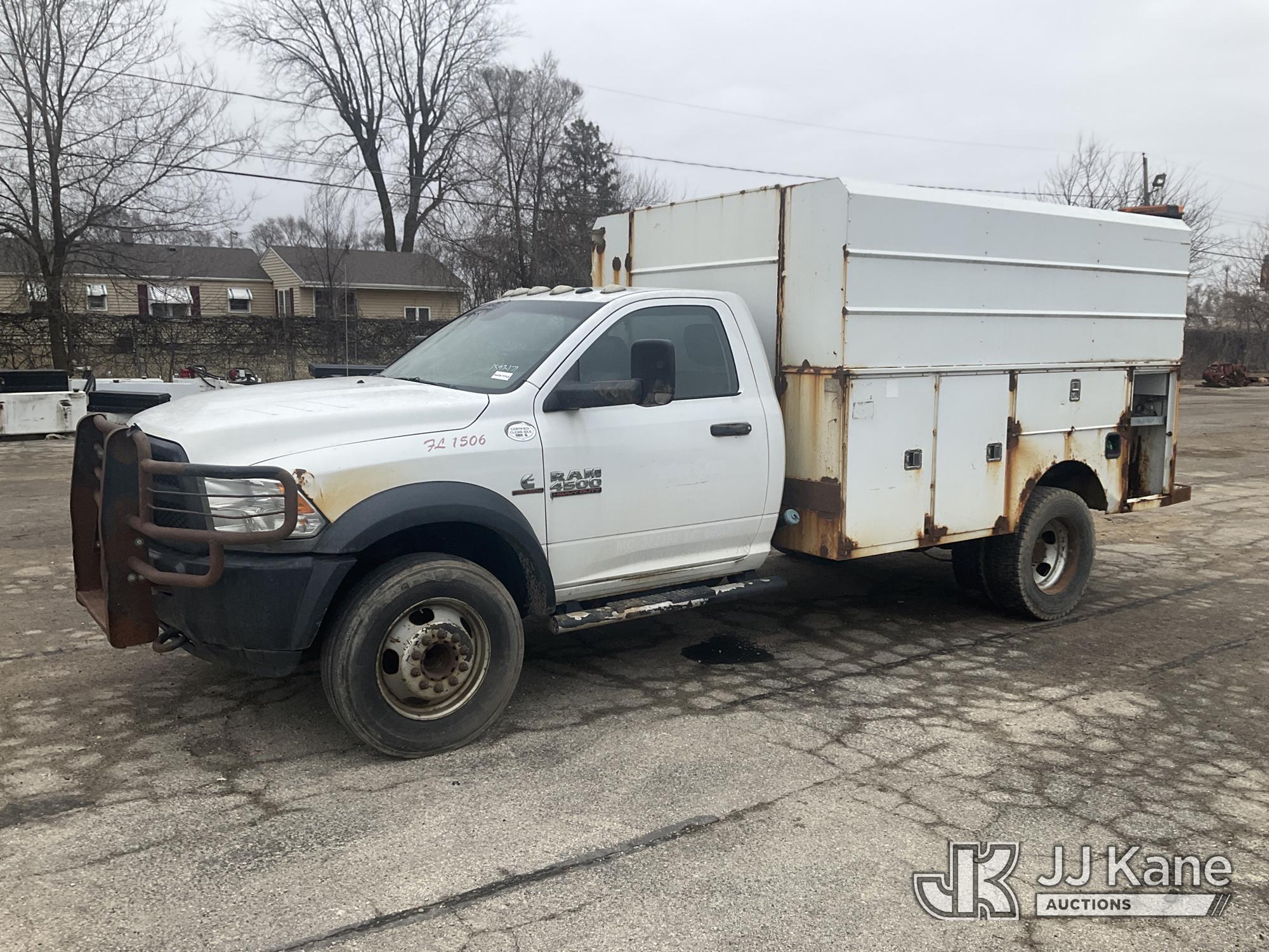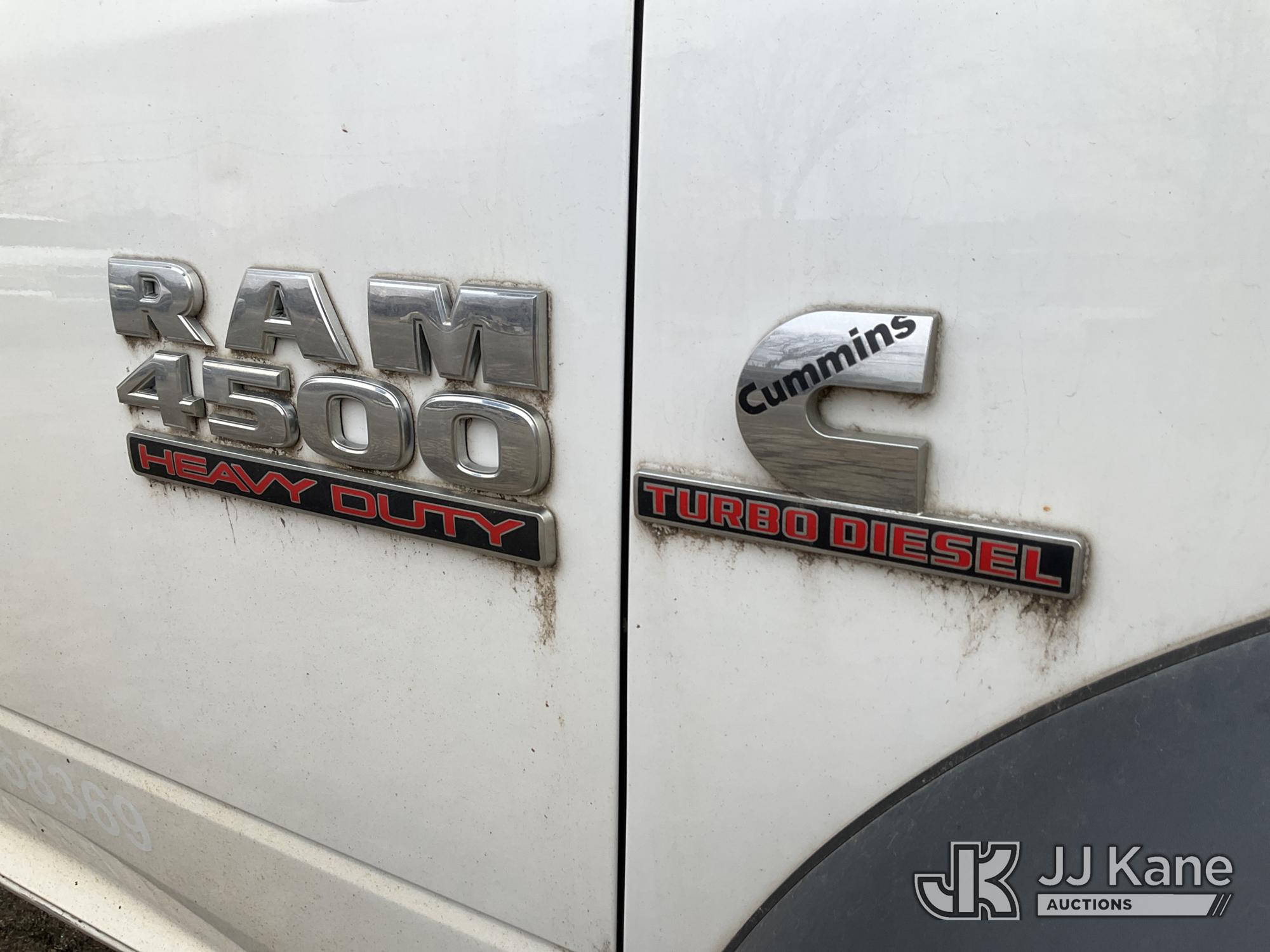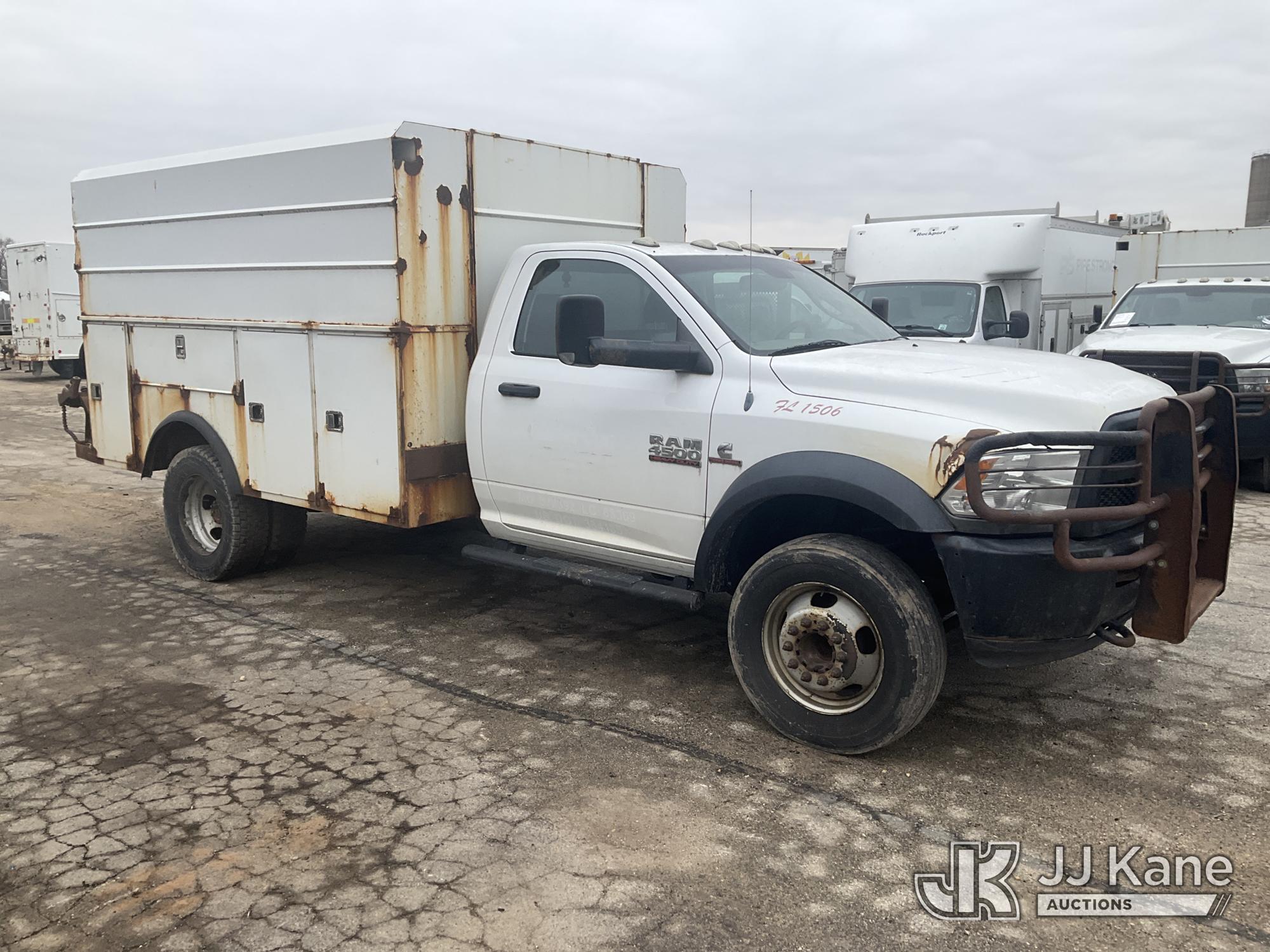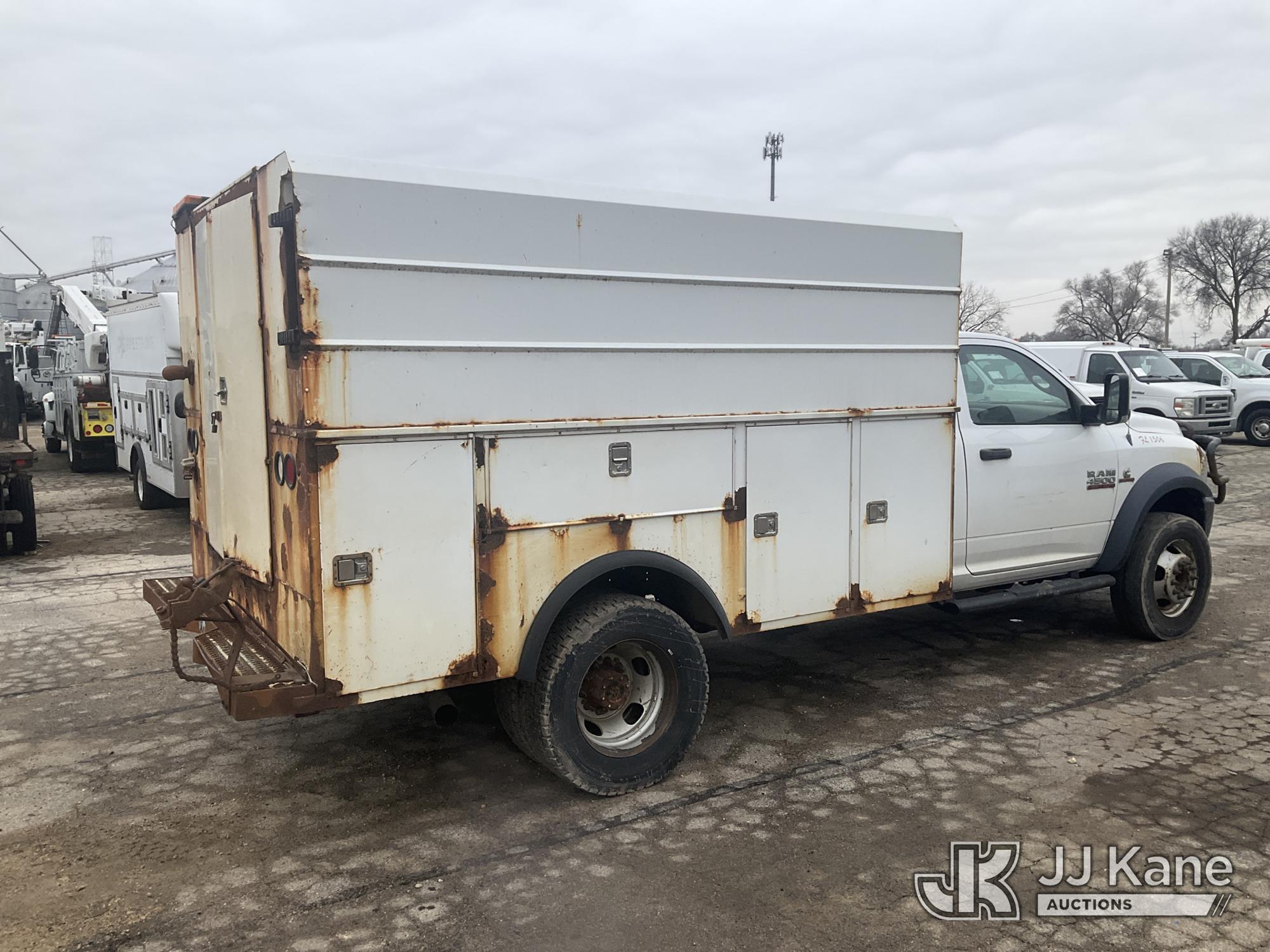 2013 RAM 4500 Enclosed Service Truck, s/n 3C7WRKBL8DG542499, 6.7L L6 OHV 24V TURBO DIESEL RWD, Auto, A/C, (184,641 miles) (Runs, Moves)(No Power Steering, Leaks Oil When Running-Condition Unknown, Body Damage, Service Body Rusty) This is a Titled Item*