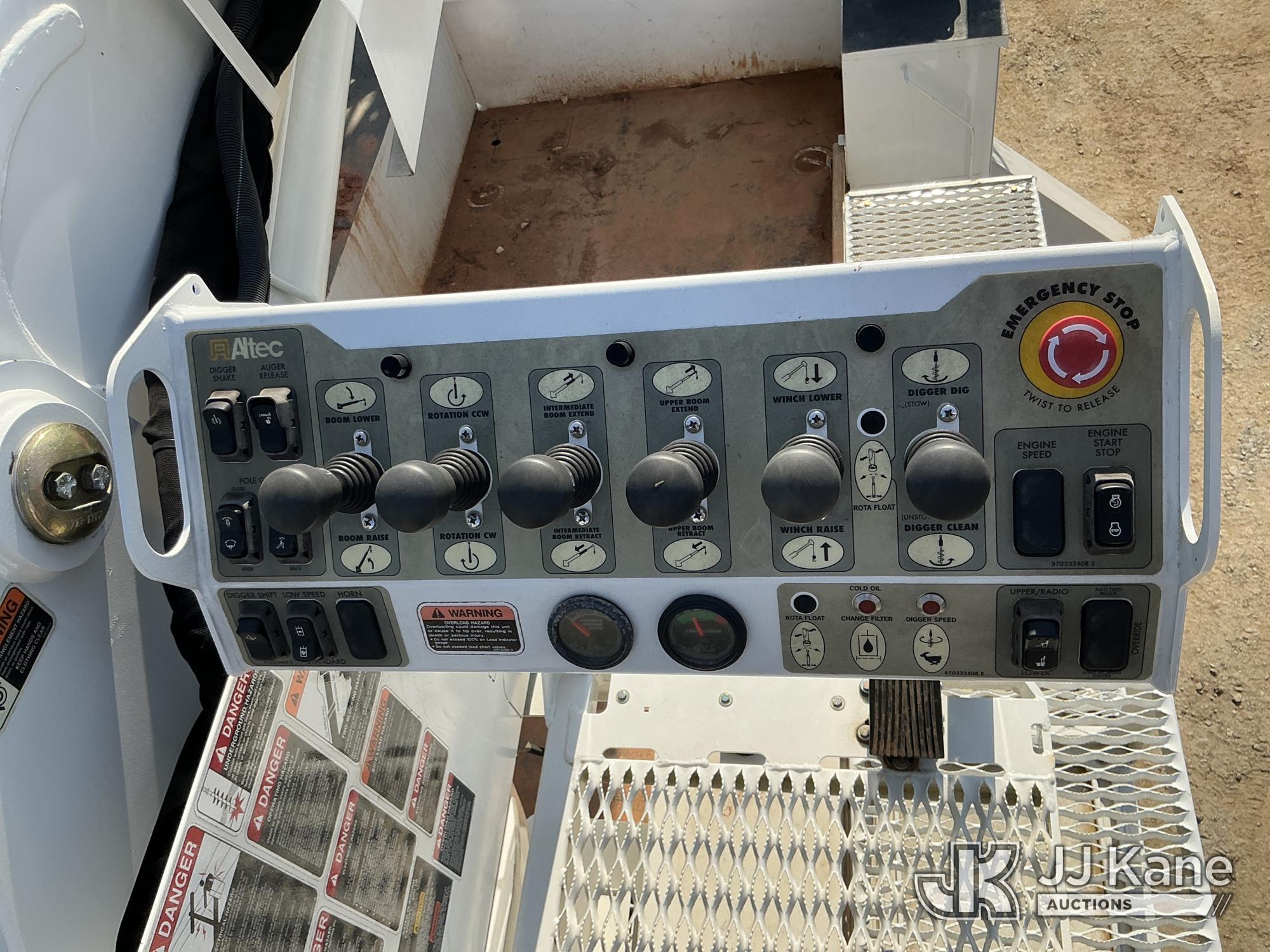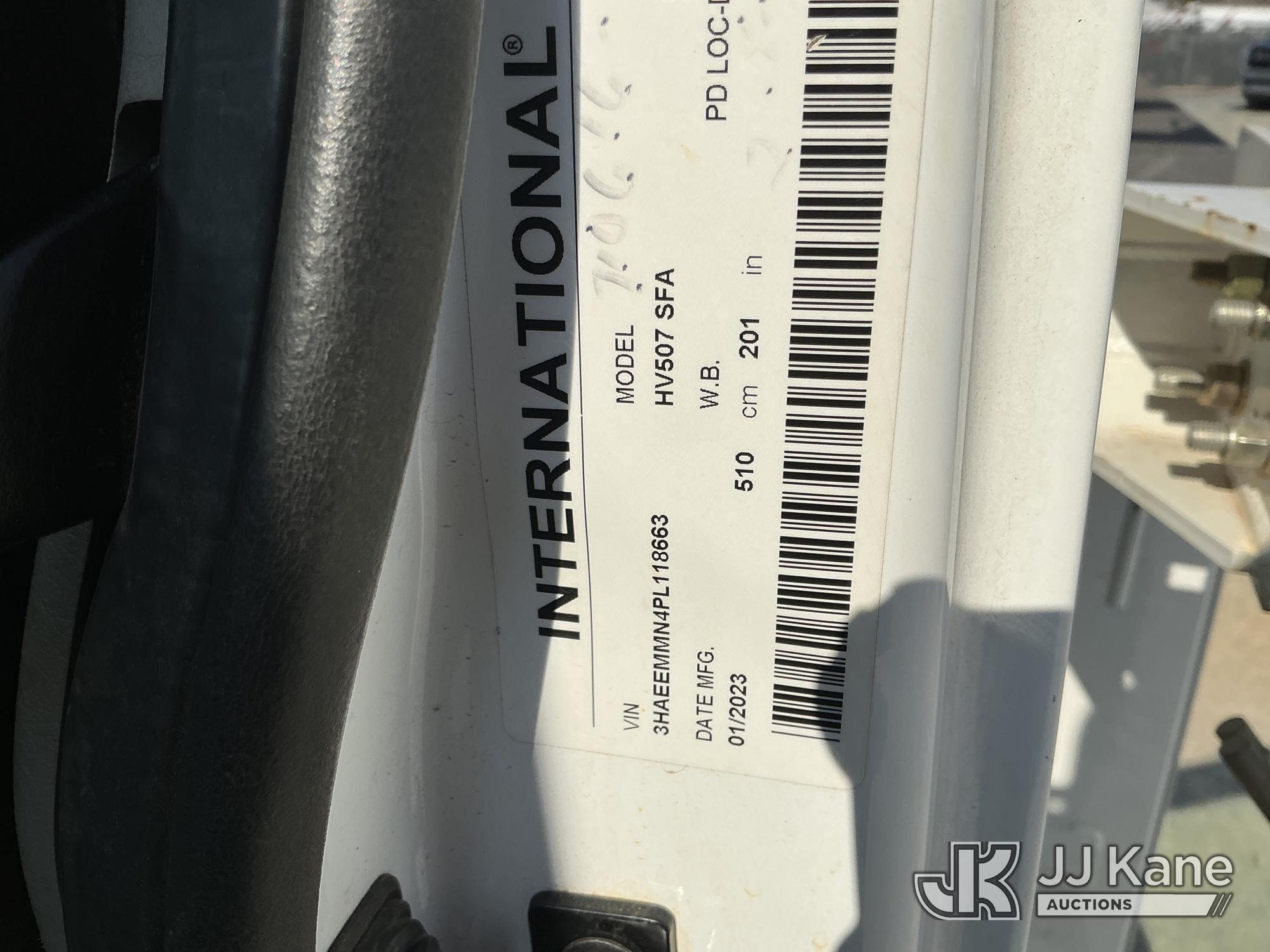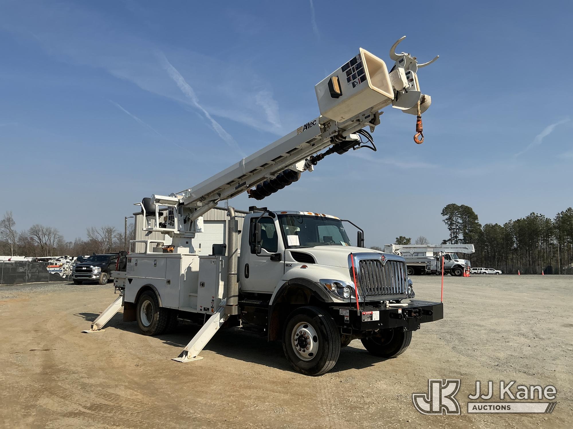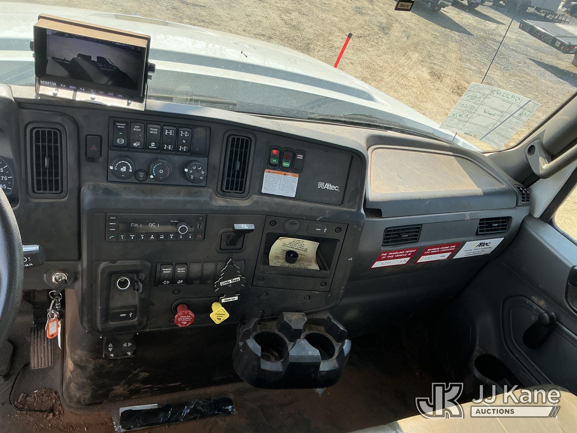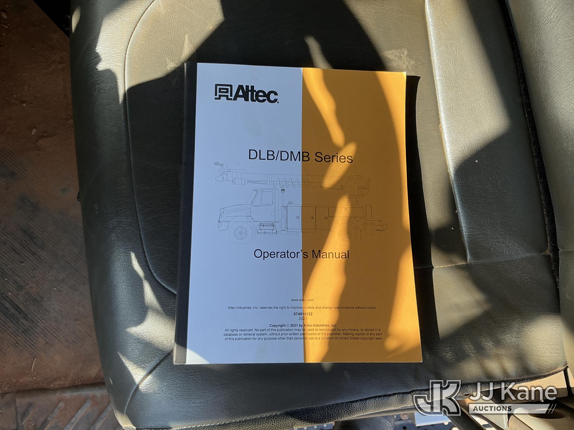 Altec DM47B-TR, 23,790 Lb Digger Derrick s/n 0122FR6837, with 47ft sheave height, 2spd digger, heel winch, pin on bucket, upper controls, pole grabs, riding console, wireless remote, rear mounted on 2023 International HV507 4X4 Utility Truck, Cummins 6.7L diesel, Auto, A/C, with front winch , (9,365 miles) (Runs, Moves & Upper Operates ) This is a Titled Item*