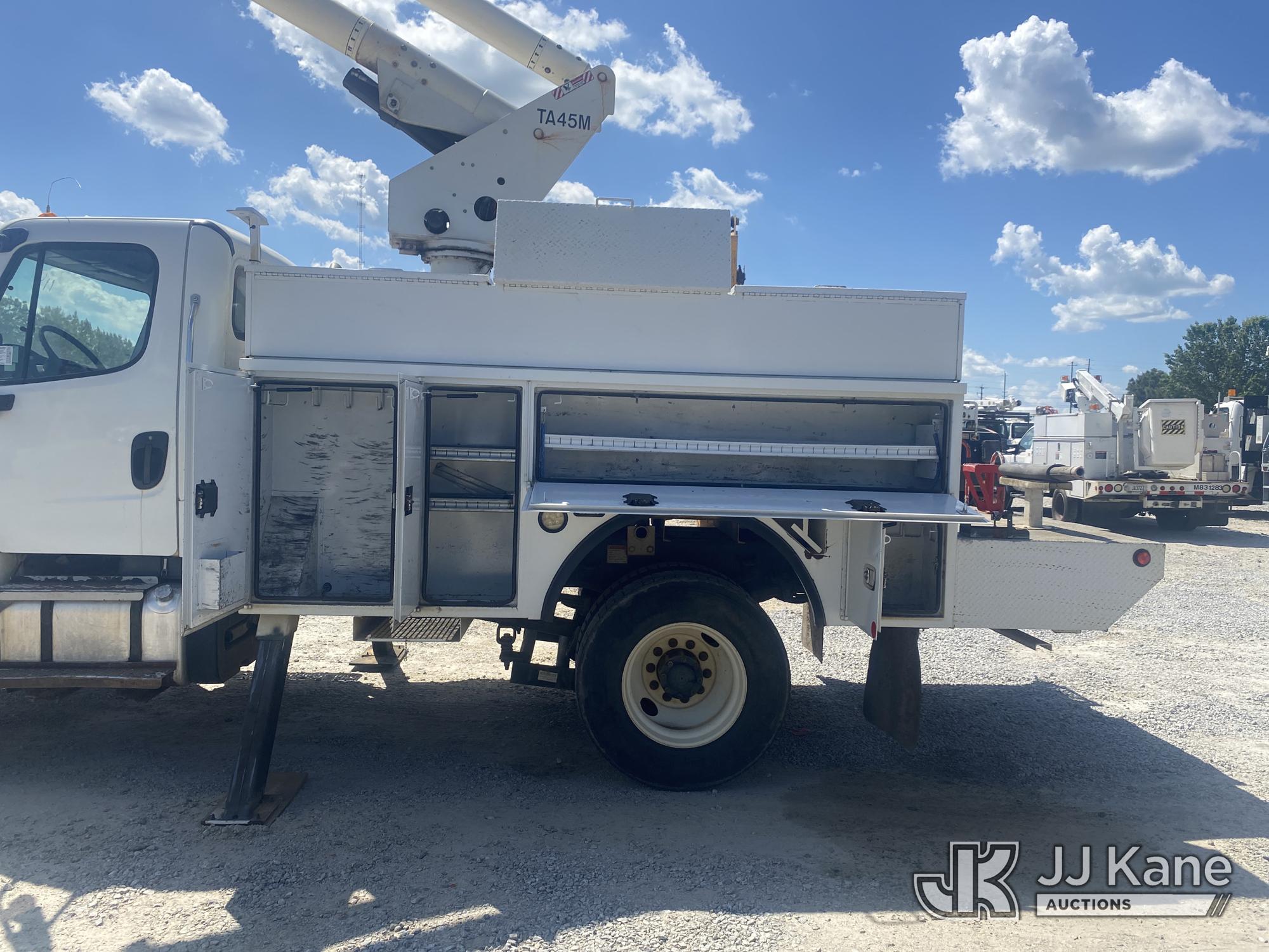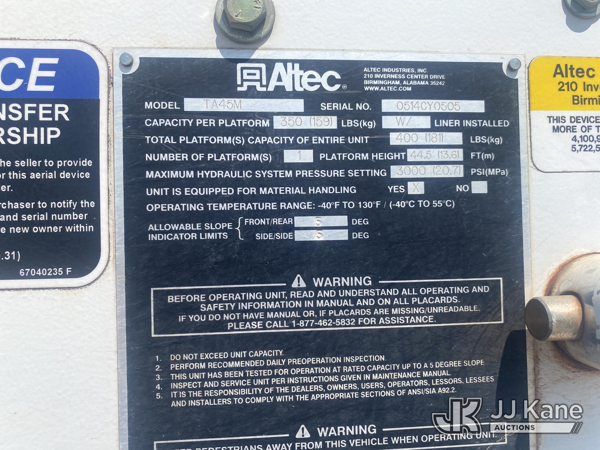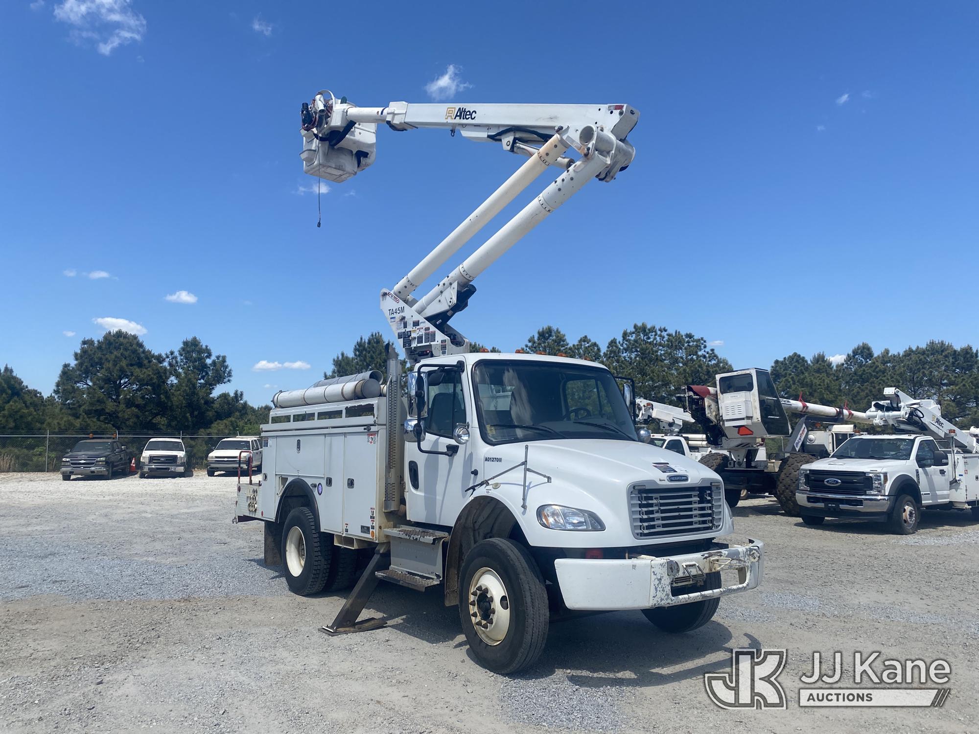 Altec TA45M, 50 ft, Articulating & Telescopic Material Handling Bucket Truck s/n 0514CY0505, with single-man bucket & 2 hyd outriggers, mounted behind cab on 2014 Freightliner M2 106 Utility Truck, 6.7L L6 Diesel, 4X2, Auto, A/C, (266,256 miles) (GA Power Unit) (Runs, Moves & Upper Operates Intermentently, Flashing Check Engine Light On, Engine Shut Off While Operating Upper The manufacturer has notified JJ Kane that this equipment is subject to an open recall. CSN 643 TA Winch Brake Inspection The equipment should not be operated until this is addressed. Buyer is responsible for reviewing the recall notice and contacting the manufacturer to schedule the recommended corrective actions. Associated costs may be covered by the manufacturer in some cases.) (Reads 14,297 hours) This is a Titled Item*