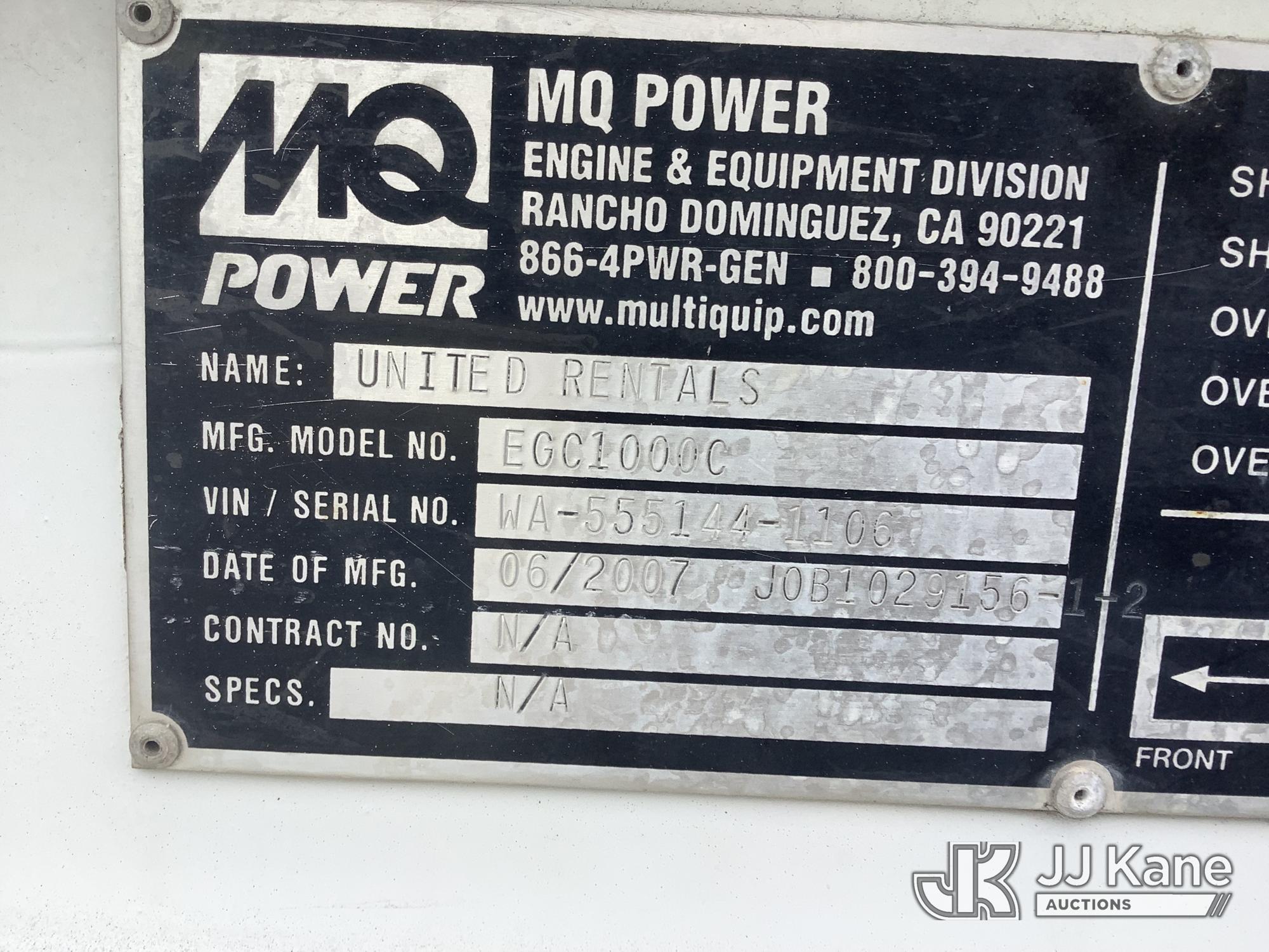 MQ Power Generator Container s/n WA-555144-1106, 12-cyl Diesel, with Model EGC1000C, Date MFG 06/2007, MagnaMax Generator Model 741RSL4045, 3 Phase 60 Hz 480 Volts 1030 KW, Onboard 947 Gal Diesel Tank, Insultech Acoustic Blanket Toughout, mounted on 2007 Chassis King Generator, (Not Running, Batteries Removed, Panels Off Of Rear Generator Assembly, Conditions Unknown) (Removal is by Appointment Only, Buyer MUST make a appointment prior to picking up, Buyer/Transporter Must have PAID IN FULL RELEASE. No onsite assistance available, Please Come prepared.) This is a Titled Item*