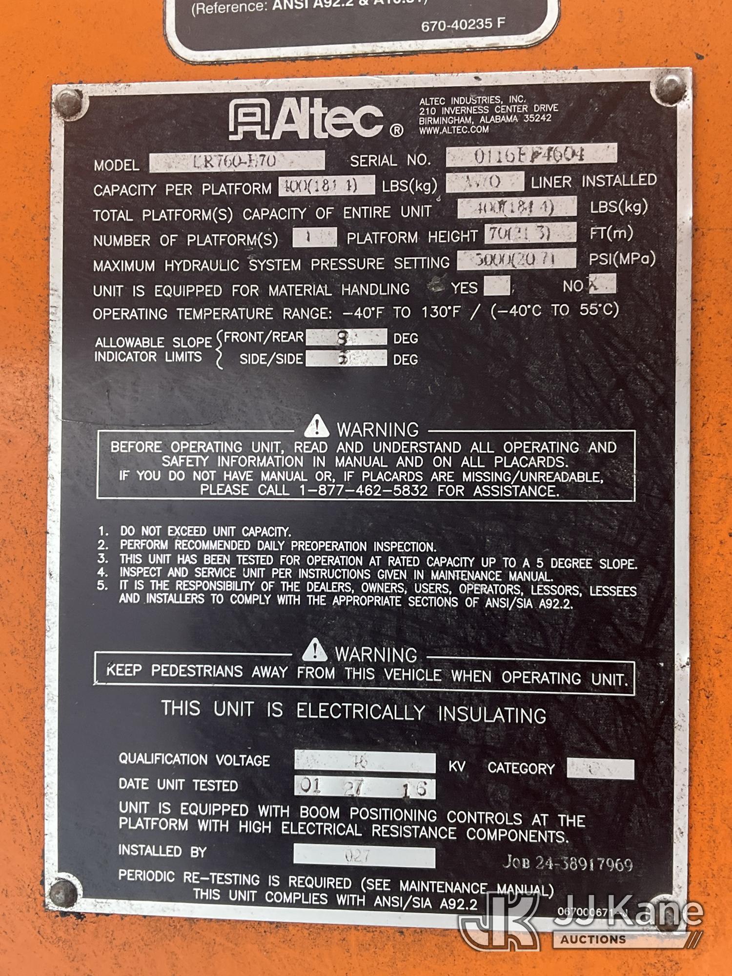 Altec LR760E70, 75 ft, Over-Center Elevator Bucket s/n 0116FF4604, with Single Man Bucket & 2 Outriggers , mounted behind cab on 2016 Freightliner M2 106 Chipper Dump Truck, 6.7L diesel, 6-spd, with 11ft body, (120,420 miles) (Not Running, Condition Unknown, Upper Condition Unknown, Seller States: Bad Engine, Must Tow, Buyer Must Load) This is a Titled Item*