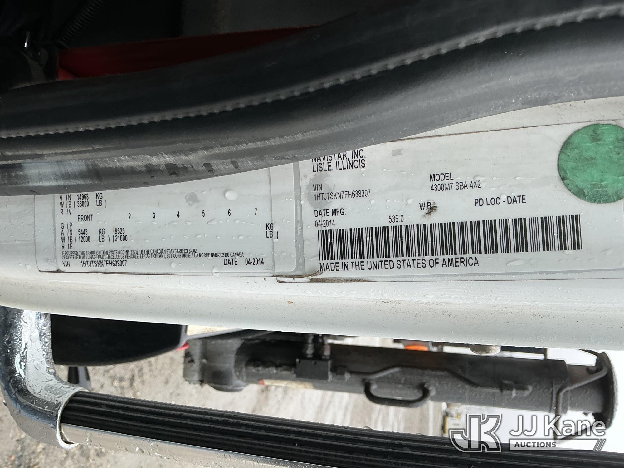 Effer 130/2S, 4,685 Lb Knuckleboom Crane with 33'7" ft. reach, 4-section hyd boom, & 2 hyd outriggers, mounted behind cab on 2015 International DuraStar 4300 Hooklift Truck, MaxxForce 7, 6.4L 4X2, diesel, Auto, A/C, with Stellar hooklift, 10.5 ft. body, (66,126 miles) (Runs & Moves) (PTO Not Engaging, No Response From Dump & Crane Controls, Upper & Dump Conditions Unknown, Missing Upper ID Plate) (Reads 7,367 hours) This is a Titled Item*
