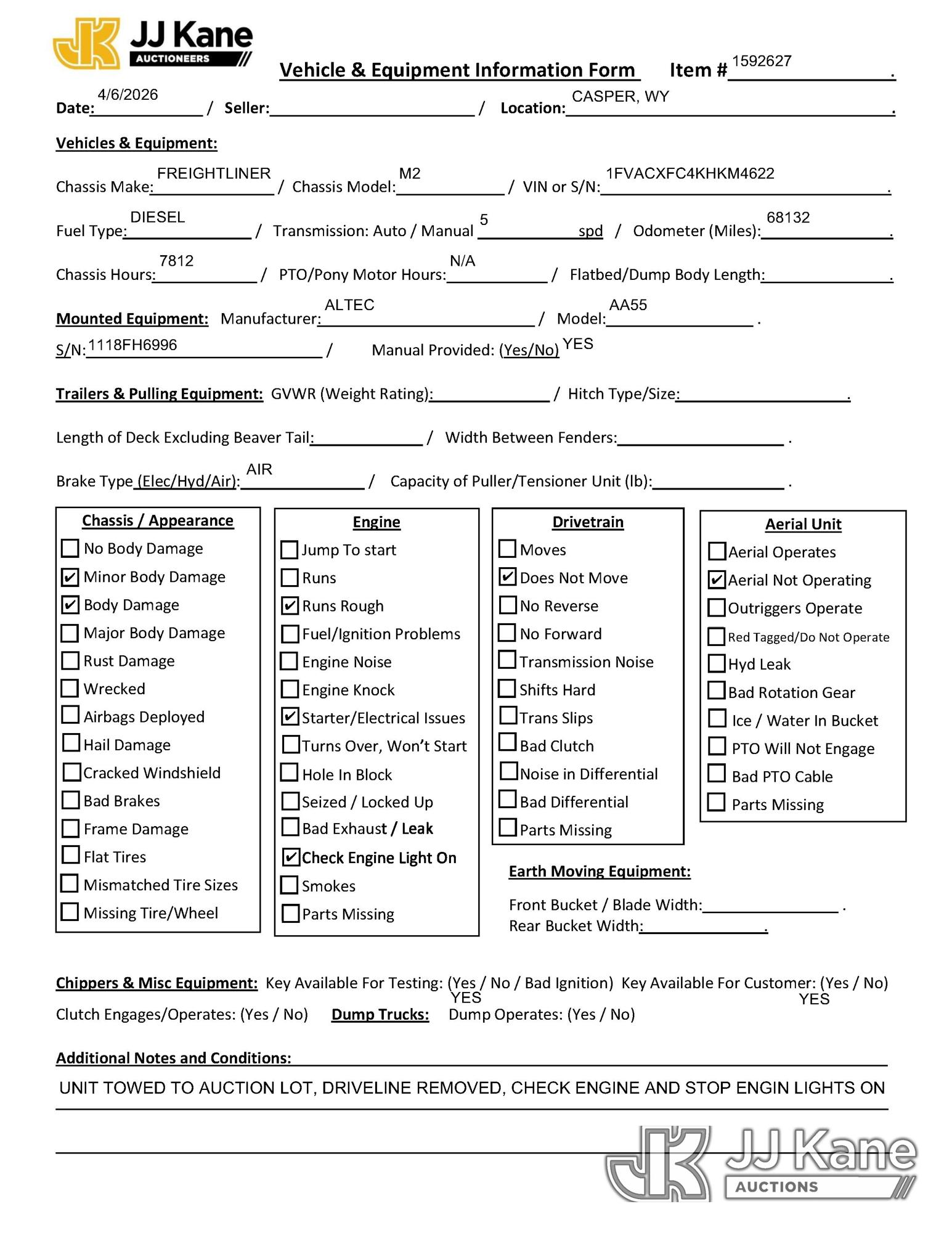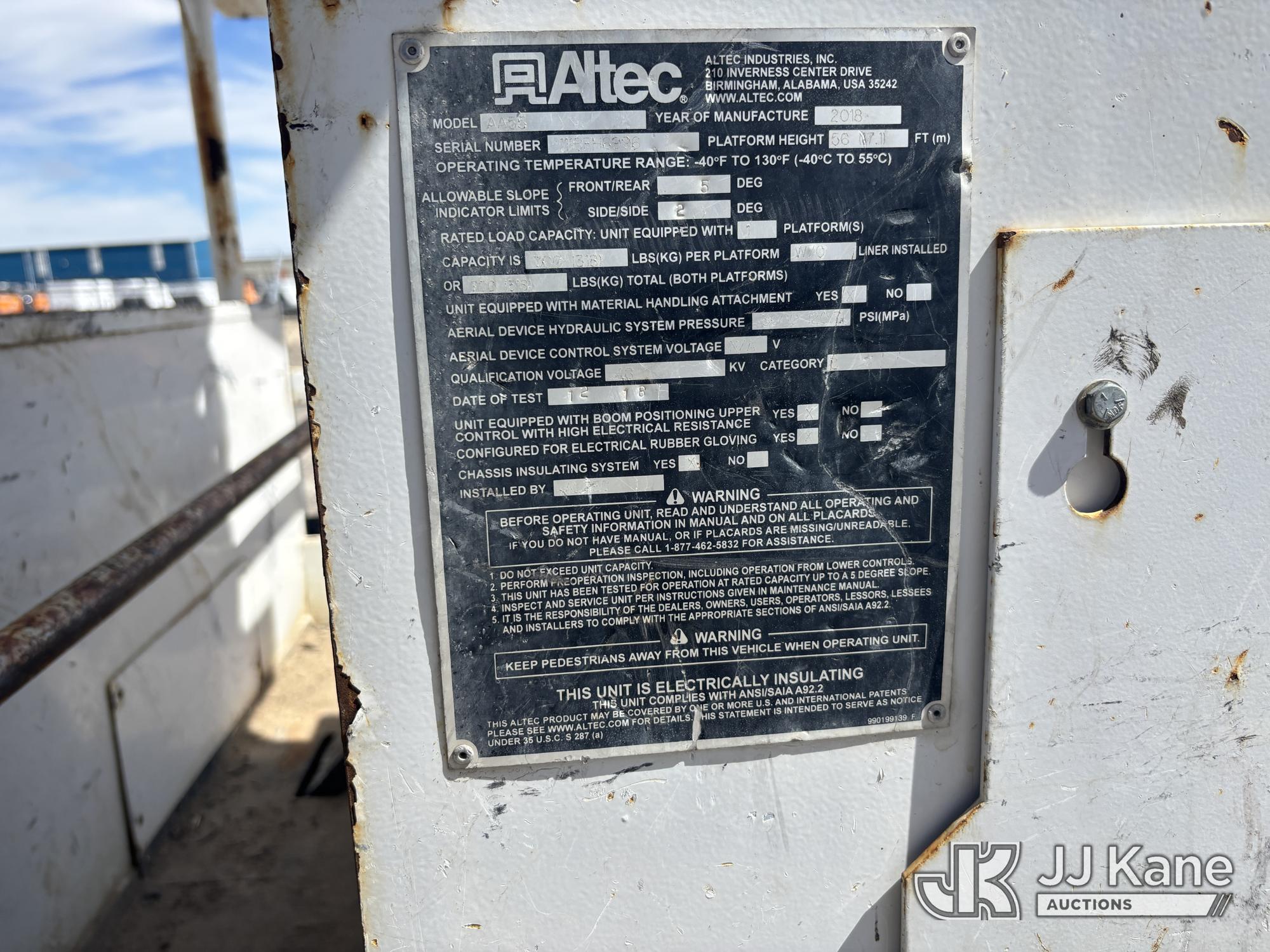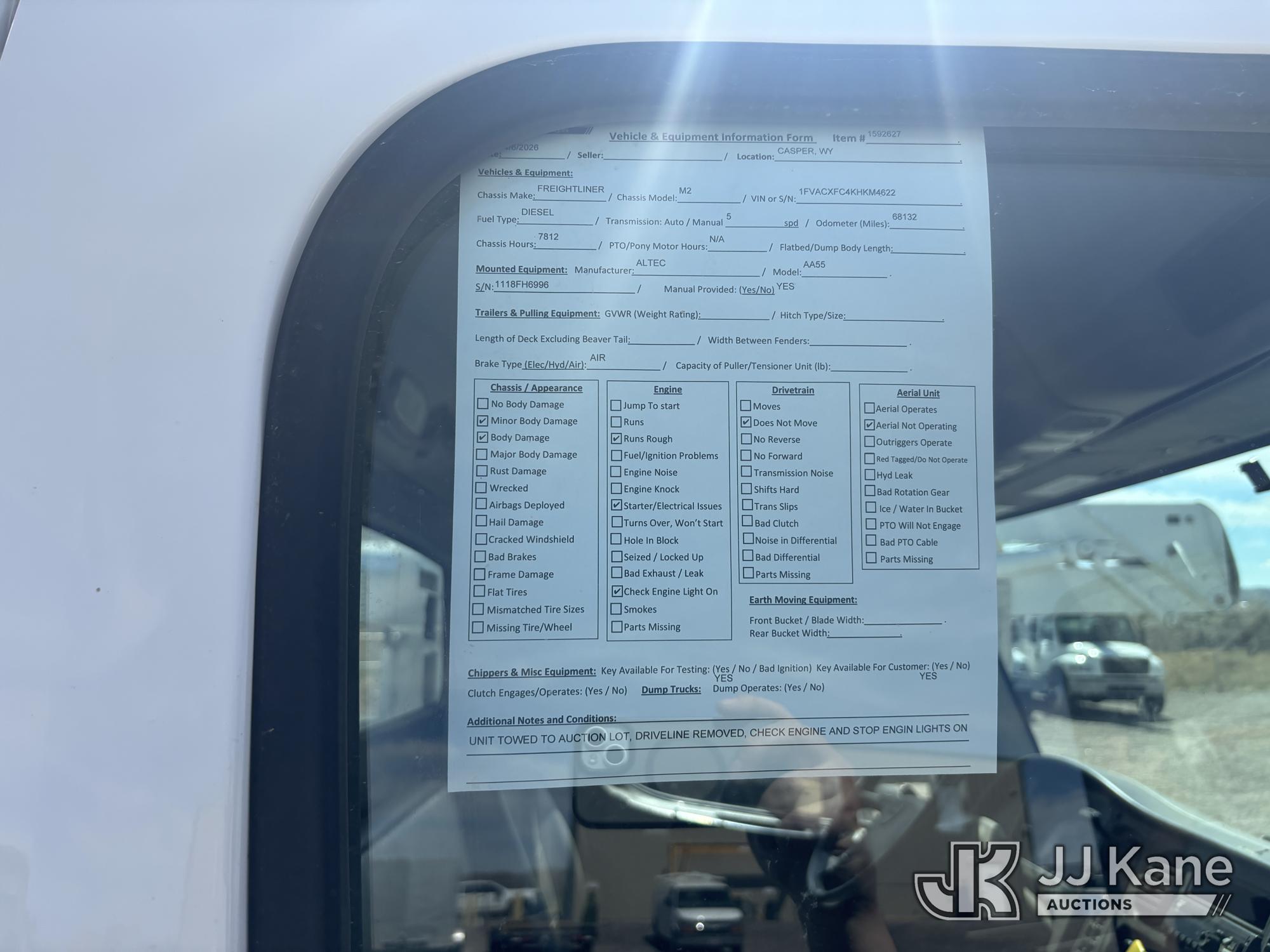 Altec AA55-MH, 60 ft, Material Handling Bucket Truck s/n 1118FH6996, with two man bucket, rear mounted on 2019 Freightliner M2 Utility Truck, 6.7L diesel, Auto, A/C, (68,132 miles) (Runs Rough, Does Not Move - Driveline Removed, Starter/Electrical Issues, Check Engine Lights On, Body Damage) This is a Titled Item*