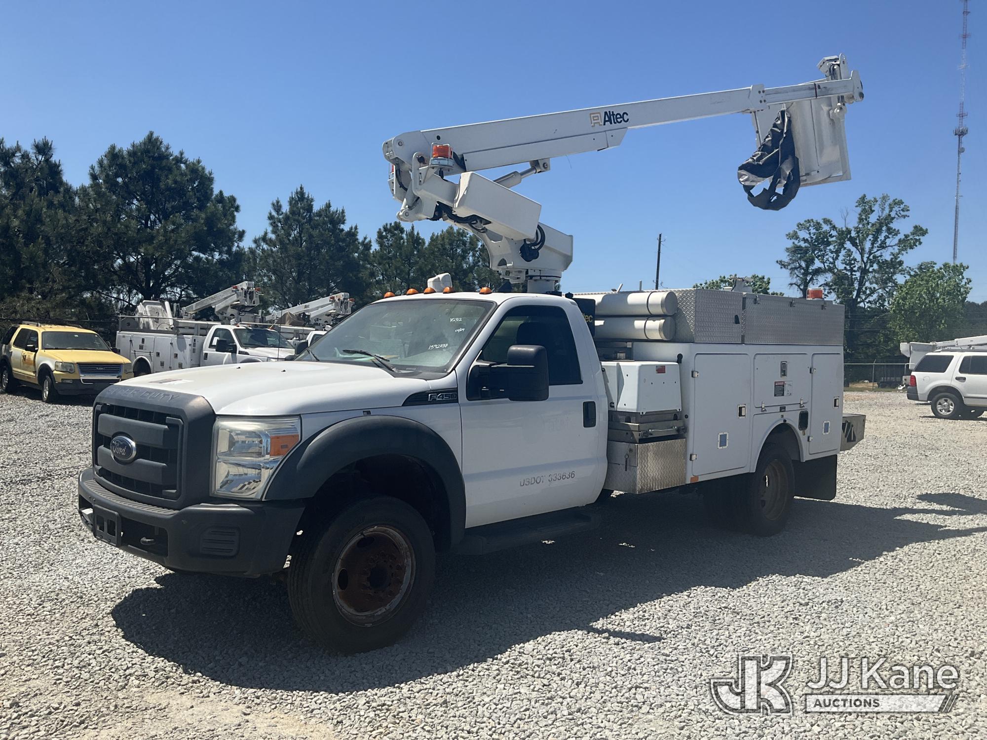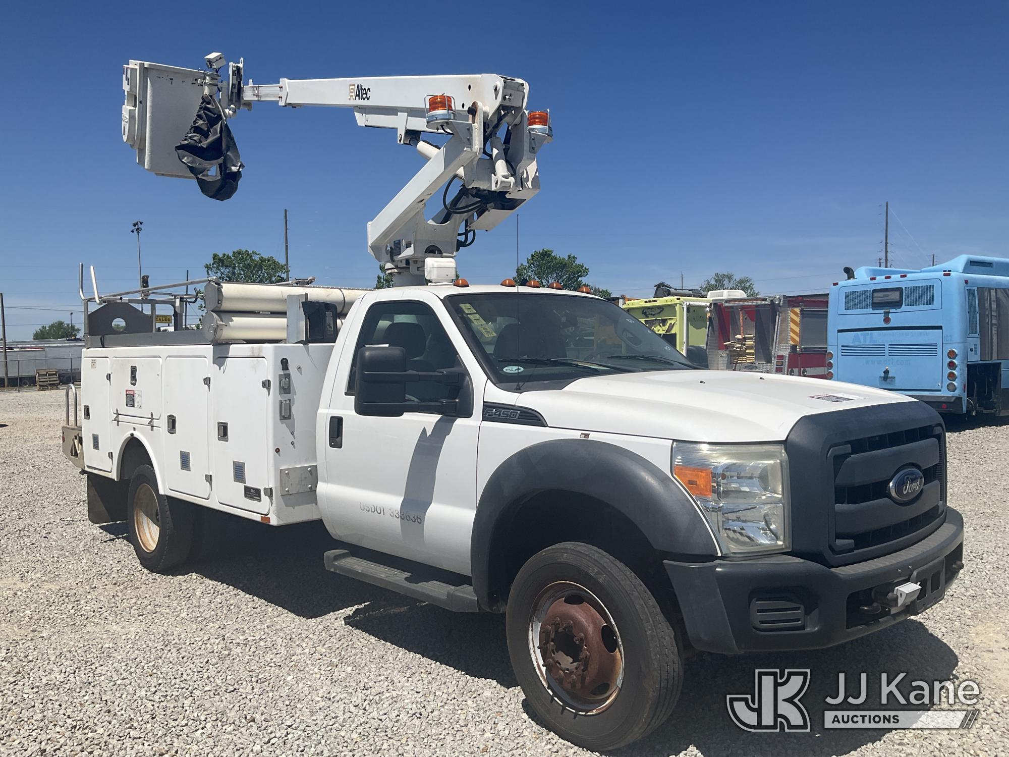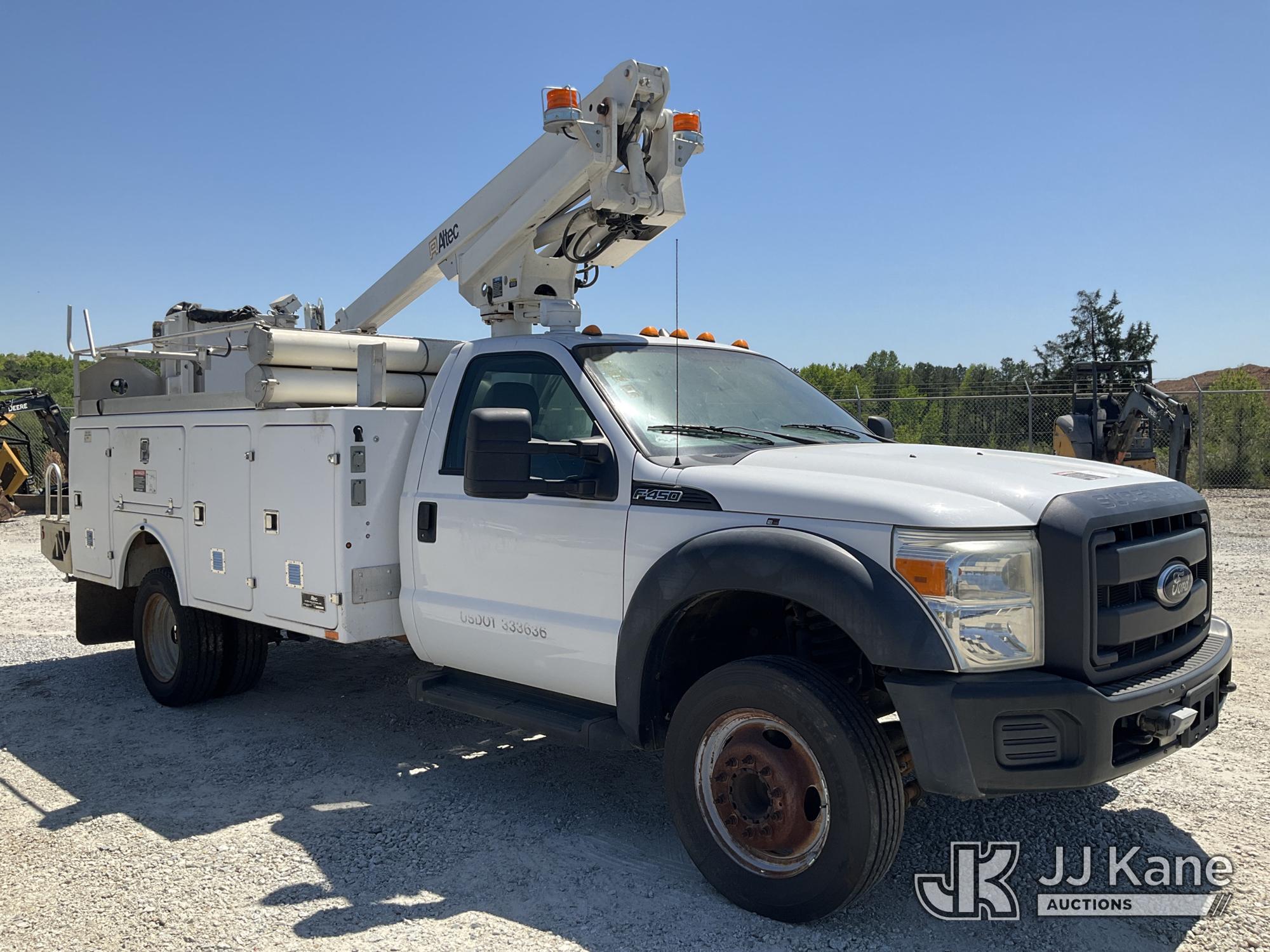 Altec AT200A, 35 ft, Telescopic Non-Insulated Bucket Truck s/n 1212BV19154, with single-man bucket, mounted behind cab on 2012 Ford F450 Service Truck, 10-cyl gas, Auto, A/C, with Onan Generator, (169,060 miles) (Runs, Moves & Upper Operates) (Jump To Start) This is a Titled Item*