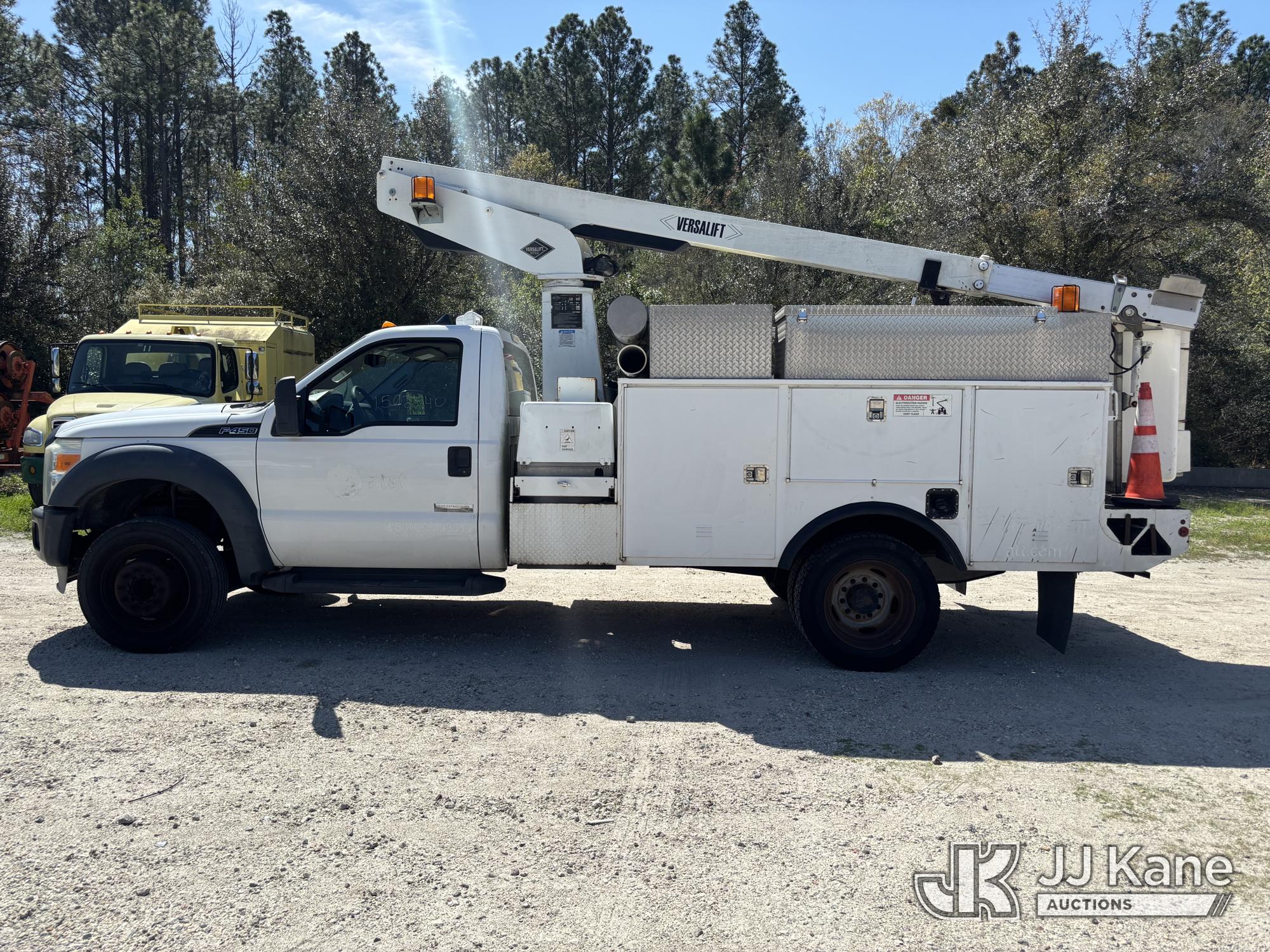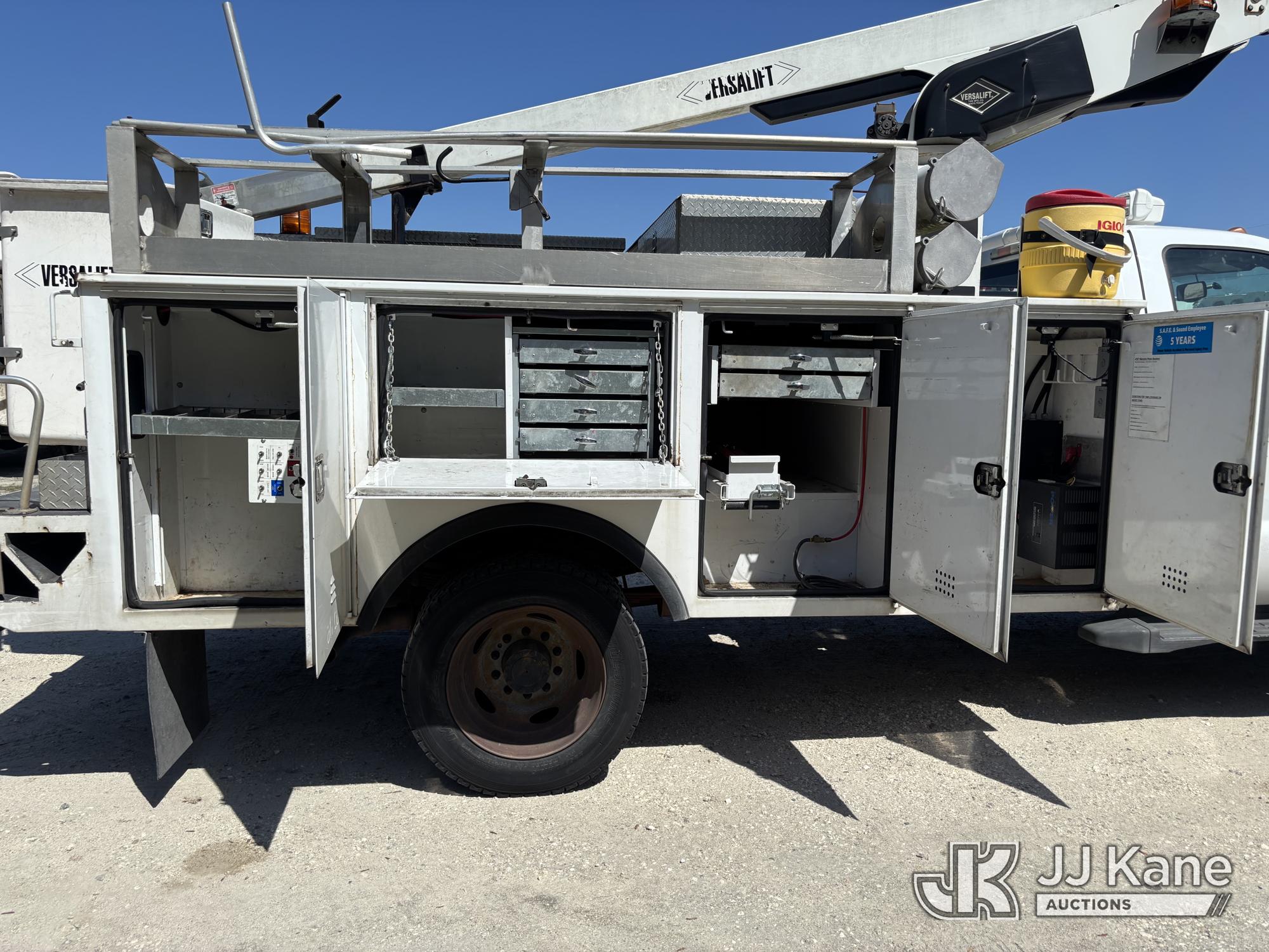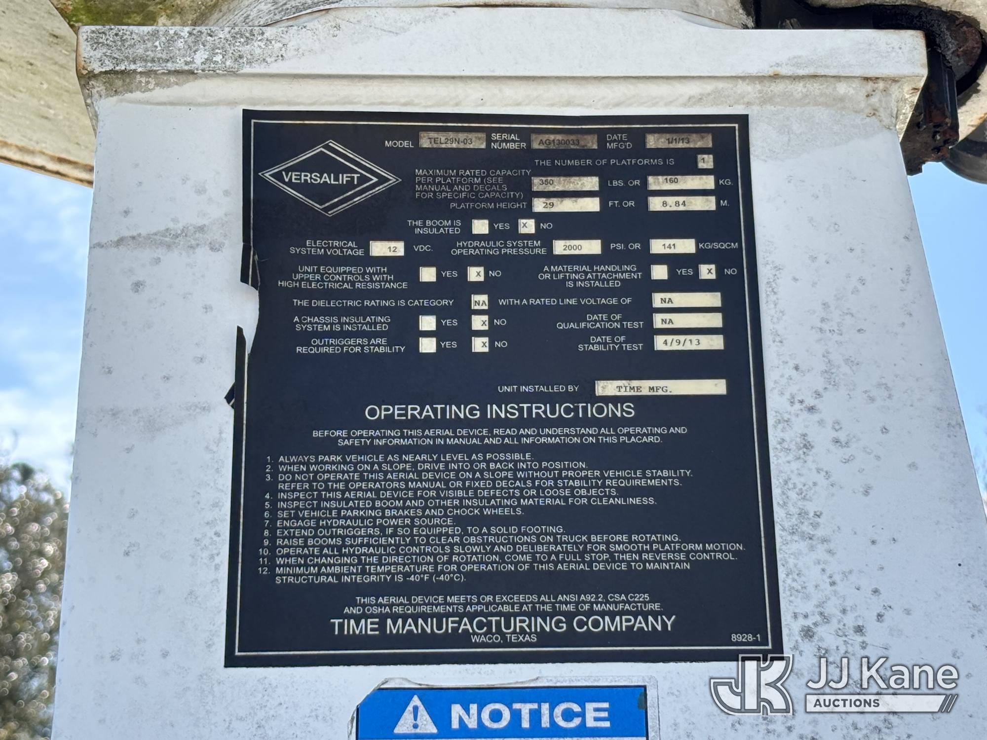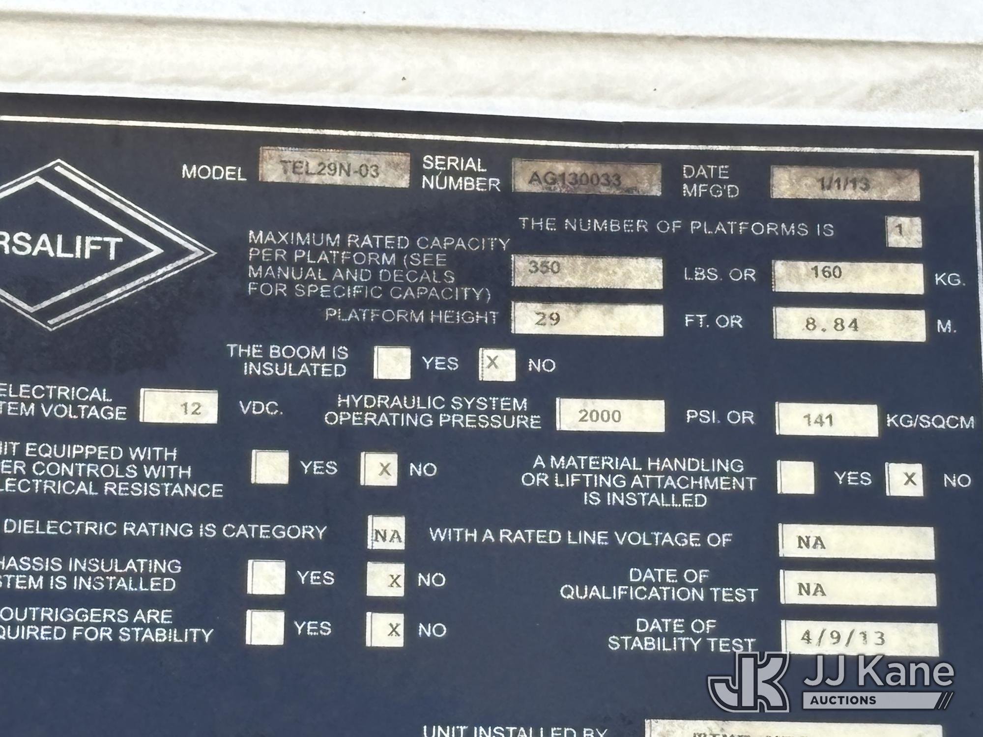 Versalift TEL29N-03, 34 ft, Telescopic Non-Insulated Bucket Truck s/n AG130033, with single-man bucket, mounted behind cab on 2013 Ford F-450 SD Service Truck, 10-cyl gas, RWD, Auto, A/C, (149,777 miles) Element Lease Return (Runs, Moves, & Operates With Jump) (Body & Paint Damage) This is a Titled Item*