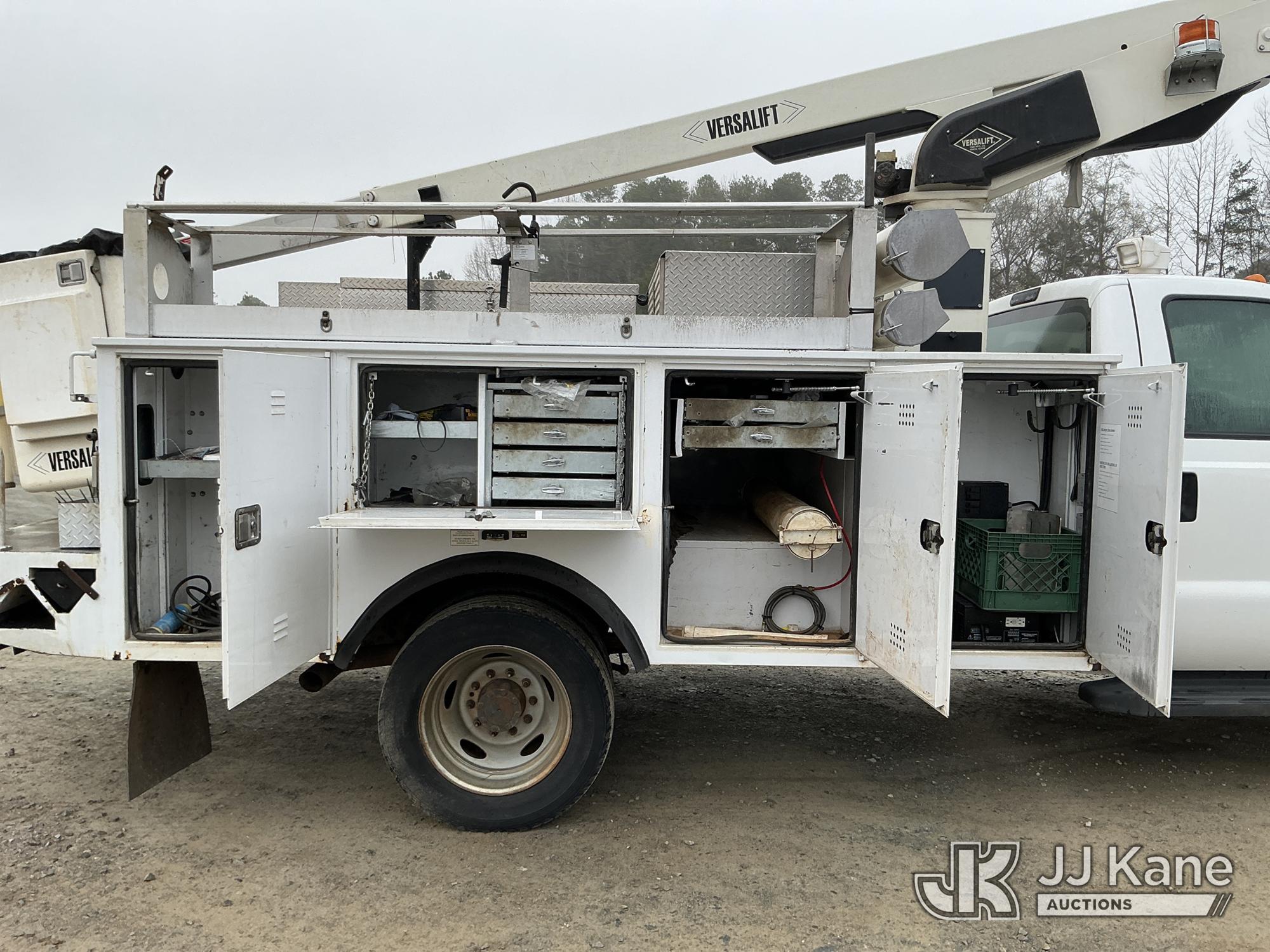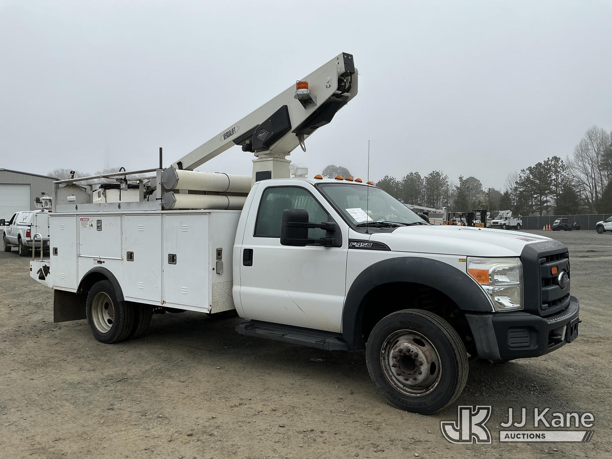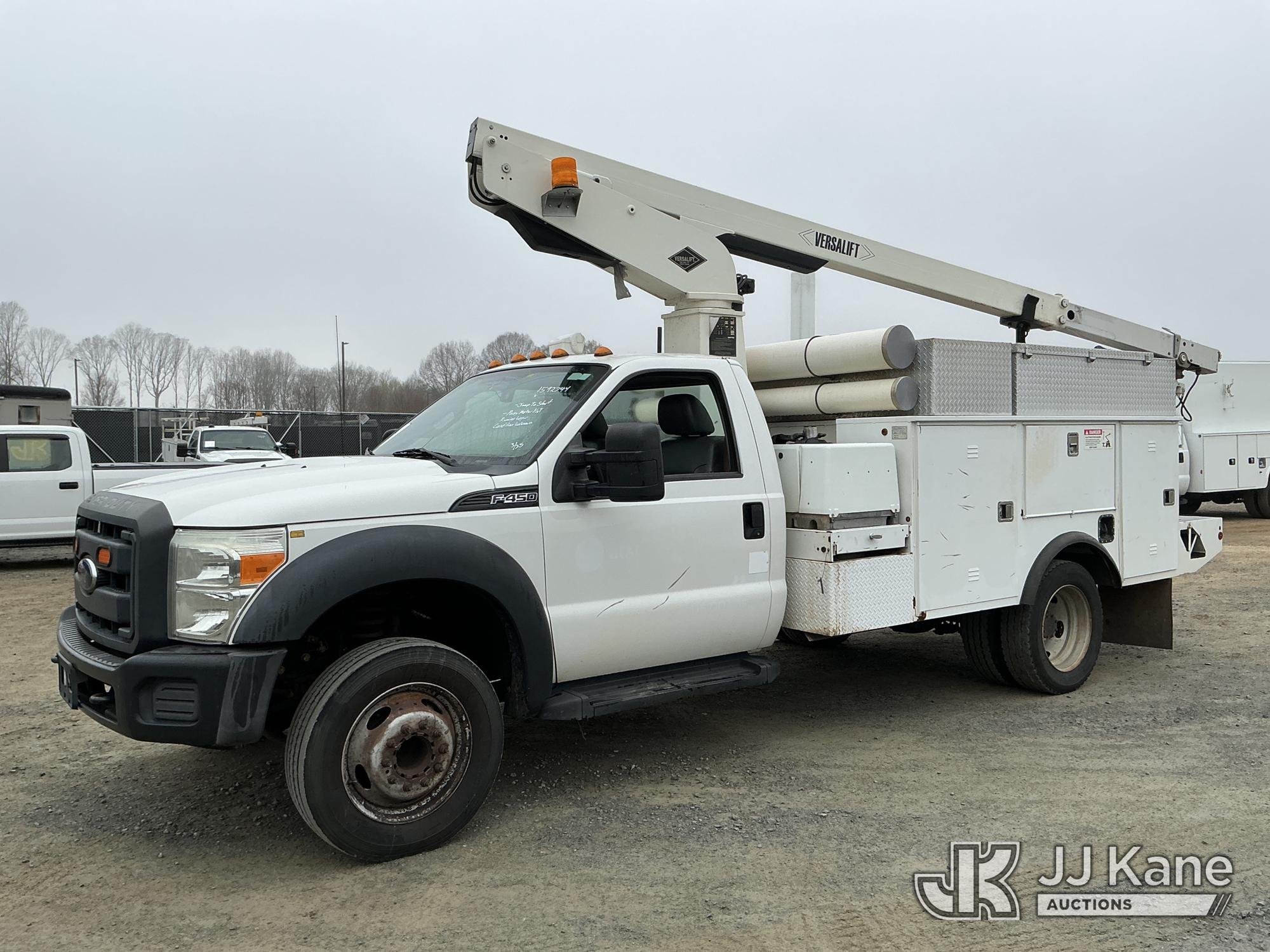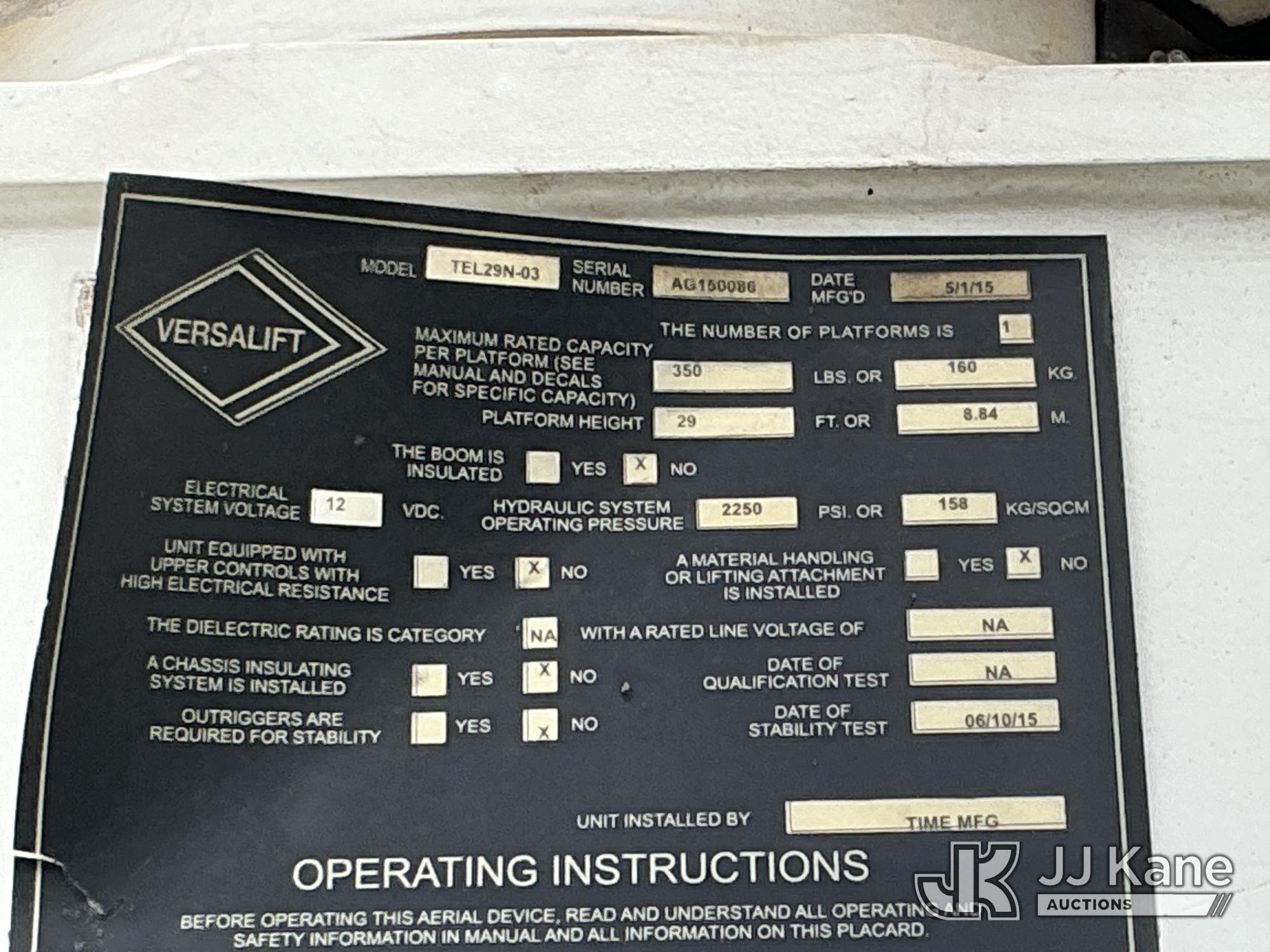 Versalift TEL29N03, 34 ft, Telescopic Non-Insulated Bucket Truck s/n AG150086, with single-man bucket, mounted behind cab on 2015 Ford F450 Service Truck, 10-cyl gas, Auto, A/C, with Cummins Onan pony motor , (140,284 miles) (Runs & Moves) (Pony Motor Not Running, Upper Condition Unknown, Jump To Start, Check Engine Light On) This is a Titled Item*