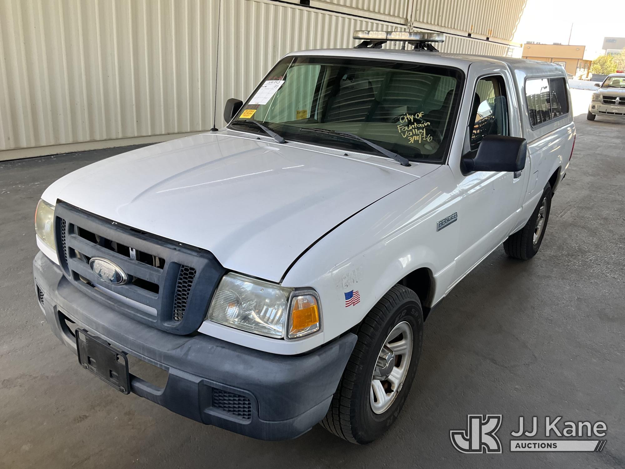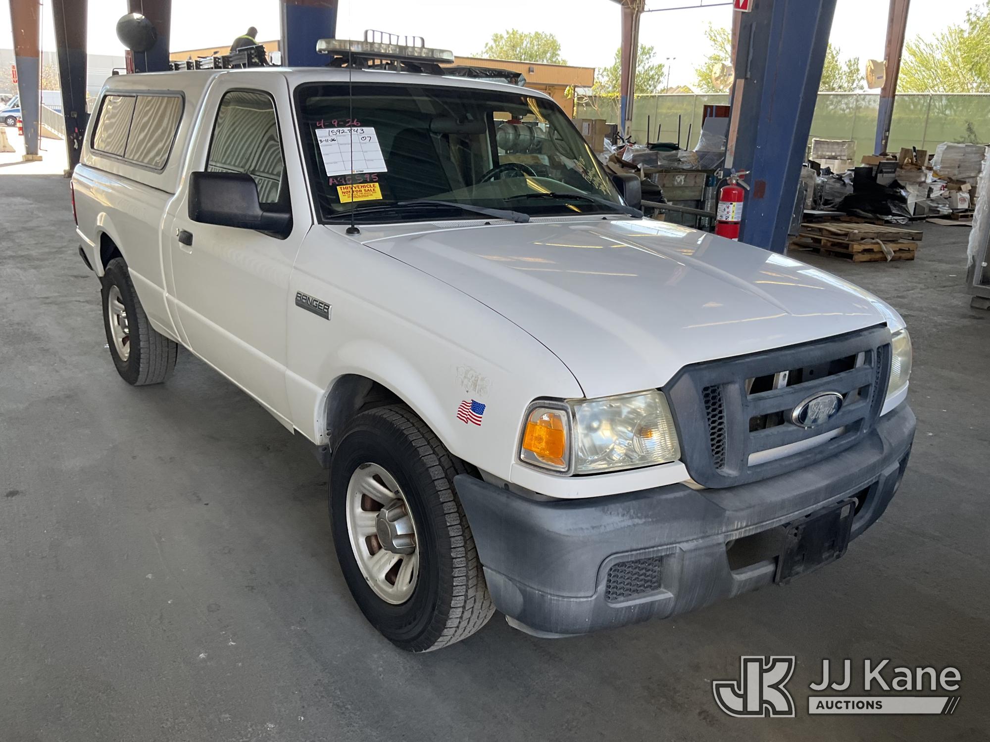 2007 Ford Ranger XL 2WD Pickup Truck, s/n 1FTYR10U67PA90595, 3.0L V6 OHV 12V RWD, GAS, 5-Speed Automatic, A/C, with Camper Shell, (65,233 miles) (Runs & Moves) This is a Titled Item*