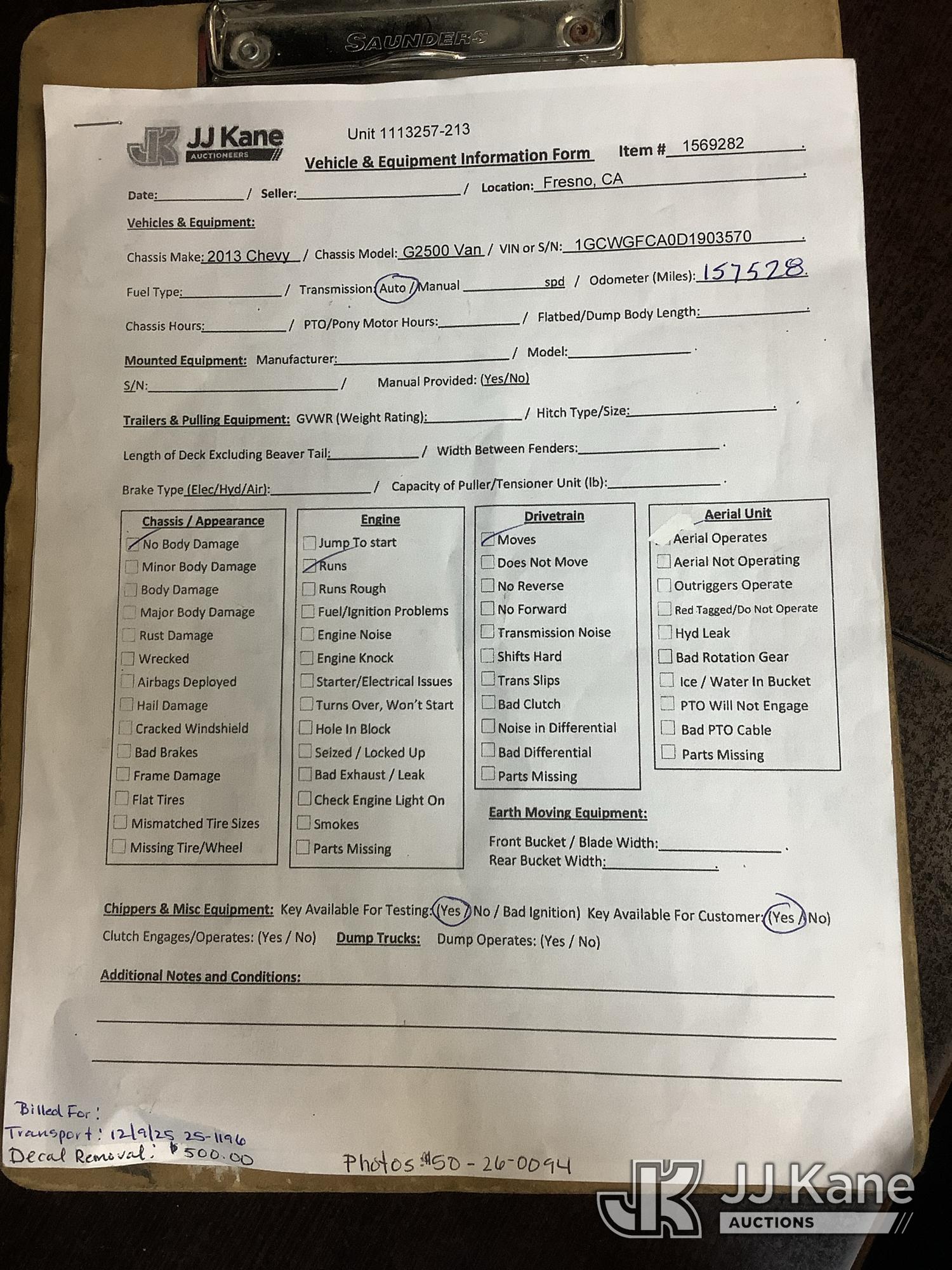 2013 Chevrolet Express 2500 Cargo Van, 8-cyl gas, 6-Speed Automatic, A/C, (157,528 miles (unverified)) (Runs & Moves) This is a Titled Item*