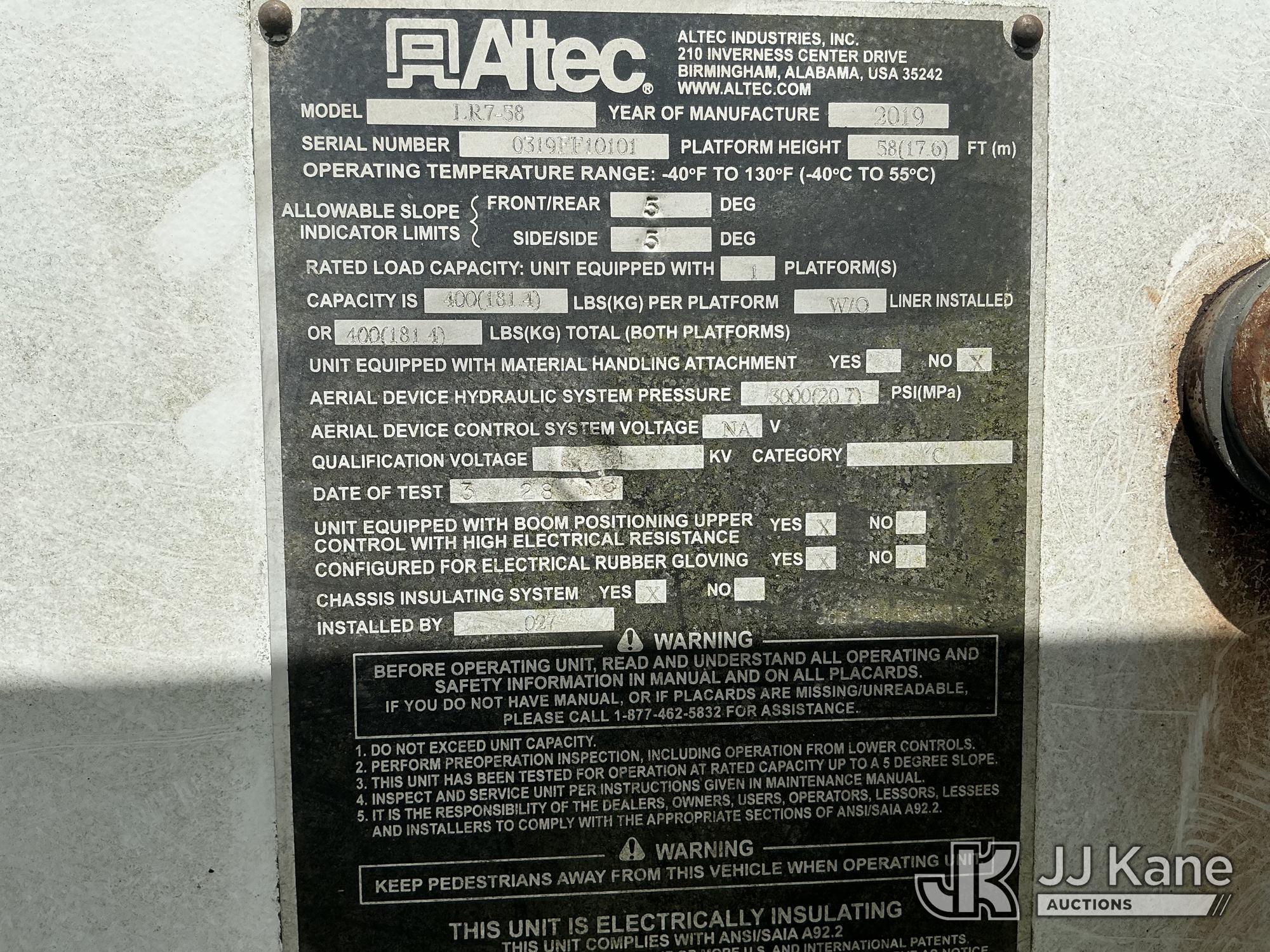 Altec LR7-58, 63 ft, Over-Center Bucket Truck s/n 0319FF10101, with single man bucket, mounted behind cab on 2019 Freightliner M2 106 4x4 Chipper Dump Truck, 6.7L diesel, Auto, A/C, with front winch, (87,588 miles) (Runs, Moves & Upper Operates) (FL Residents Purchasing Titled Items - tax, title & registration fees will be collected at the maximum rate of $400.00 under 25,999 and $800.00 for Over 26,000 and $250.00 trailers - Proof of insurance is mandatory; Out of State Residents Purchasing Title Items - tax will be collected based upon your state rate.) (Reads 10,613 hours) This is a Titled Item*