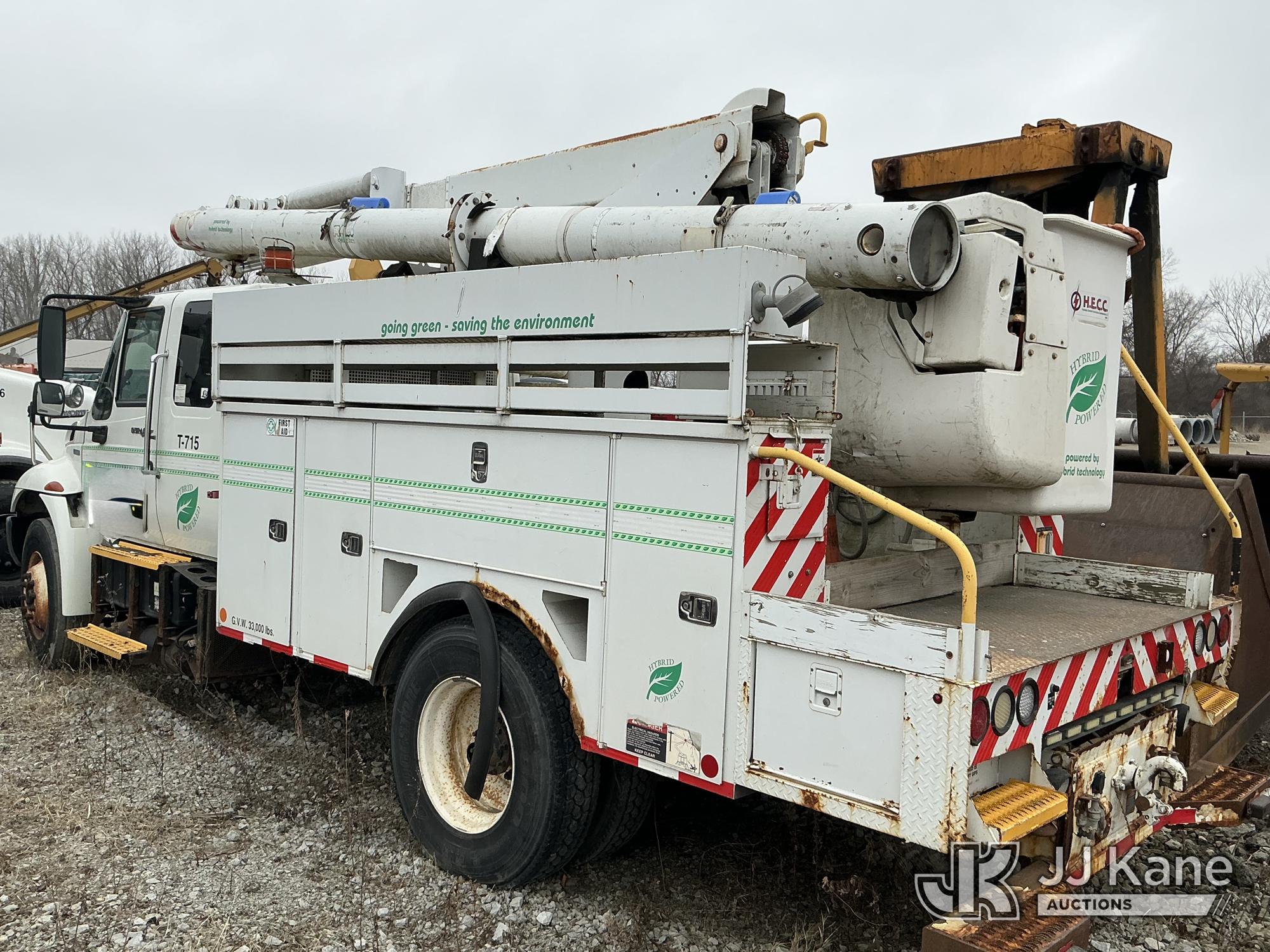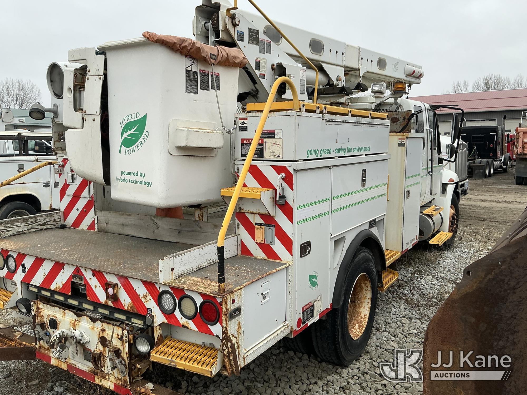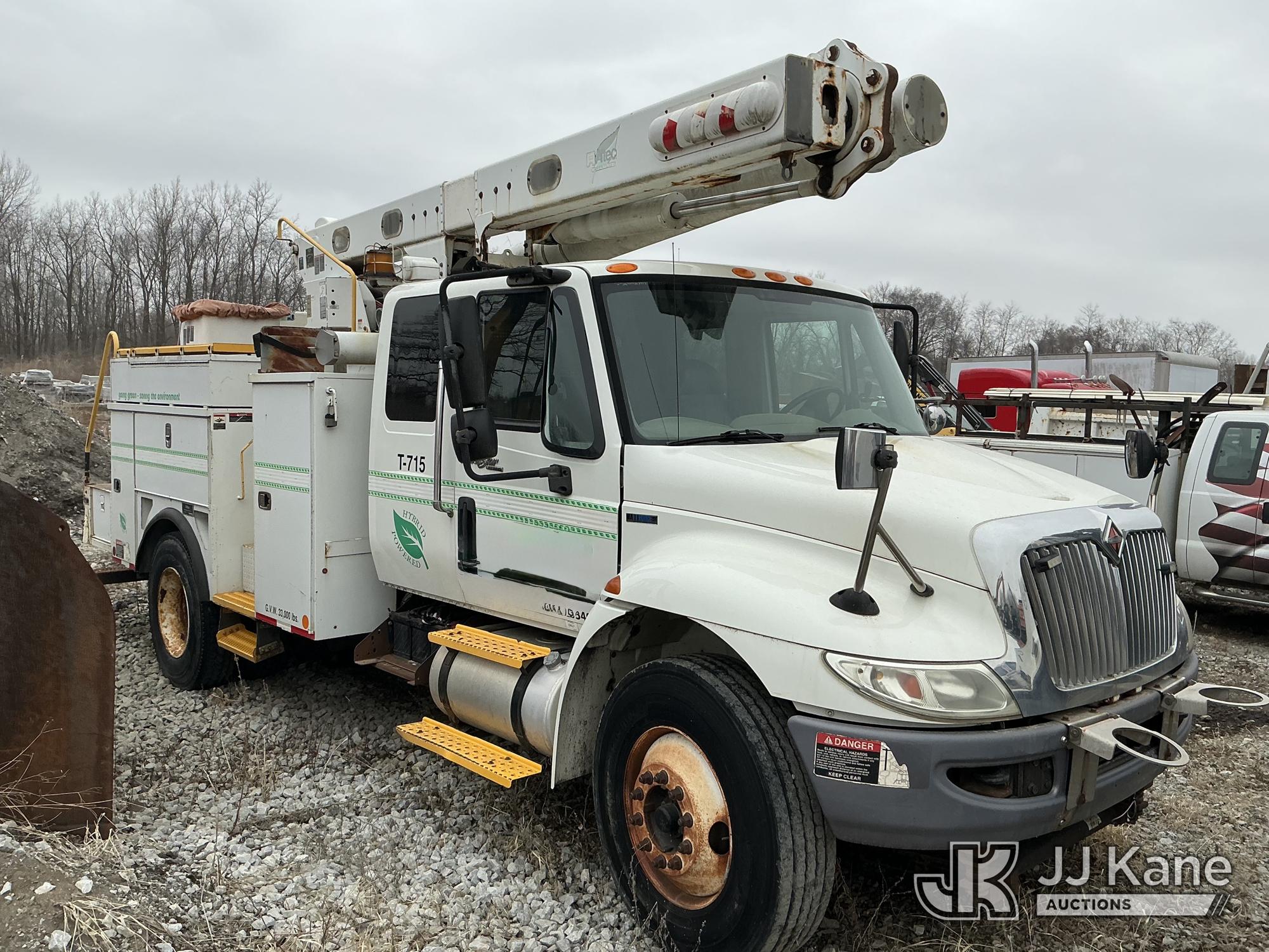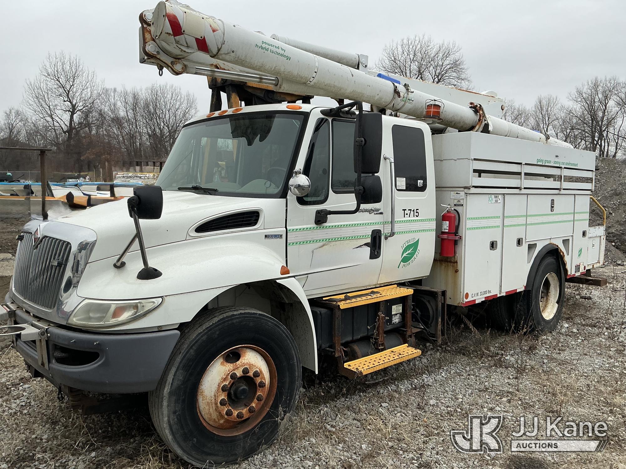 Altec L42P, 47 ft, Over-Center Bucket Truck s/n 0610DR0101, with single-man bucket & 2 hyd outriggers, rear mounted on 2011 International 4300 Extended-Cab Utility Truck, Maxxforce DT Diesel, 4X2, Auto, A/C, (100,218 miles) Hybrid Power System (Runs & Moves, Check Engine Light On) (Seller states this item has been removed from service: Upper Condition Unknown - Requires ANSI Inspection for repair/replacement requirements. The manufacturer has notified JJ Kane that this equipment is subject to an open recall. CSN 3090 Hydraulic Hose Replacement — Compliance A92.2 The equipment should not be operated until this is addressed. Buyer is responsible for reviewing the recall notice and contacting the manufacturer to schedule the recommended corrective actions. Associated costs may be covered by the manufacturer in some cases.) This is a Titled Item*