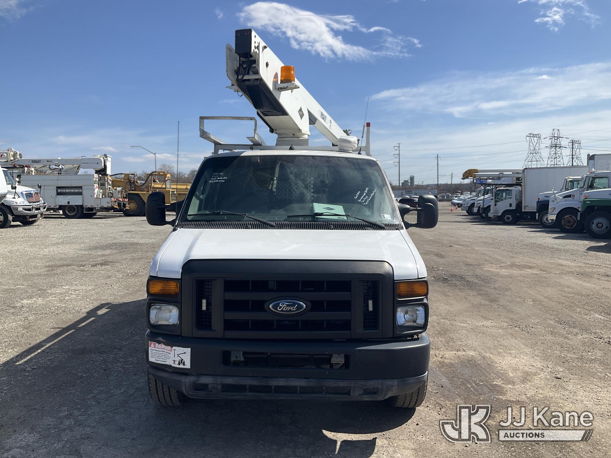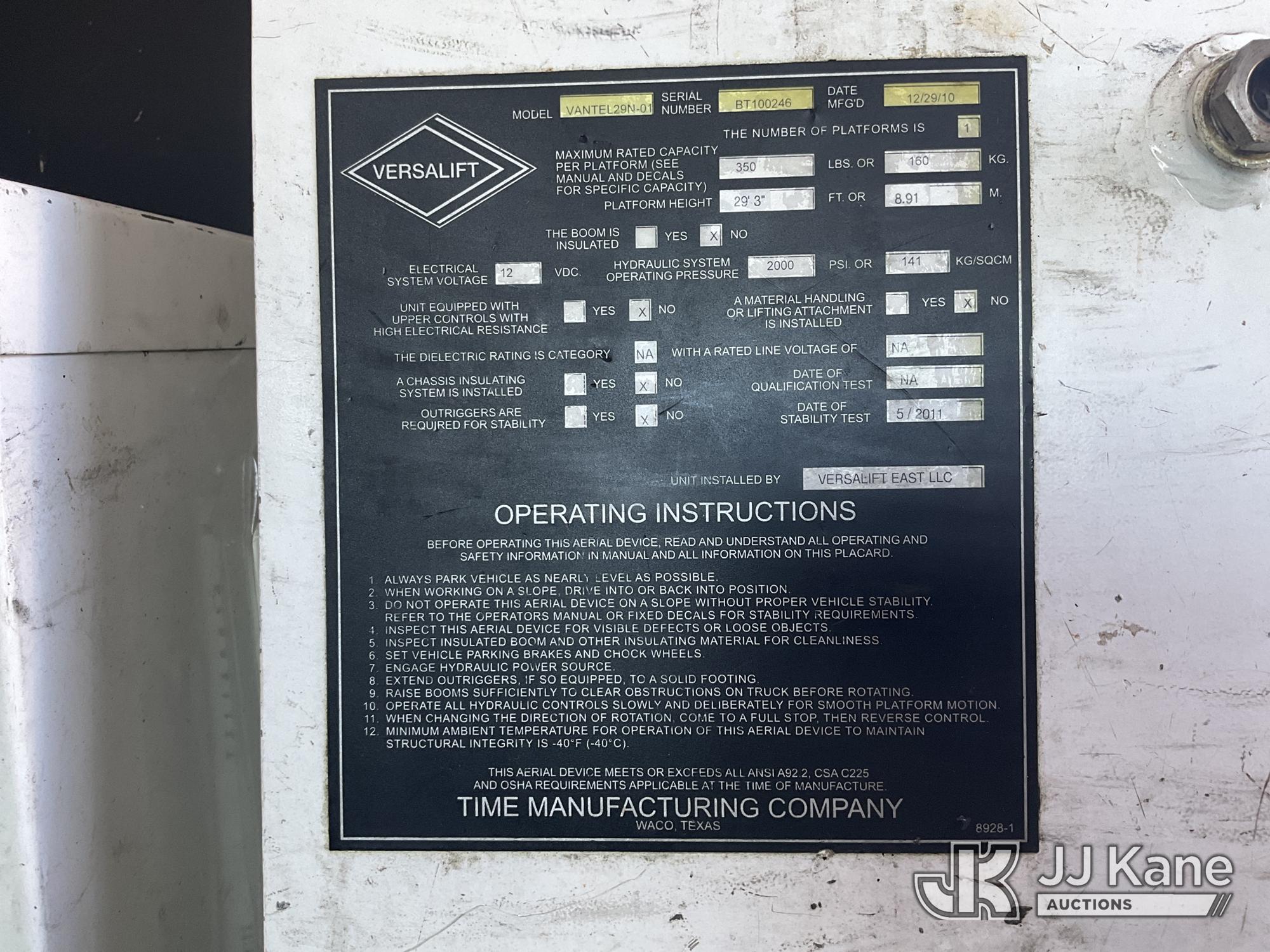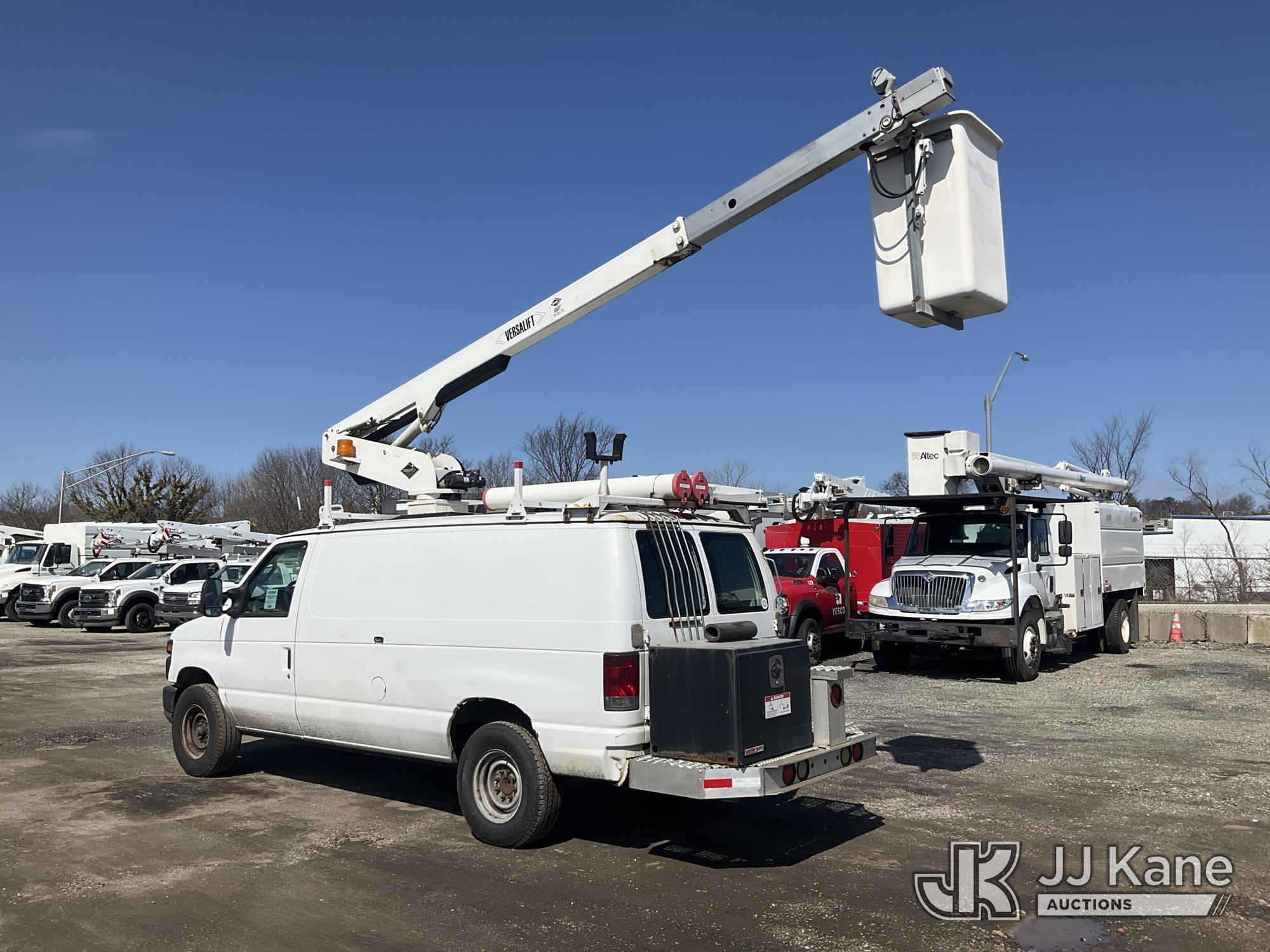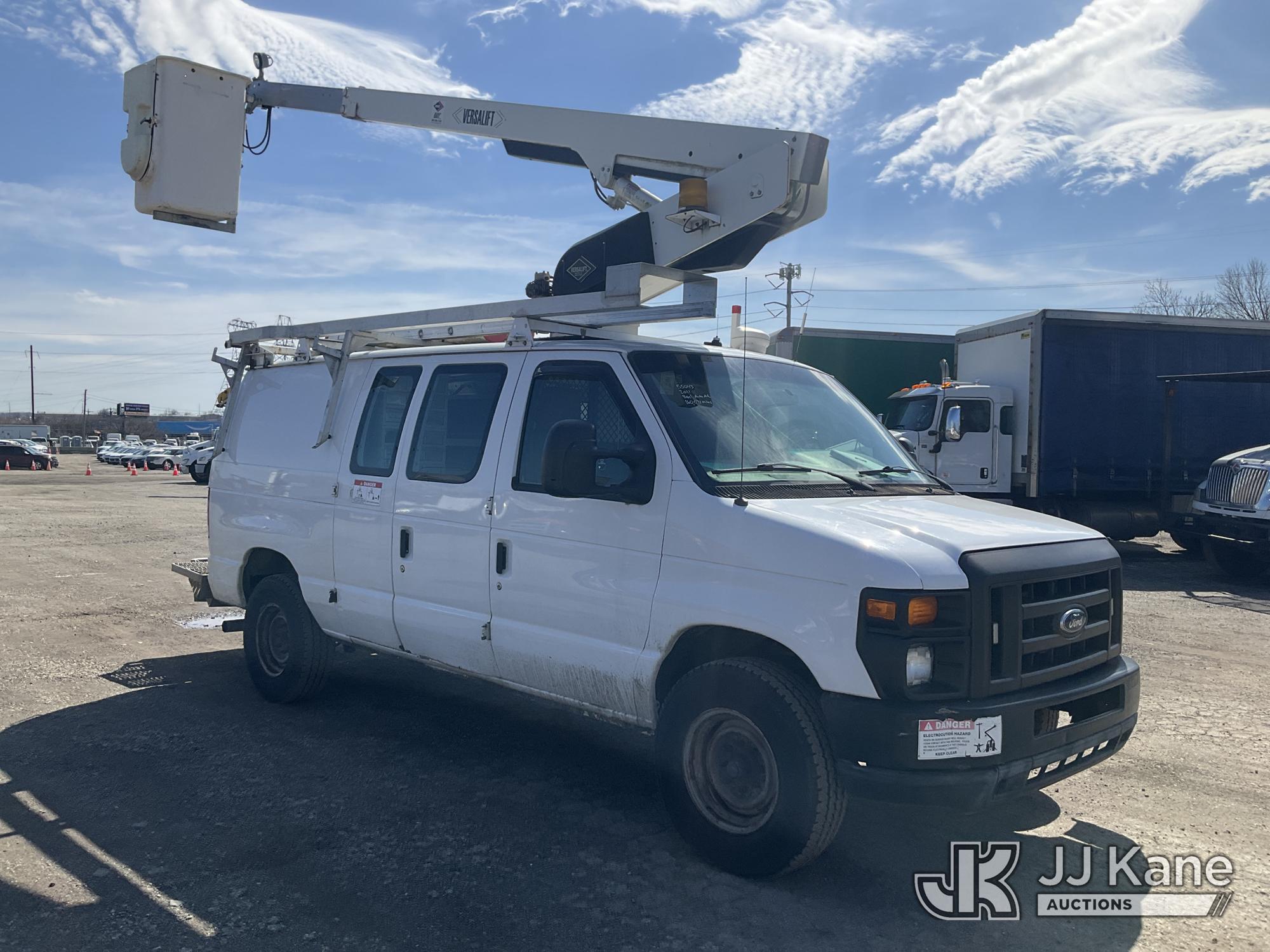 Versalift VANTEL29N-01, 34 ft, Telescopic Non-Insulated Bucket Van s/n BT100246, with single-man bucket, Pendant Control, mounted on 2011 Ford E350 Cargo Van, 8-cyl gas, Auto, A/C, (160,071 miles) (Runs Rough, Moves & Upper Operates, Jump To Start, Rust On Fenders & Rockers) This is a Titled Item*