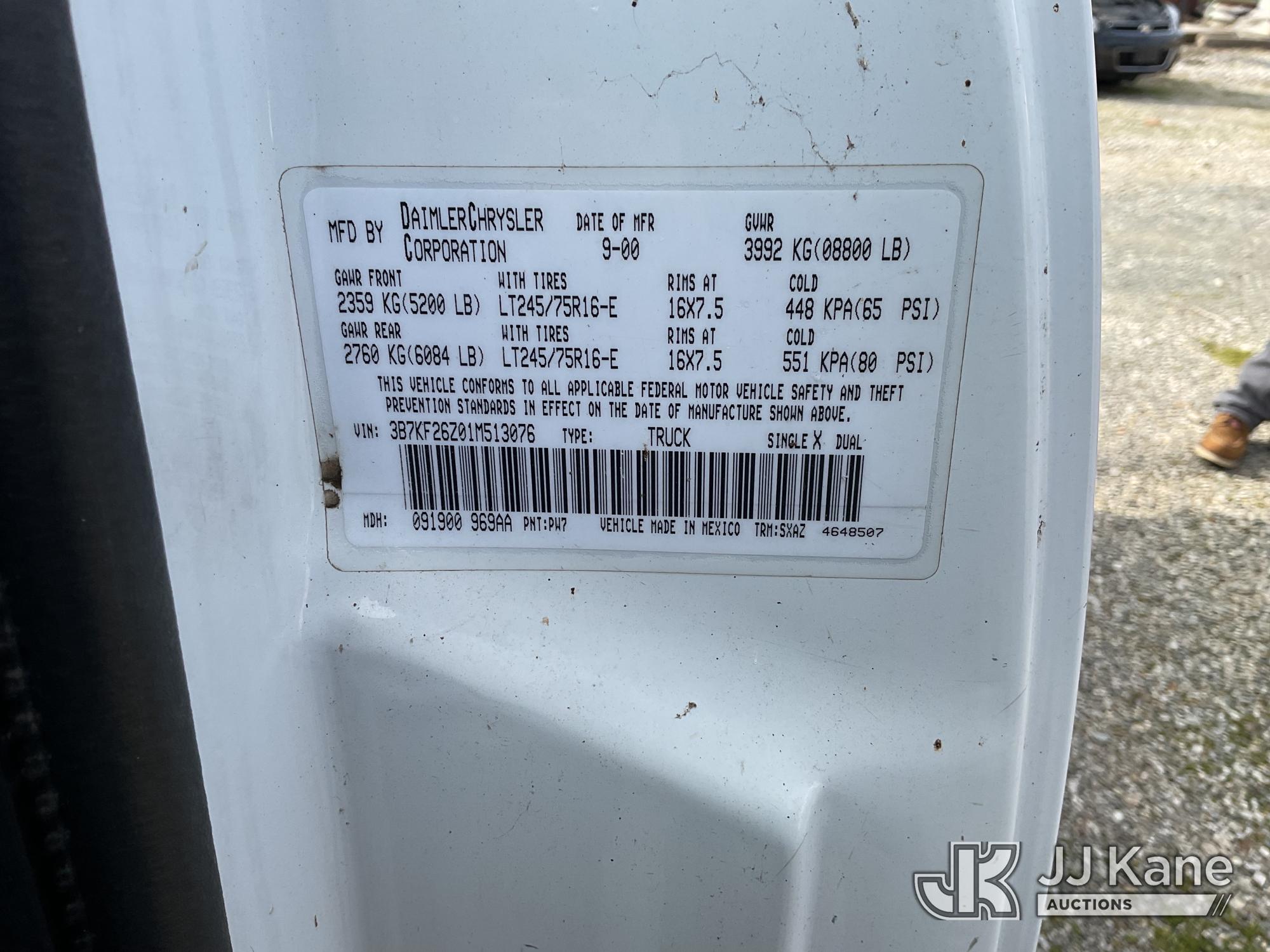 2001 Dodge Ram 2500 Reg. Cab Long Bed 4WD Pickup Truck, s/n 3B7KF26Z01M513076, 5.9L V8 OHV 16V GAS, Auto, A/C, (Exempt from Odometer Disclosure - Reads 75,206 miles) (Runs & Moves. No Tailgate, Seller States the Transmission Slips.) This is a Titled Item*