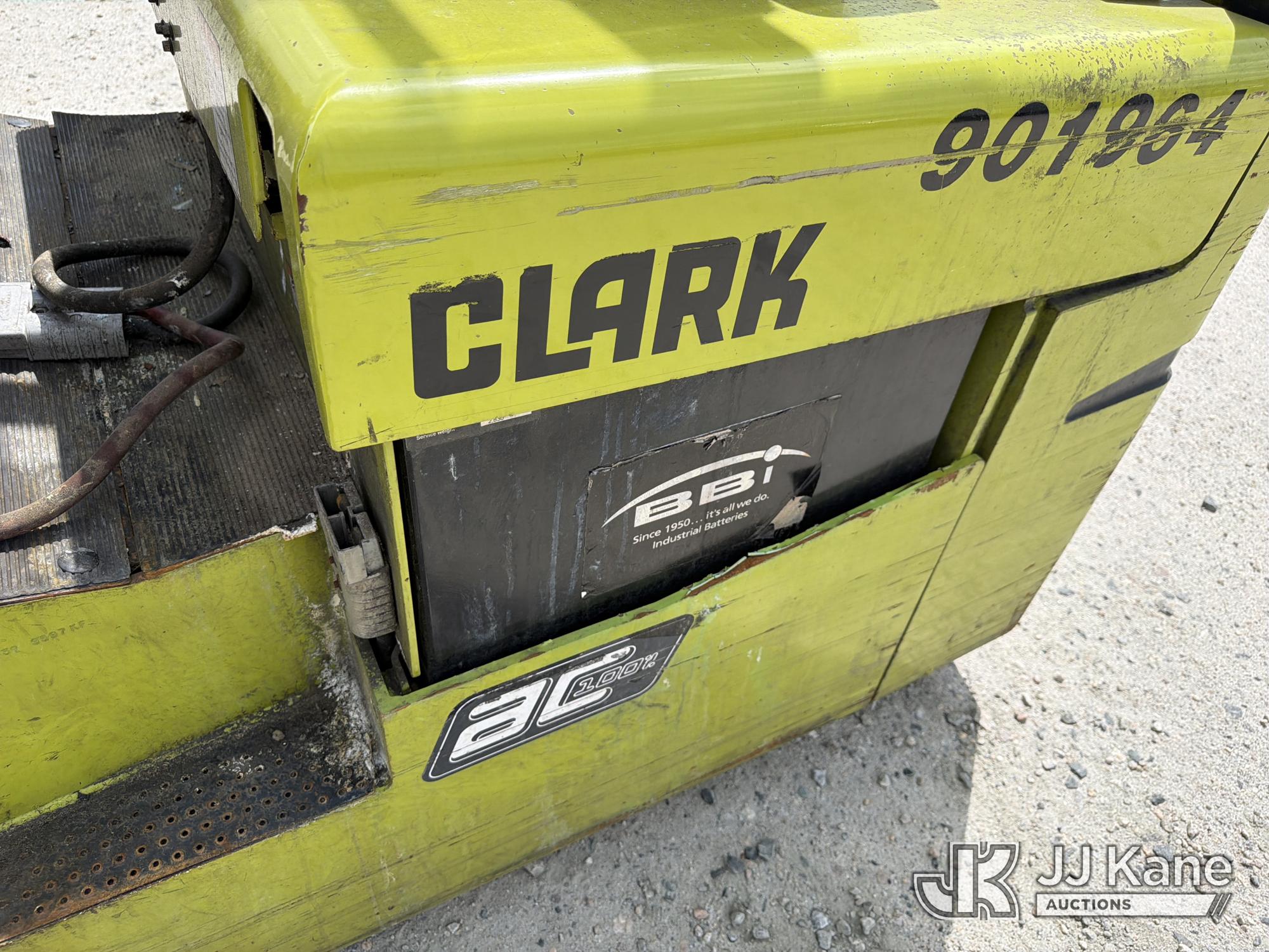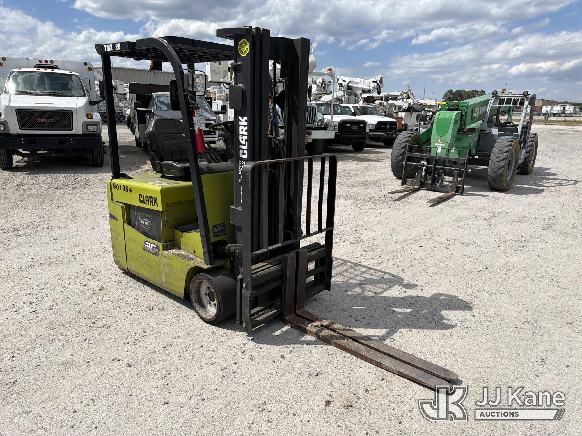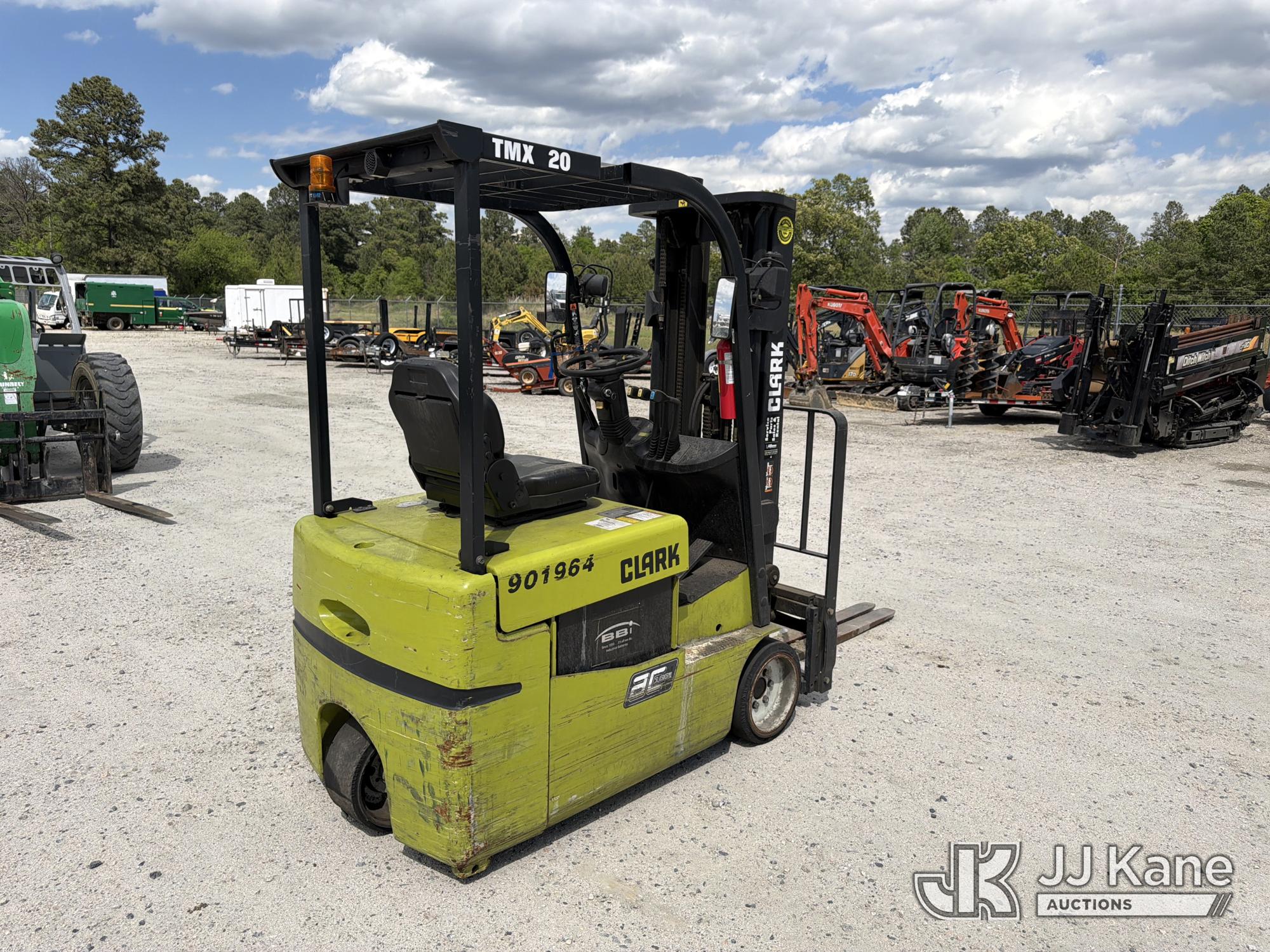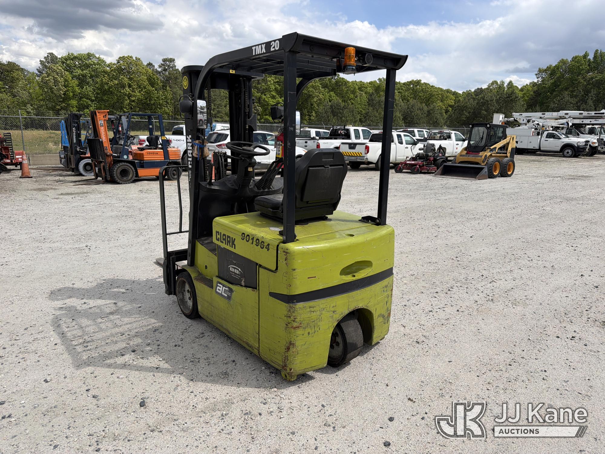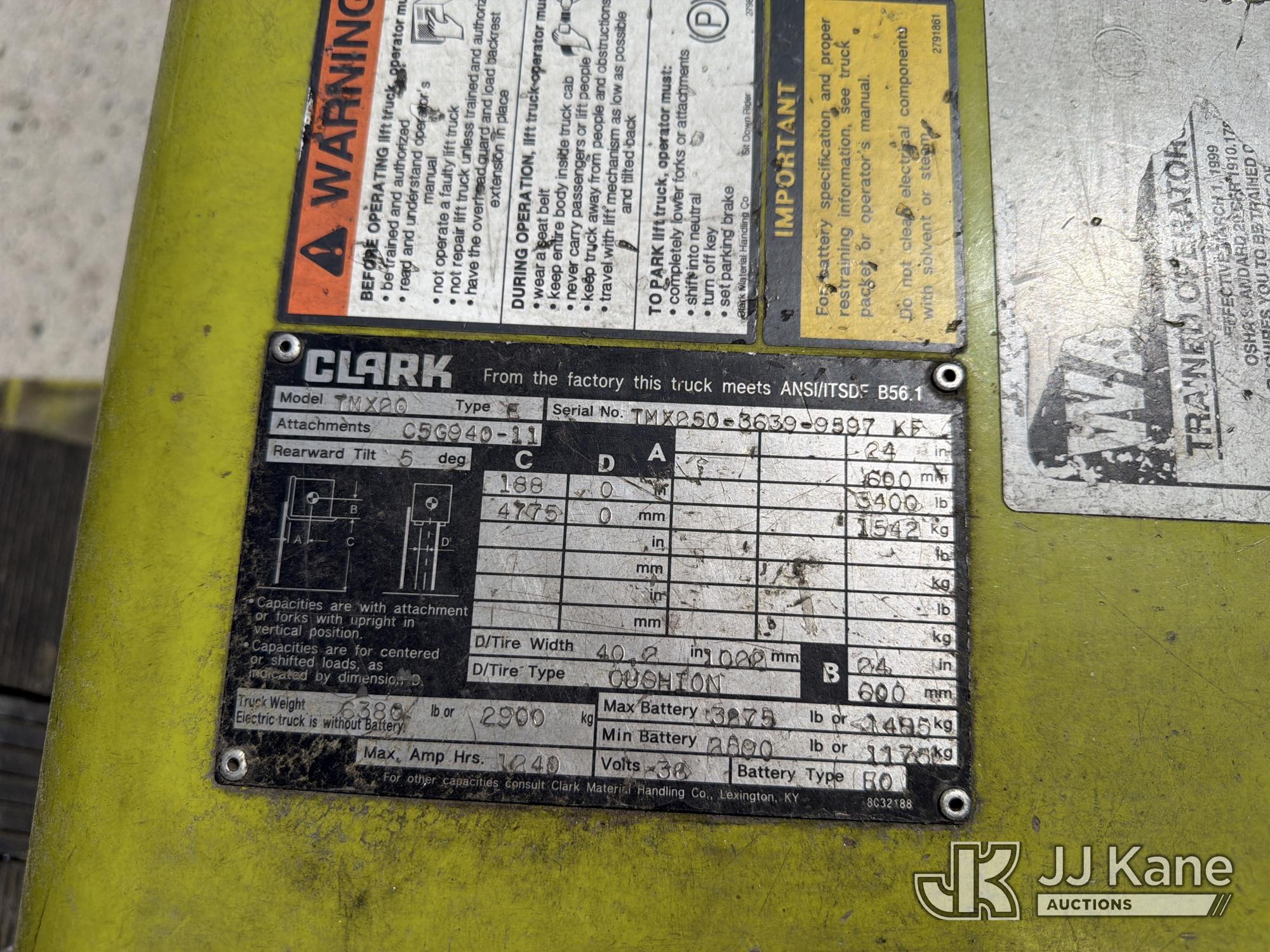 2010 Clark TMX20, 3,400# Solid Tired Forklift, s/n TMX250-3639-9597, battery powered, Shuttle, with 188 in 3-stage mast, 48 in forks & ROPS, (Battery Dead, Not Running, Condition Unknown, Battery Cable Damaged )*