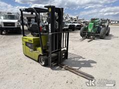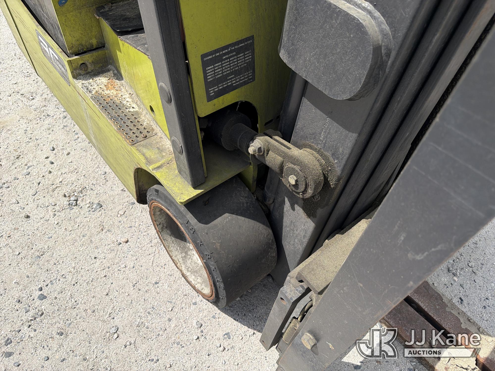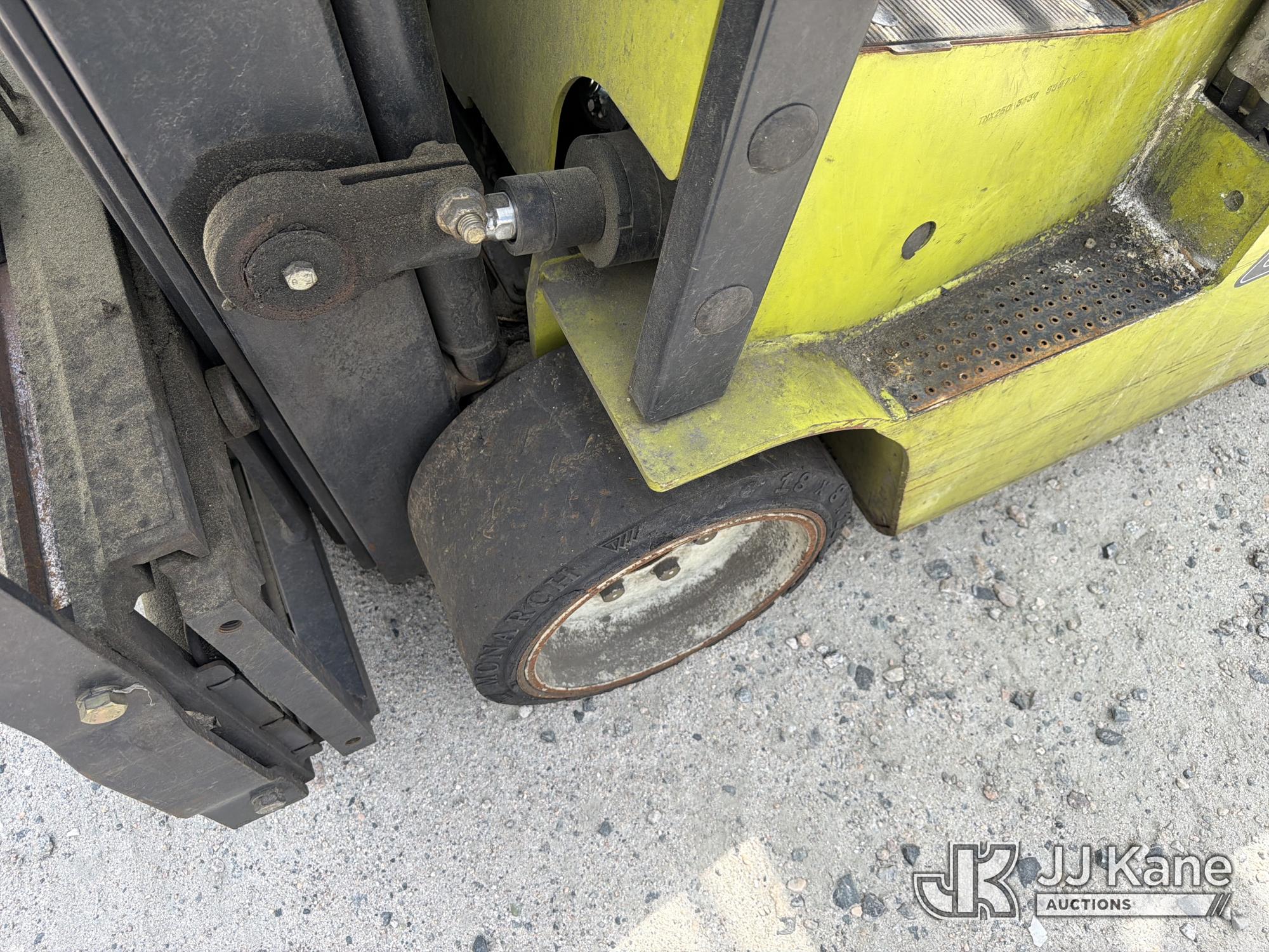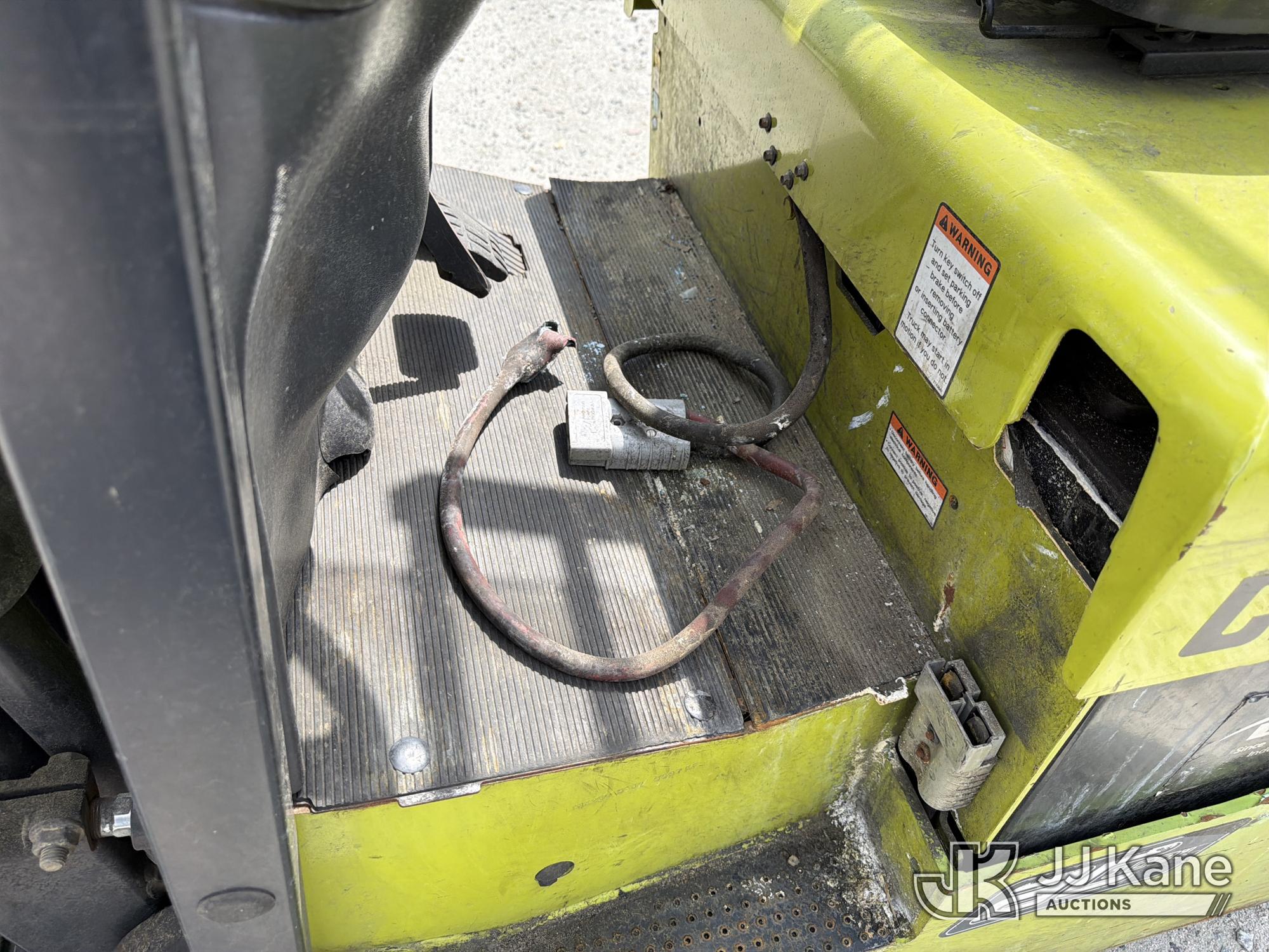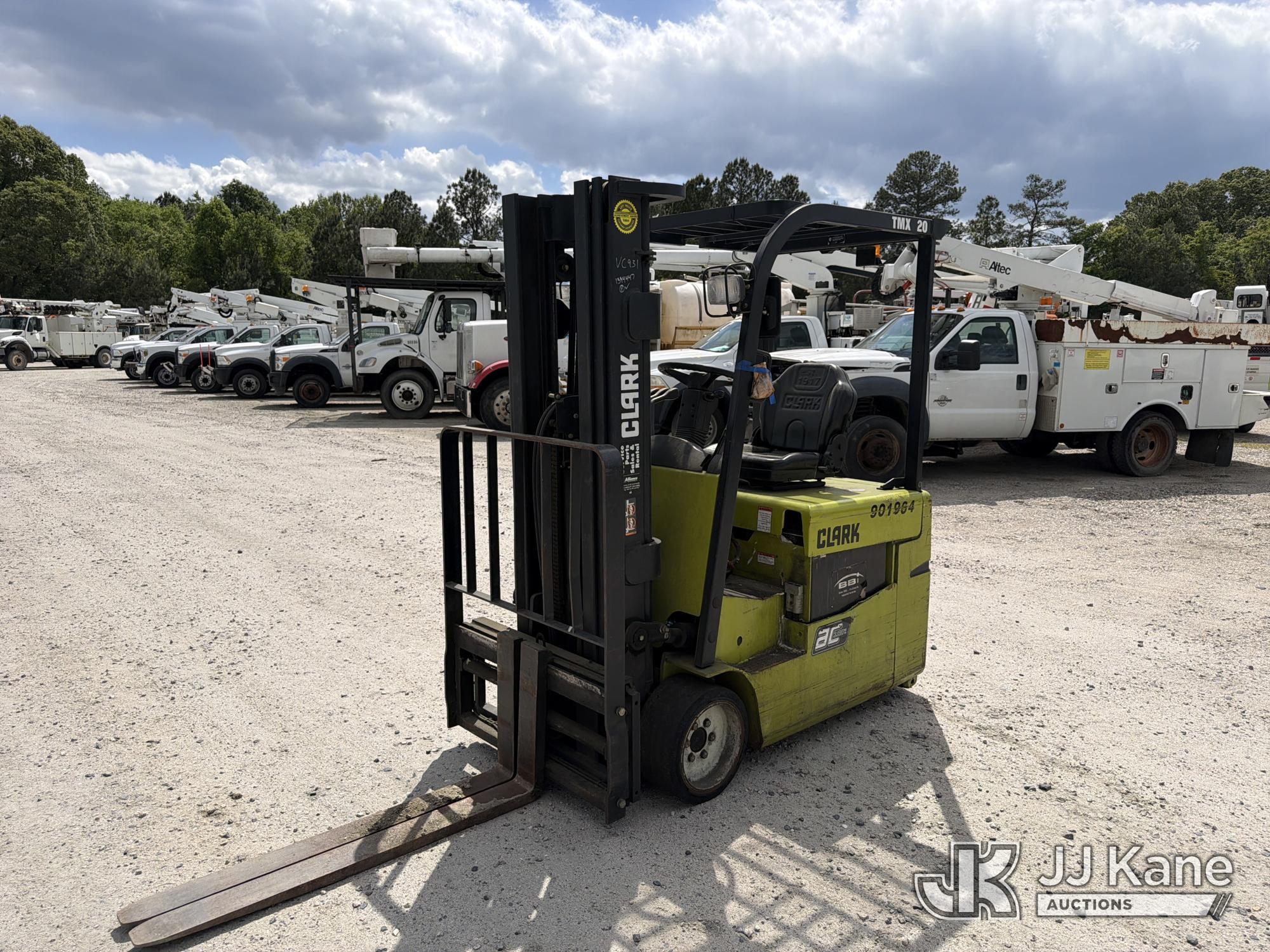 2010 Clark TMX20, 3,400# Solid Tired Forklift, s/n TMX250-3639-9597, battery powered, Shuttle, with 188 in 3-stage mast, 48 in forks & ROPS, (Battery Dead, Not Running, Condition Unknown, Battery Cable Damaged )*