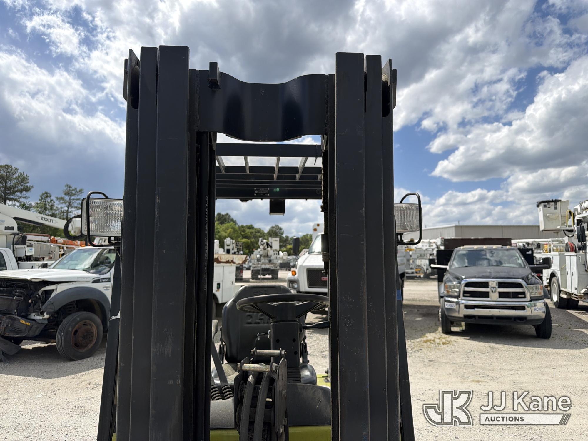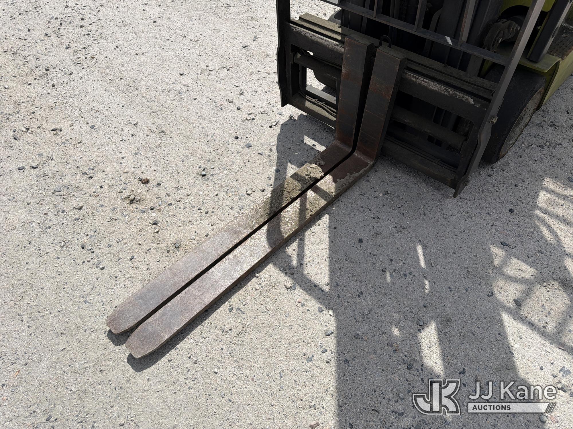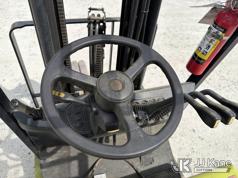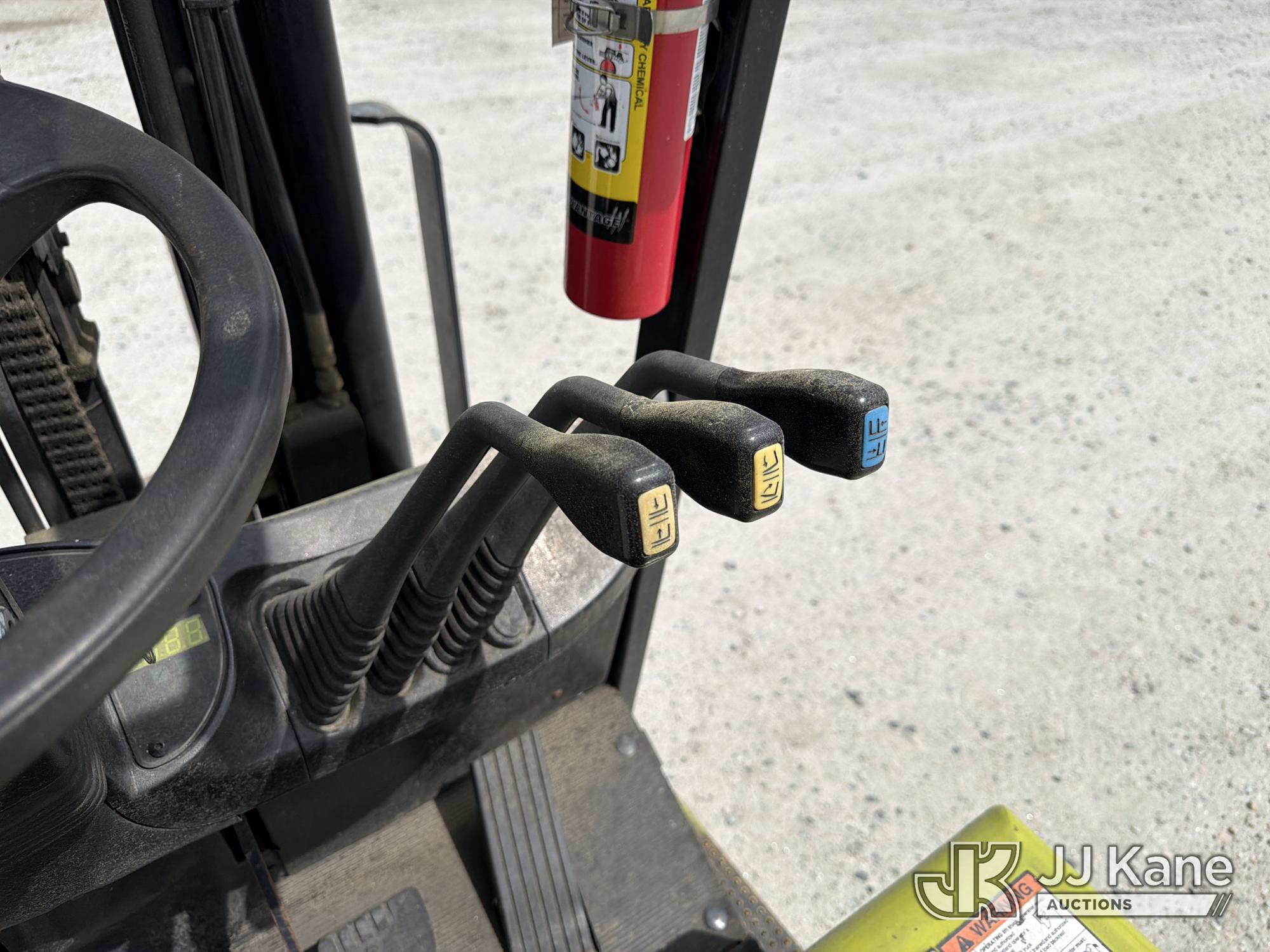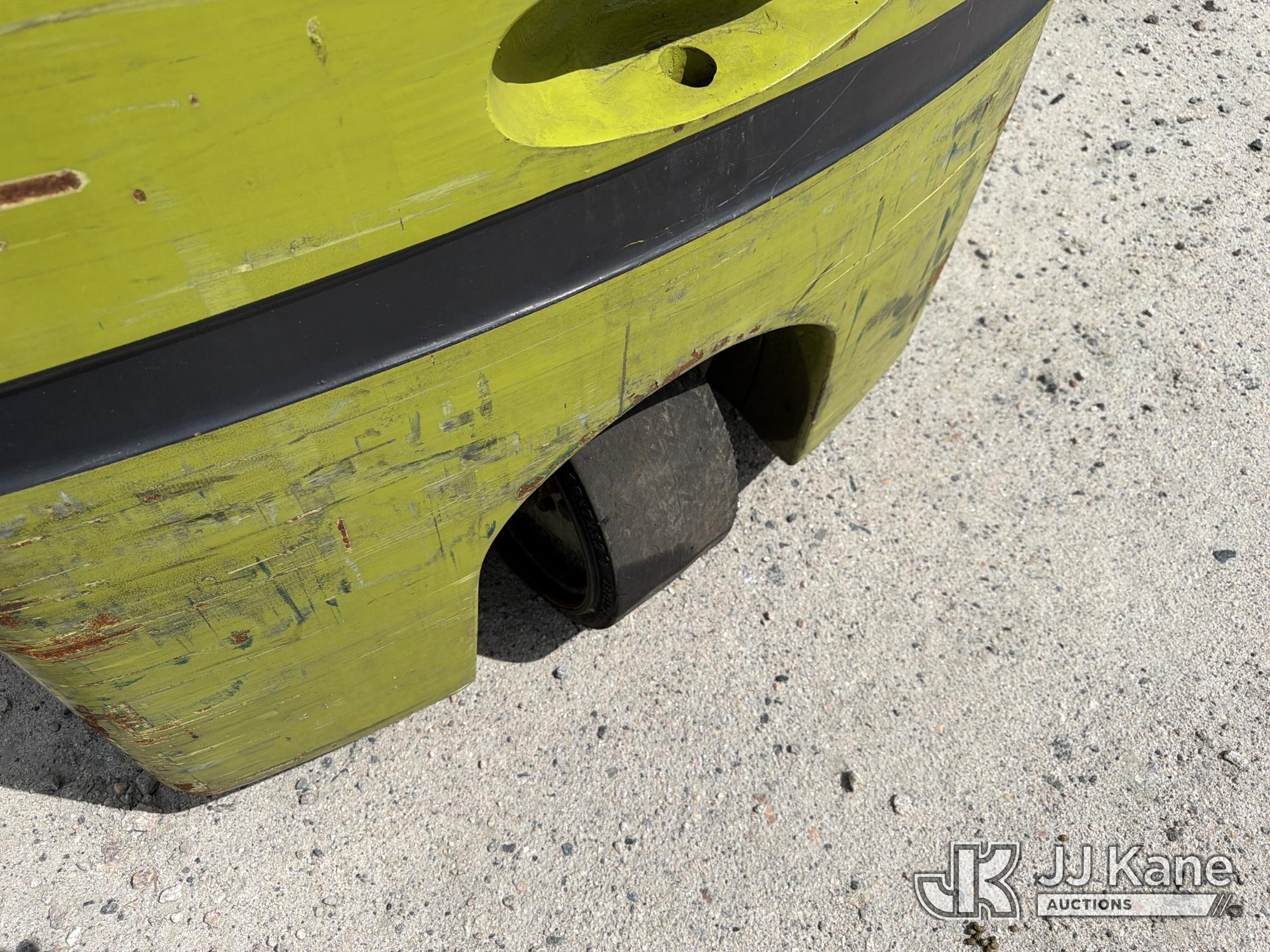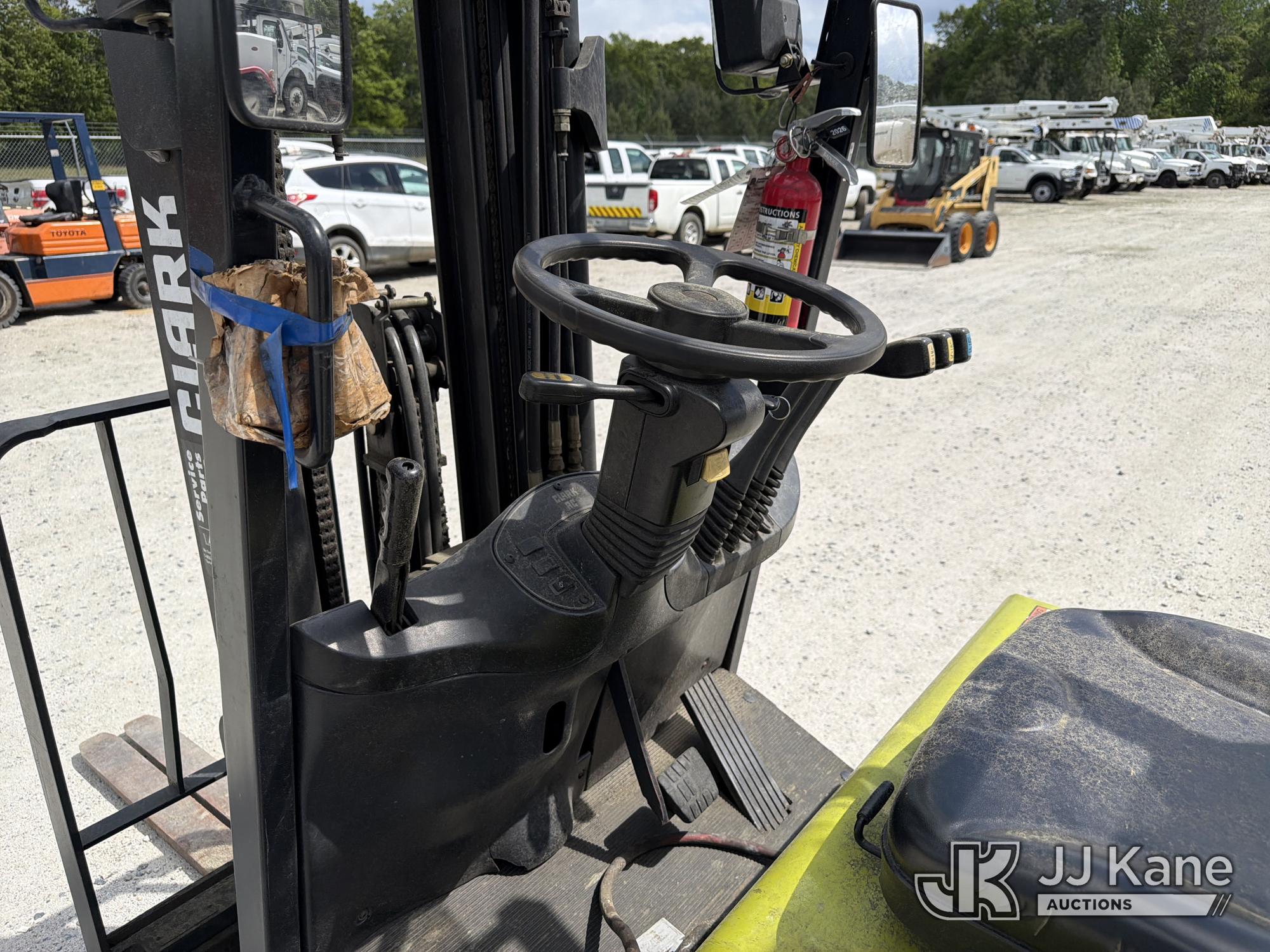 2010 Clark TMX20, 3,400# Solid Tired Forklift, s/n TMX250-3639-9597, battery powered, Shuttle, with 188 in 3-stage mast, 48 in forks & ROPS, (Battery Dead, Not Running, Condition Unknown, Battery Cable Damaged )*