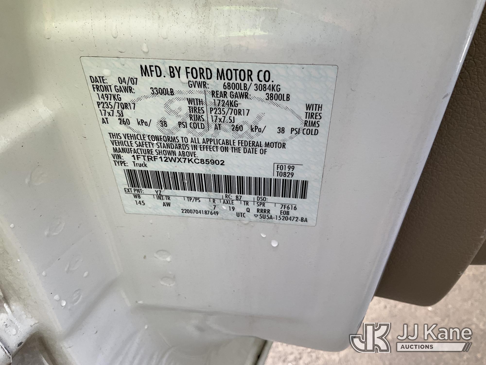 2007 Ford F-150 XL 2WD Pickup Truck, s/n 1FTRF12WX7KC85902, 4.6L V8 SOHC 16V RWD, GAS, 4-Speed Automatic, A/C, with Tow package, toolbox, (156,914 miles) (Runs & Moves, Brake System Issue) (Bidding Restricted to Licensed Vehicle Dealers Only), This is a Titled Item*