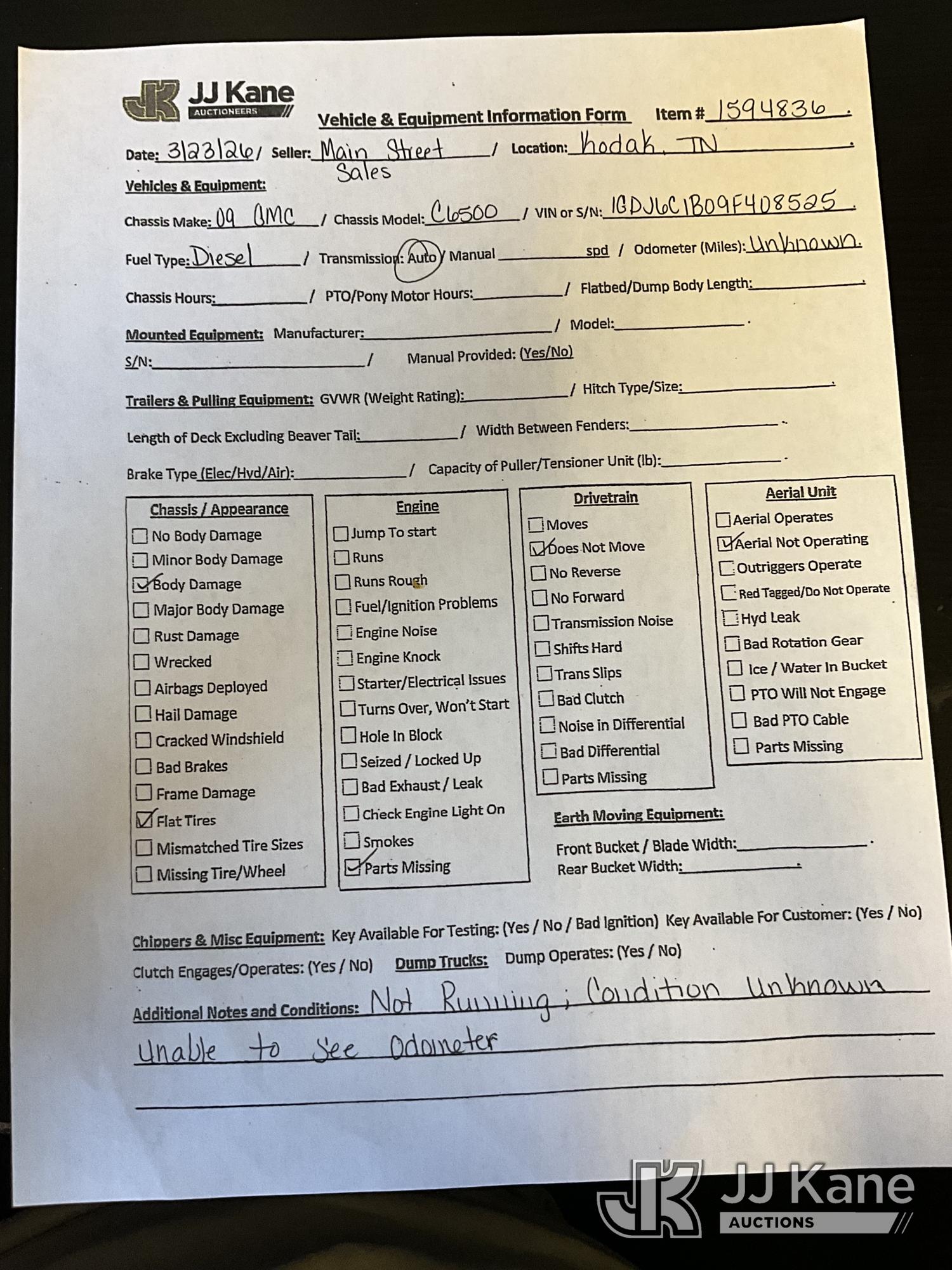 2009 GMC C6500 Chipper Dump Truck, 7.8L diesel, Auto, True Mileage Unknown (Not Running, Condition Unknown) (Parts Missing, Body Damage) This is a Titled Item*