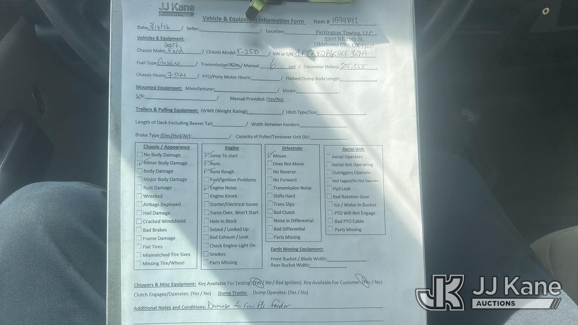 2017 Ford F-250 SD Extended-Cab Pickup Truck, 8-cyl gas, 4WD, 6-Speed Automatic, A/C, (255,555 miles) (Runs Rough & Moves) (Jump to Start, Engine Noise, Minor Body Damage) (Seller States: Needs steering component repairs) This is a Titled Item*