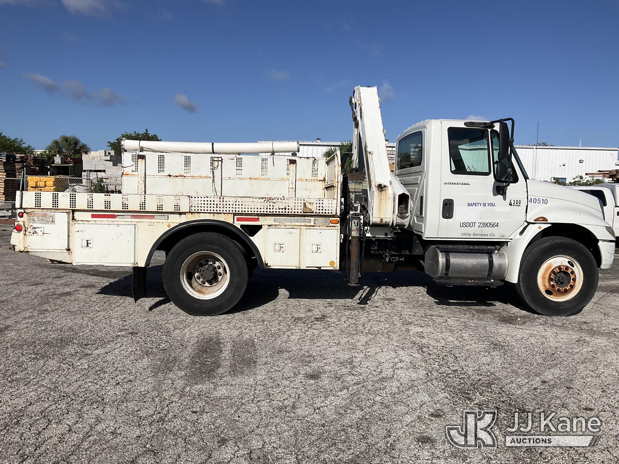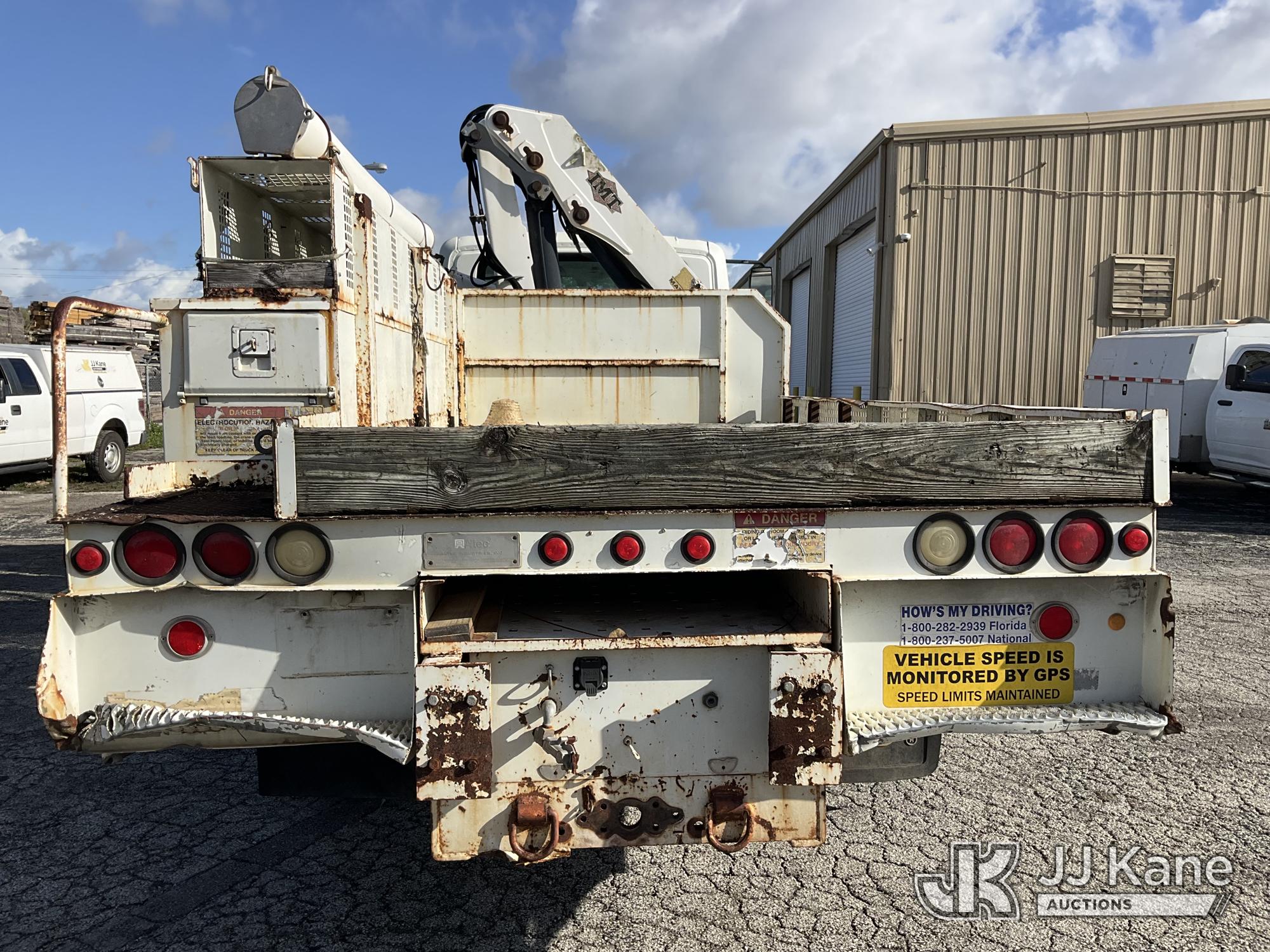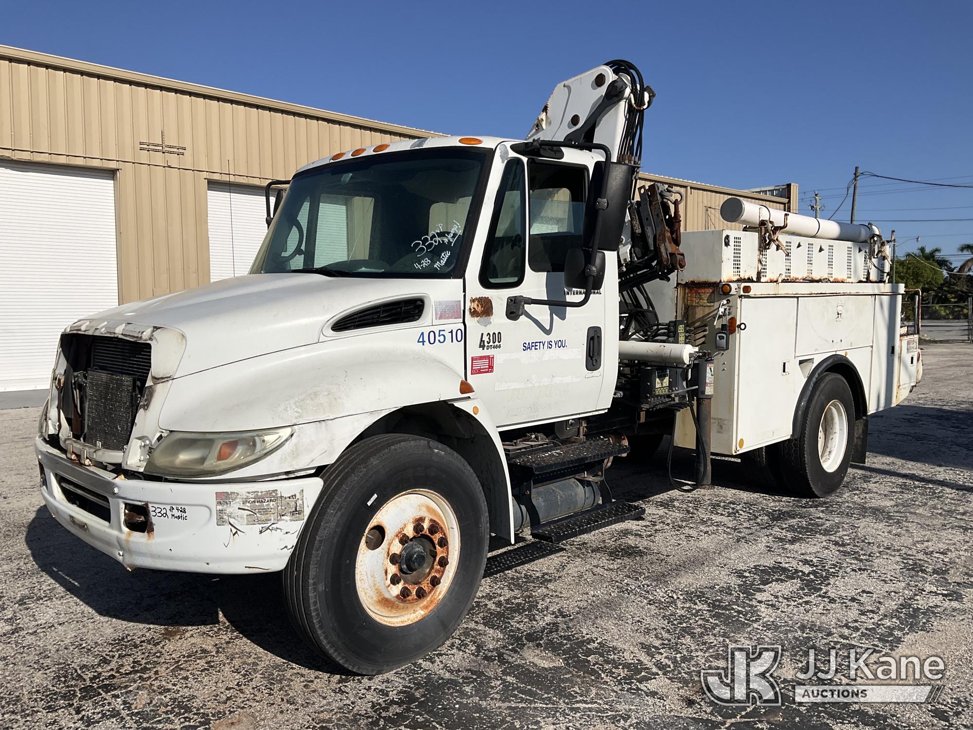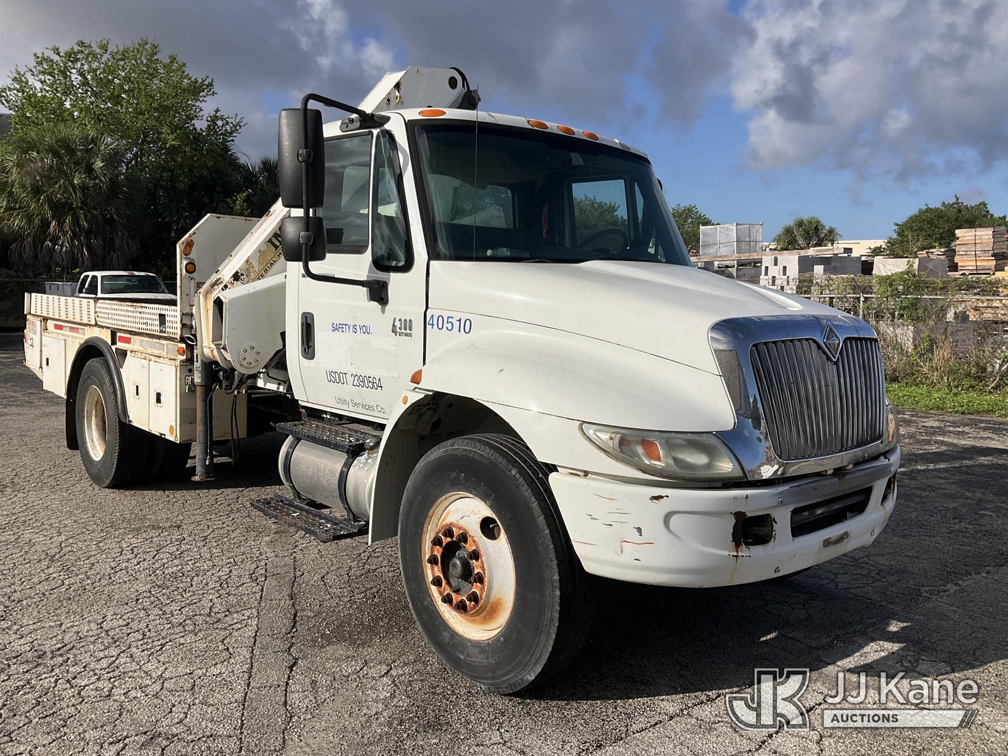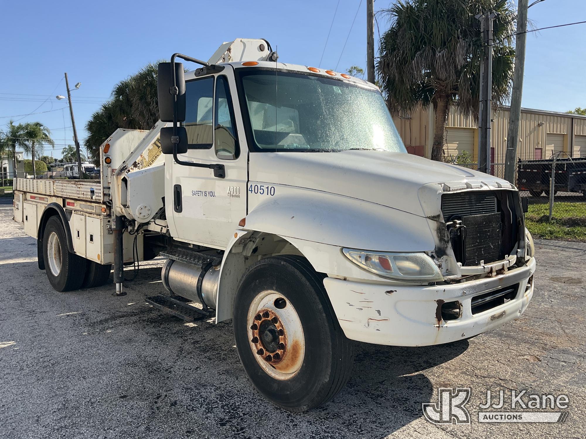 IMT 11/76-K3, 6,835 Lb Knuckleboom Crane s/n 761036, with 30 ft. reach, dual controls & 2 hyd outriggers, mounted behind cab on 2006 International 4300 URD/Flatbed Truck, 7.6L L6 Diesel, 6-spd, A/C, (Exempt from Odometer Disclosure - Reads 134,530 miles) (Runs & Moves With Jump, Blown Hydraulic Hoses, Boom Operating Condition Unknown, ABS Light On, Body Damage & Rust, Interior & Engine Grill Damaged) (FL Residents Purchasing Titled Items – tax, title & registration fees will be collected at the maximum rate of $400.00 under 25,999 and $800.00 for Over 26,000 and $250.00 for Trailers – Proof of insurance is mandatory; Out of State Residents Purchasing Title Items – tax will be collected based upon your state rate) (Reads 7,833 hours) This is a Titled Item*