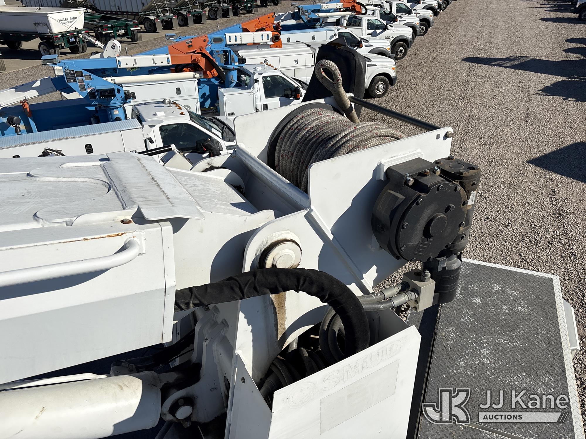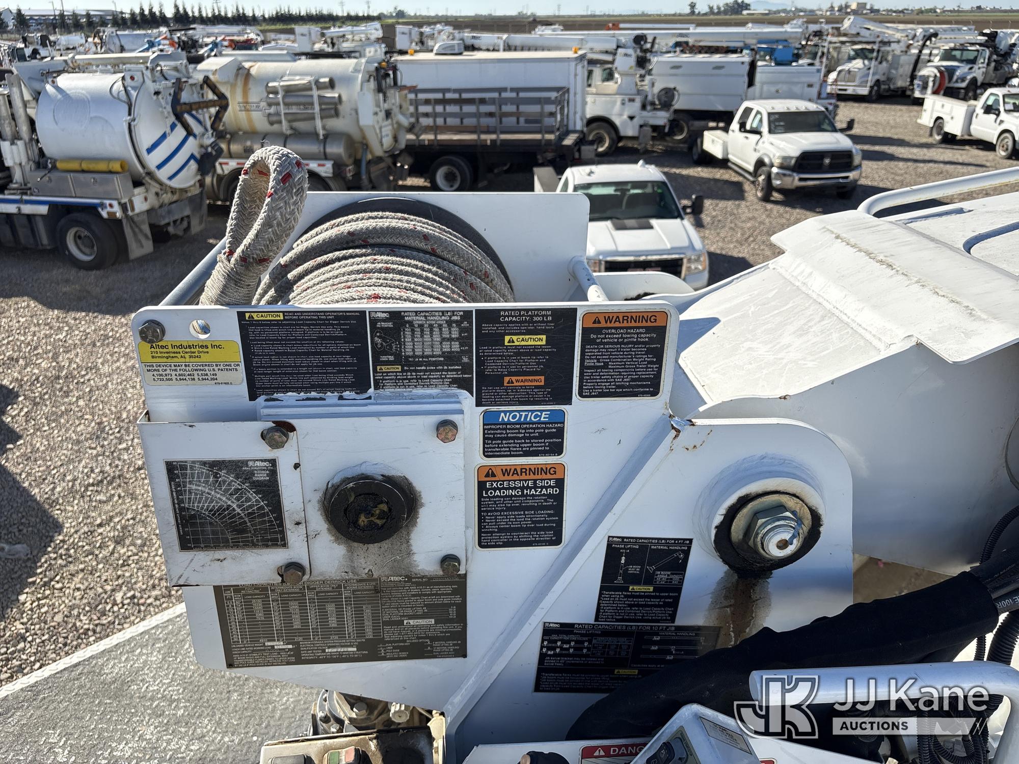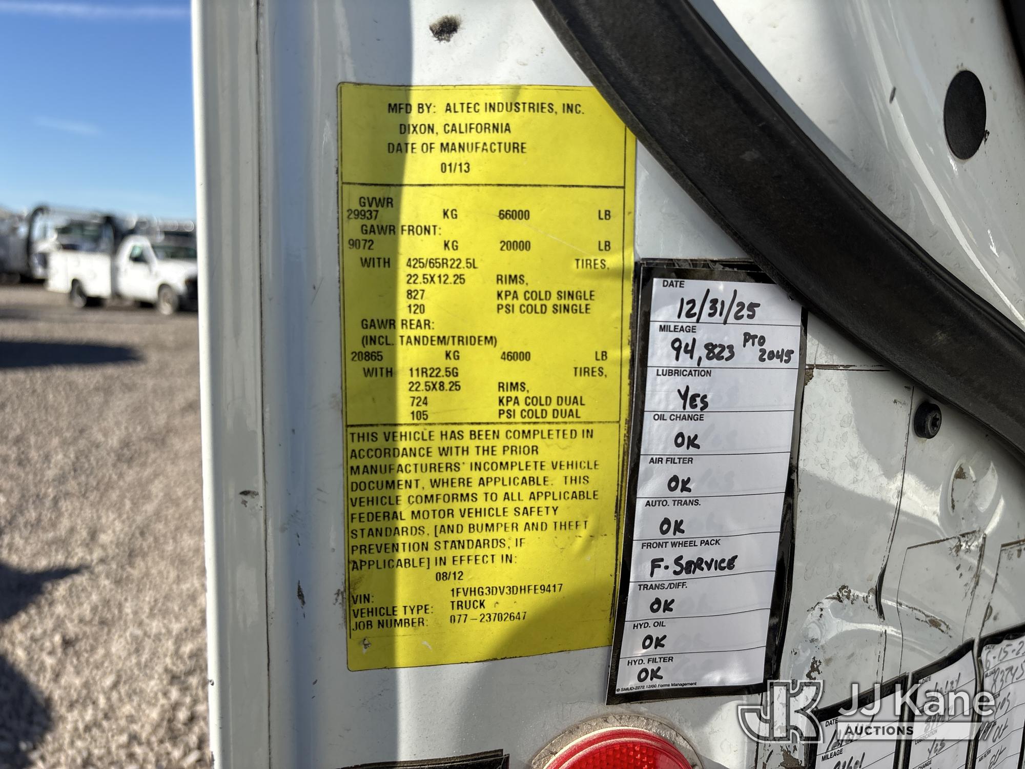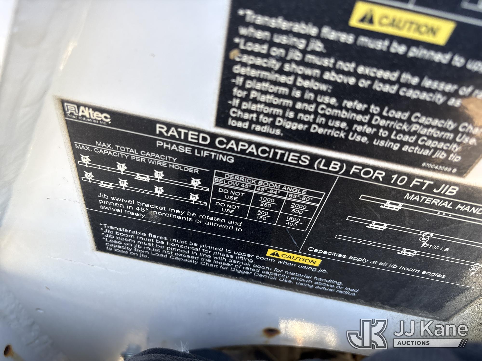 Altec D3060A-TR, 25,150 Lb Digger Derrick s/n 0912CM0706, with 60 ft. sheave height, 4 section hydraulic boom, 2 speed digger, heel winch, pole guides, riding console, 4 hydraulic outriggers, rear mounted on 2013 Freightliner 114SD Utility Truck, 12.8L L6 6X4, DIESEL, Auto, A/C, with front winch, (94,878 miles) (Runs, Moves & Operates ) (Reads 2,818 hours) May be subject to ARB Regulations This is a Titled Item*
