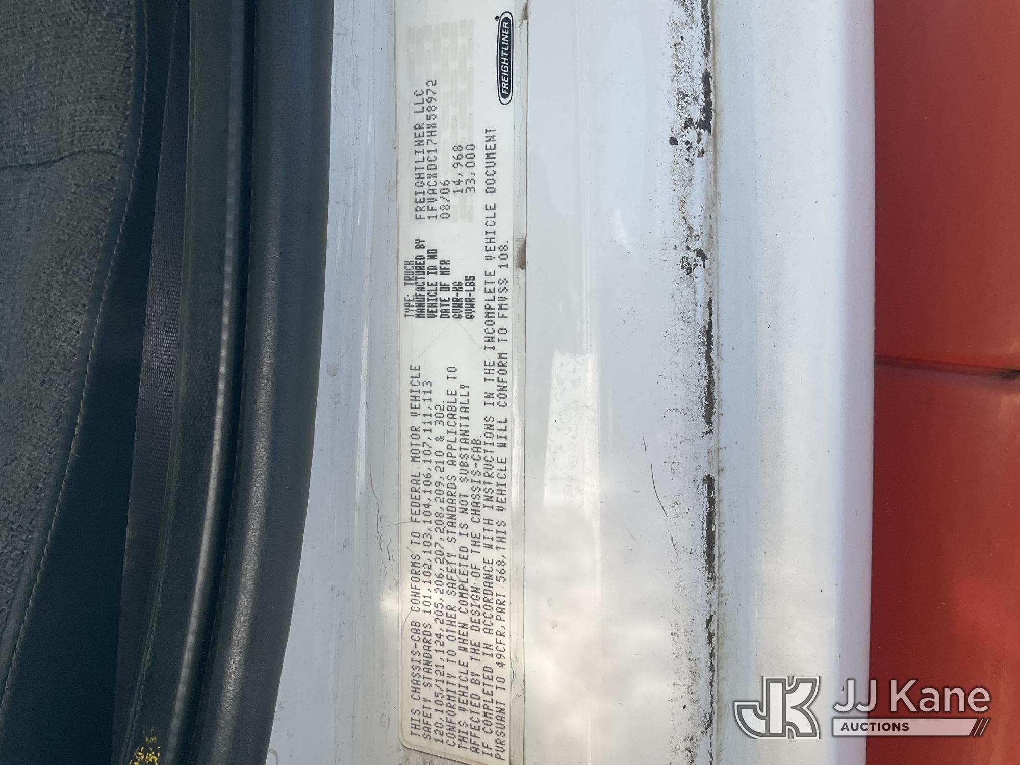 2007 Freightliner M2 106 Medium Duty Sweeper, s/n 1FVACXDC17HX58972, Cat 4X2, diesel, Auto, with Freightliner M2 106, (131,174 miles (unverified)) (Does not run or move. Side broom and rear main broom installed. Shows age, rust, dust, and normal industrial-use wear.) (Bidding Restricted to Licensed Vehicle Dealers Only), Subject to CARB Regs,CARB non Compliant,Cannot Operate on CA Roads/Highways until Compliant This is a Titled Item*