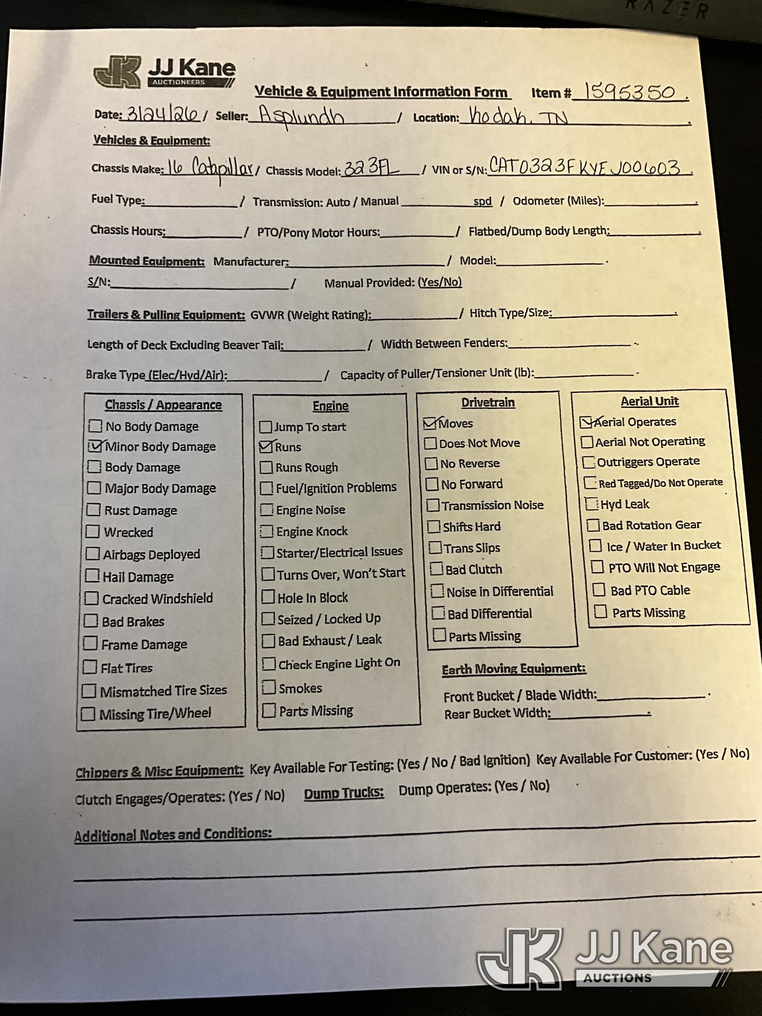 2016 Caterpillar 323FL Hydraulic Crawler Excavator, s/n 000000000YEJ00603, diesel, Hydraulic Drive, with AFE RDM52EX Mulcher Attachment, s/n 0816R180061, Hyd Thumb Attachment, AFEX Fire Suppression System & EROPS, (Runs, Moves & Operates)*