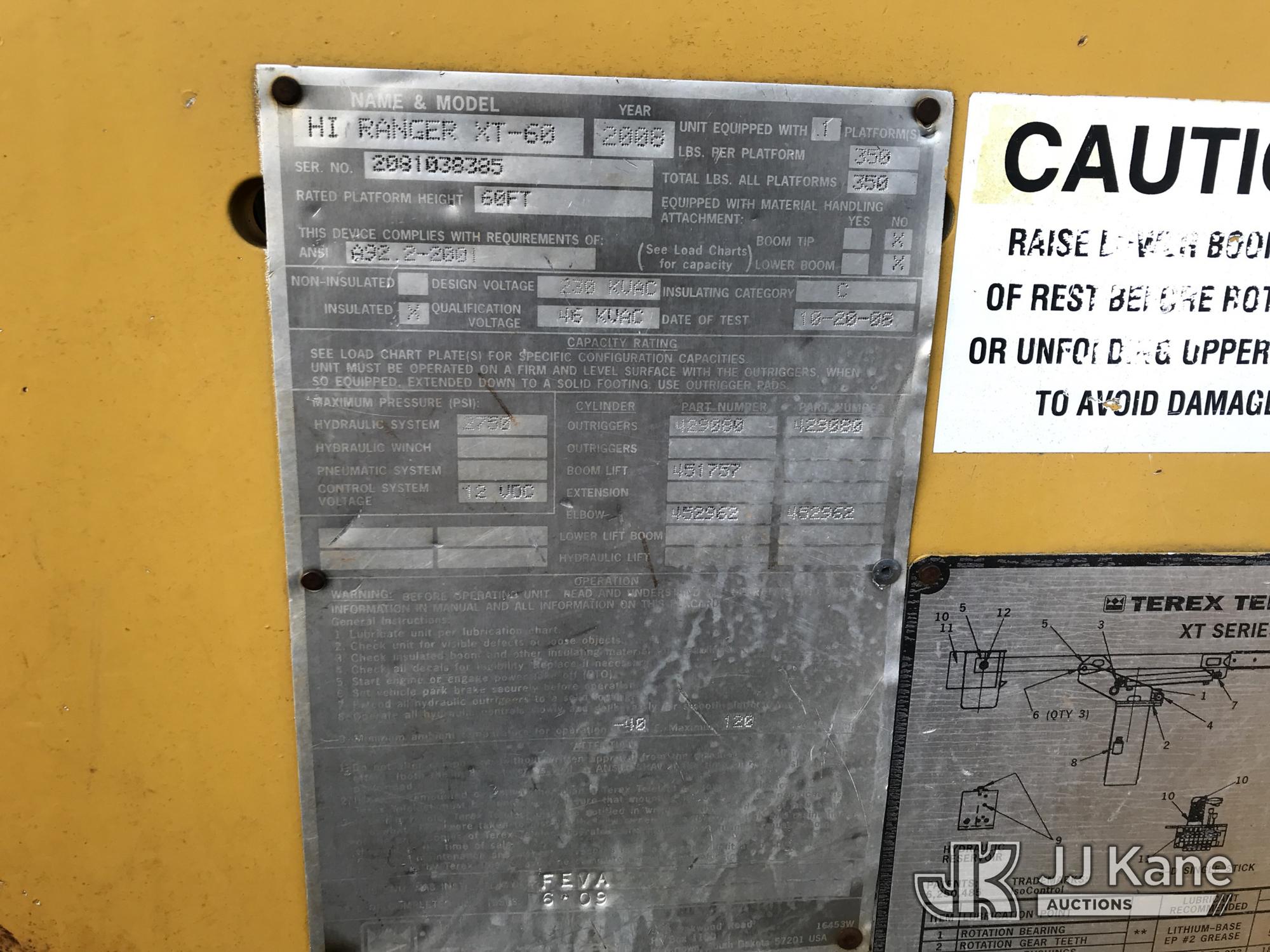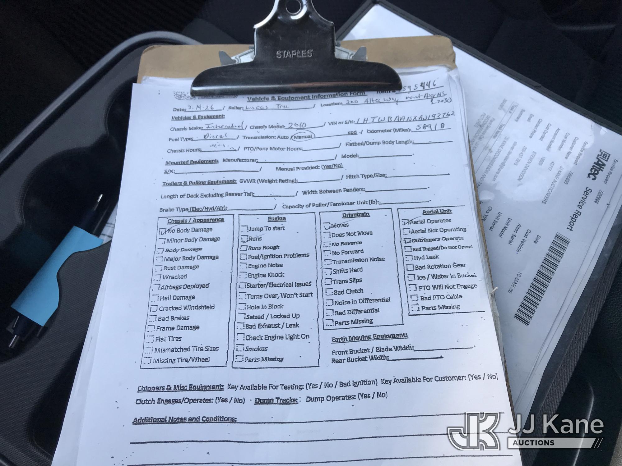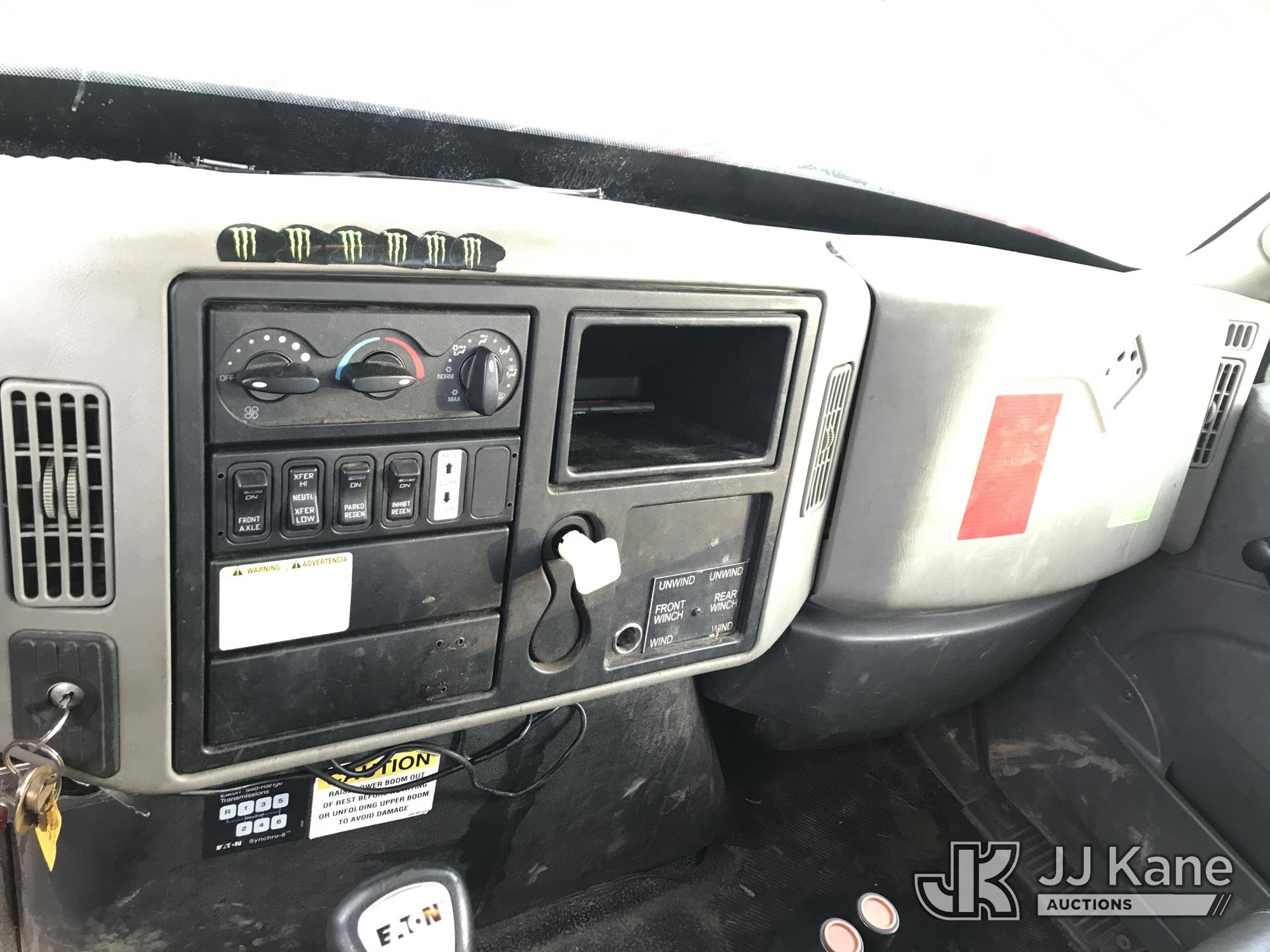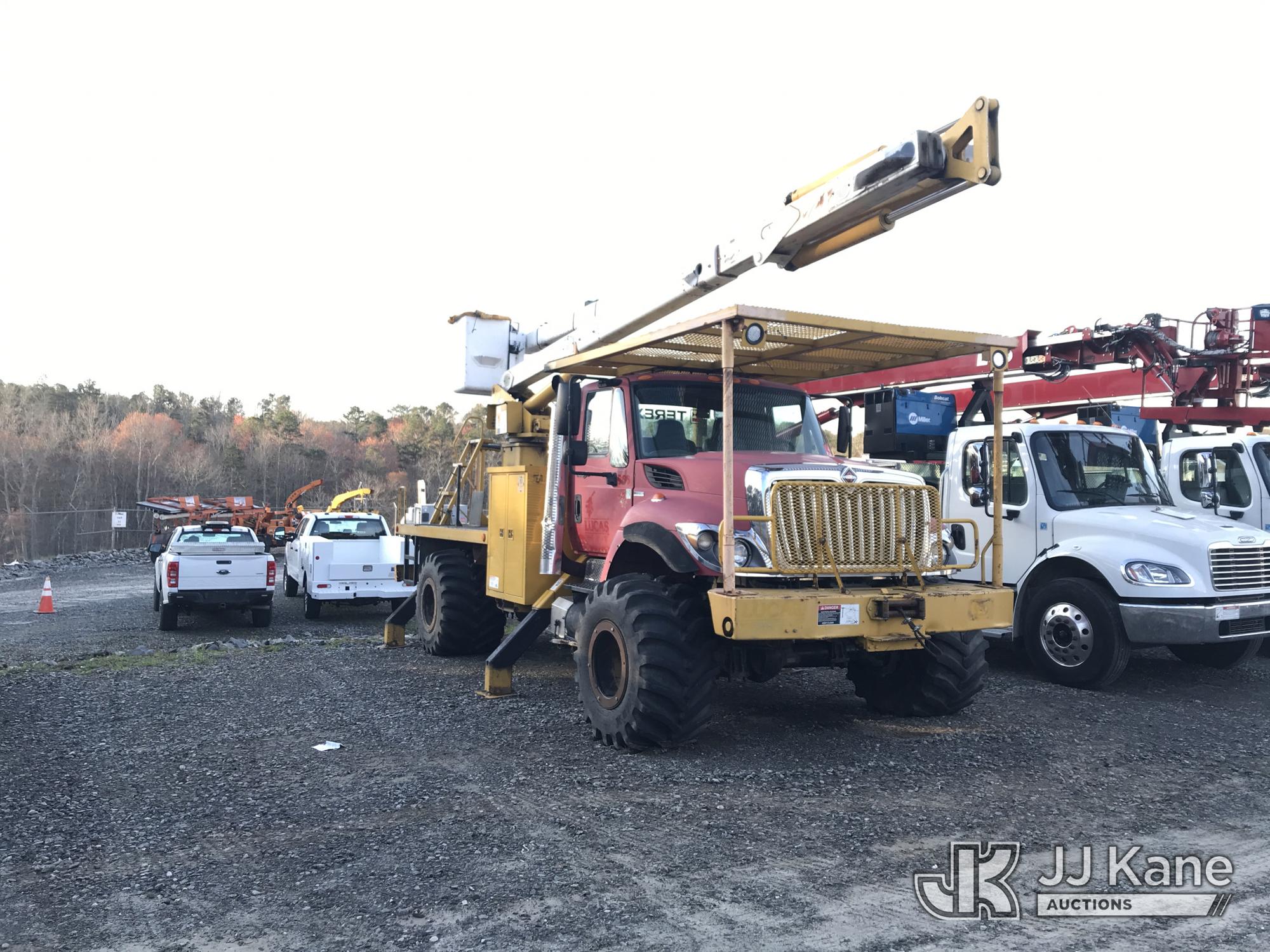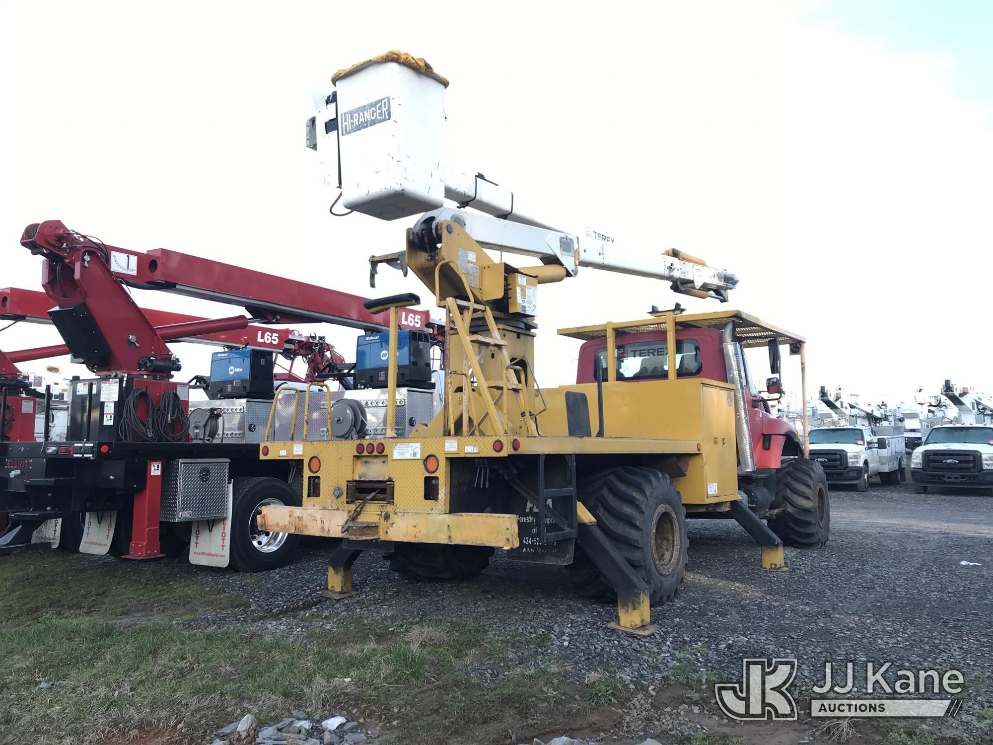 HiRanger XT60, 65 ft, Over-Center Bucket Truck s/n 2081038385, with single-man bucket & 4 hyd outriggers, rear mounted on 2010 International 7300 4x4 Flatbed Truck, 7.6L L6 Diesel, 6-spd, with front & rear winch, floatation tires, (58,918 miles) (Runs, Moves & Upper Operates) This is a Titled Item*