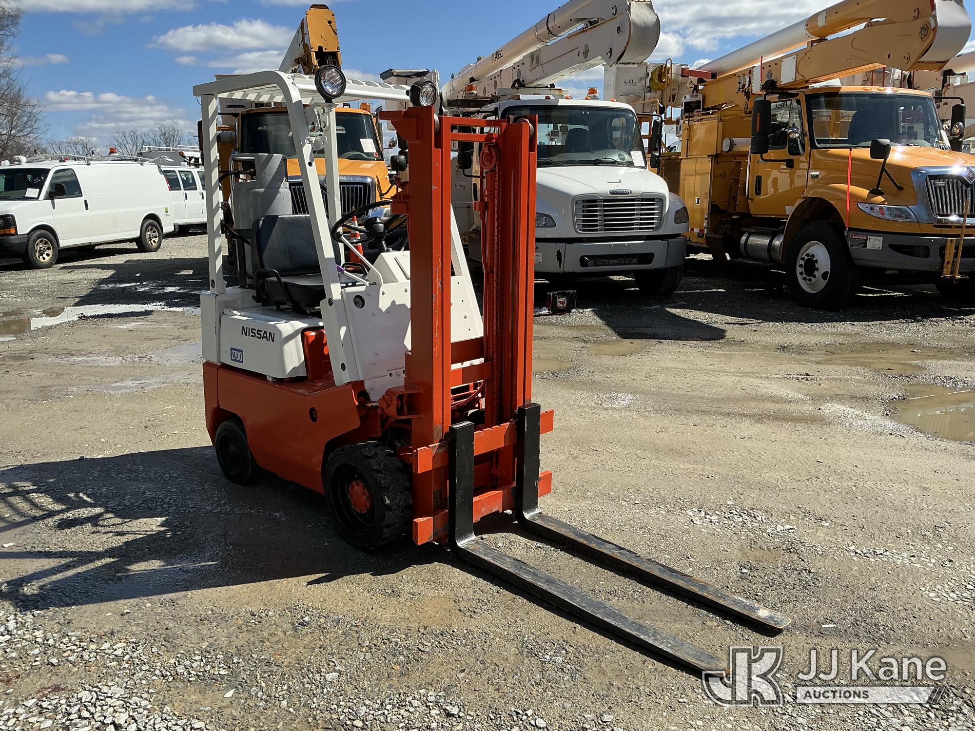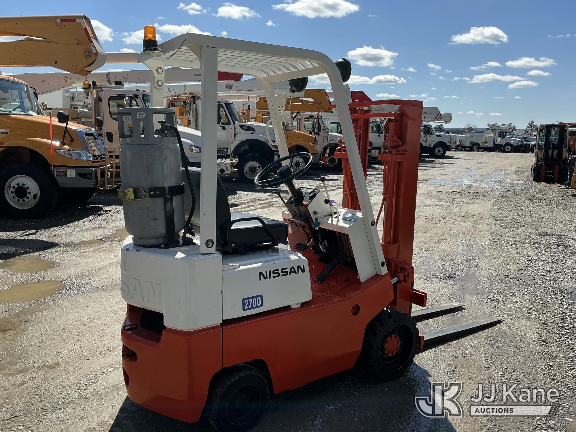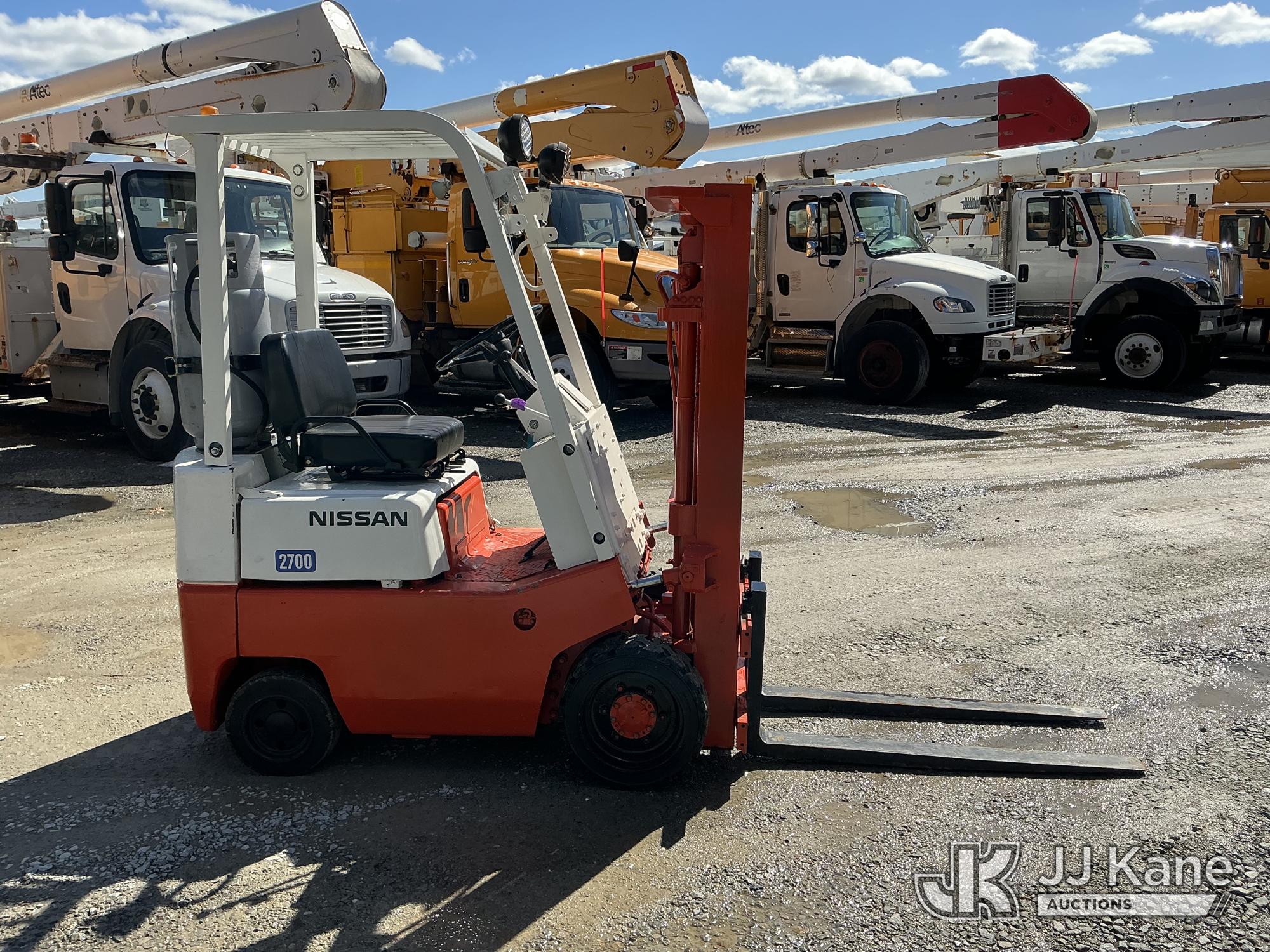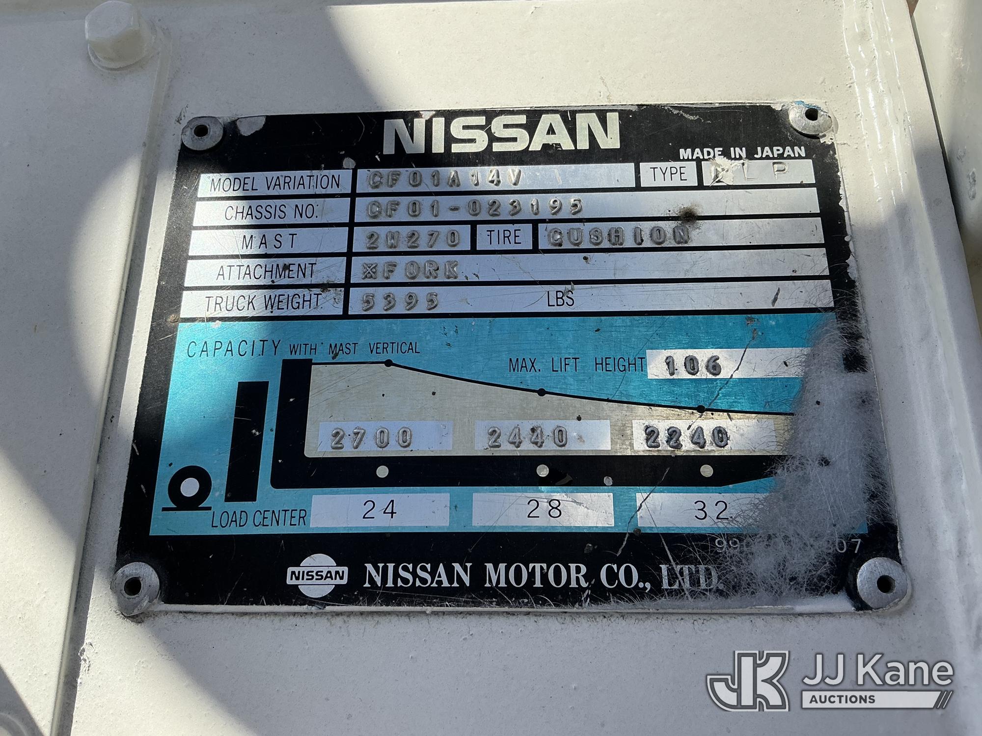 Nissan CF01A14V 2700 Solid Tired Forklift, s/n CF01-023195, Nissan LPG, Shuttle, with 2700 lb lift capacity, 106 max lift height & 4 ft. forks, (Runs, Moves & Operates) (LPG Tank Not Included In Sale) (Reads 5,107 hours)*