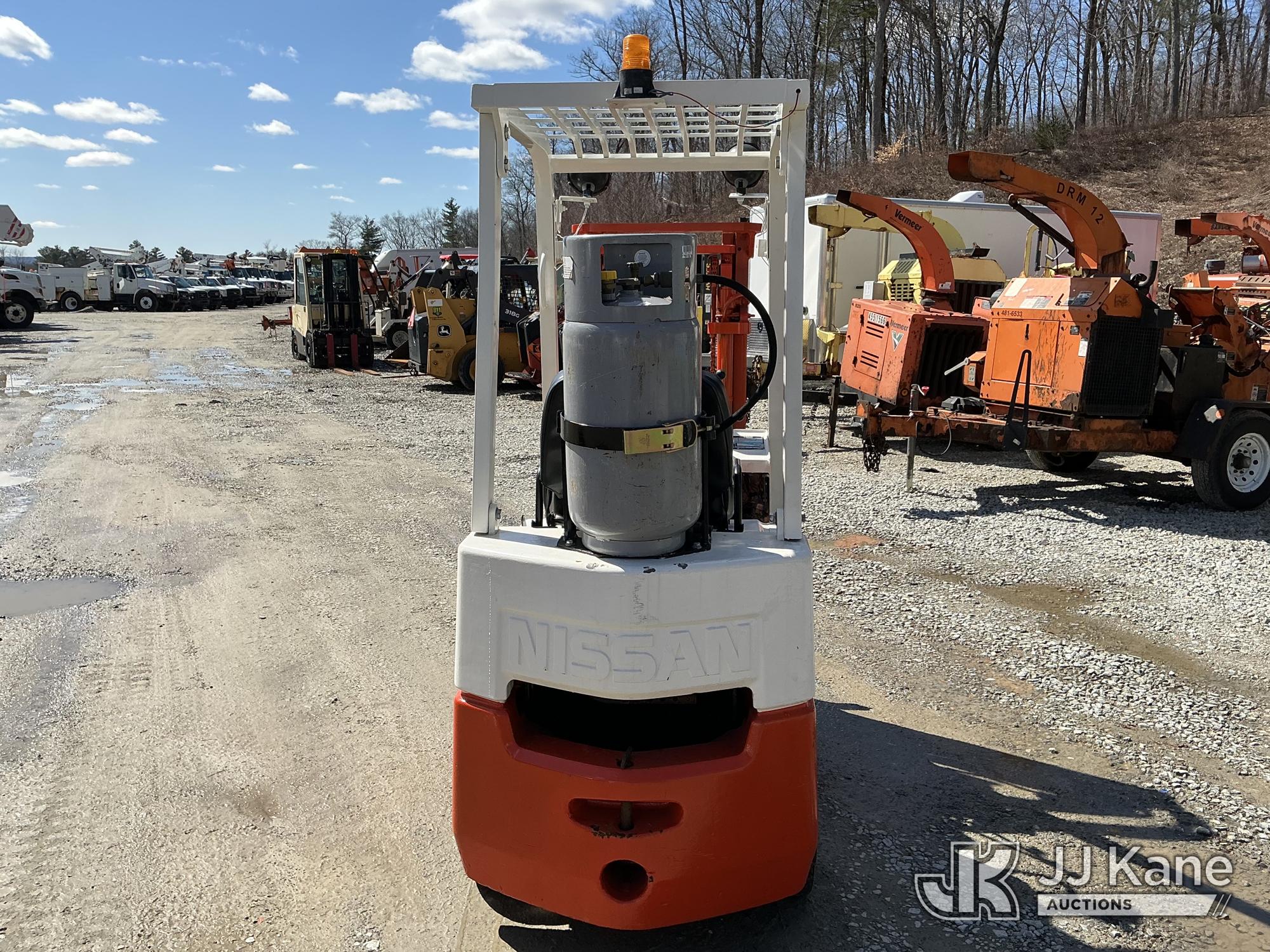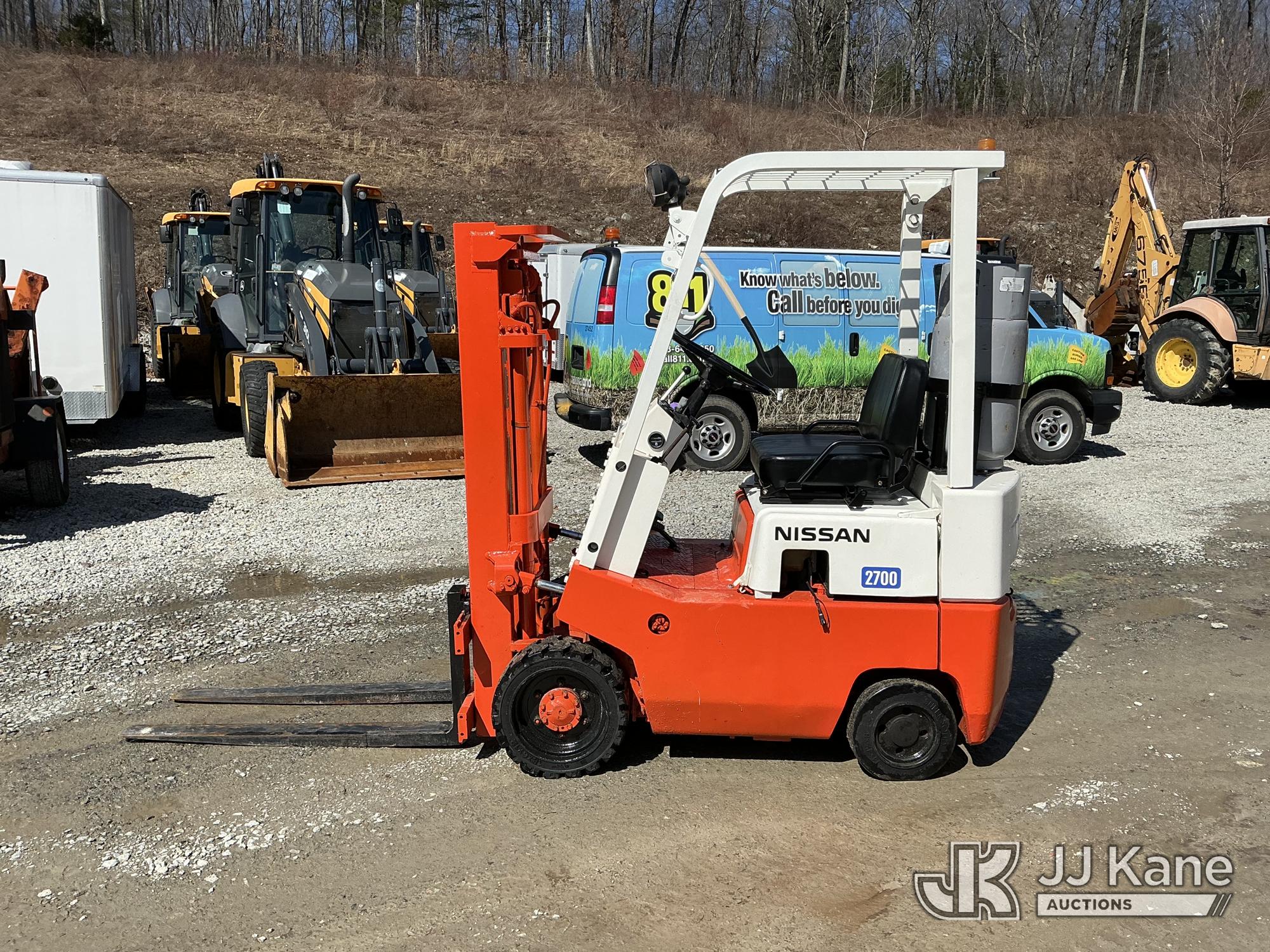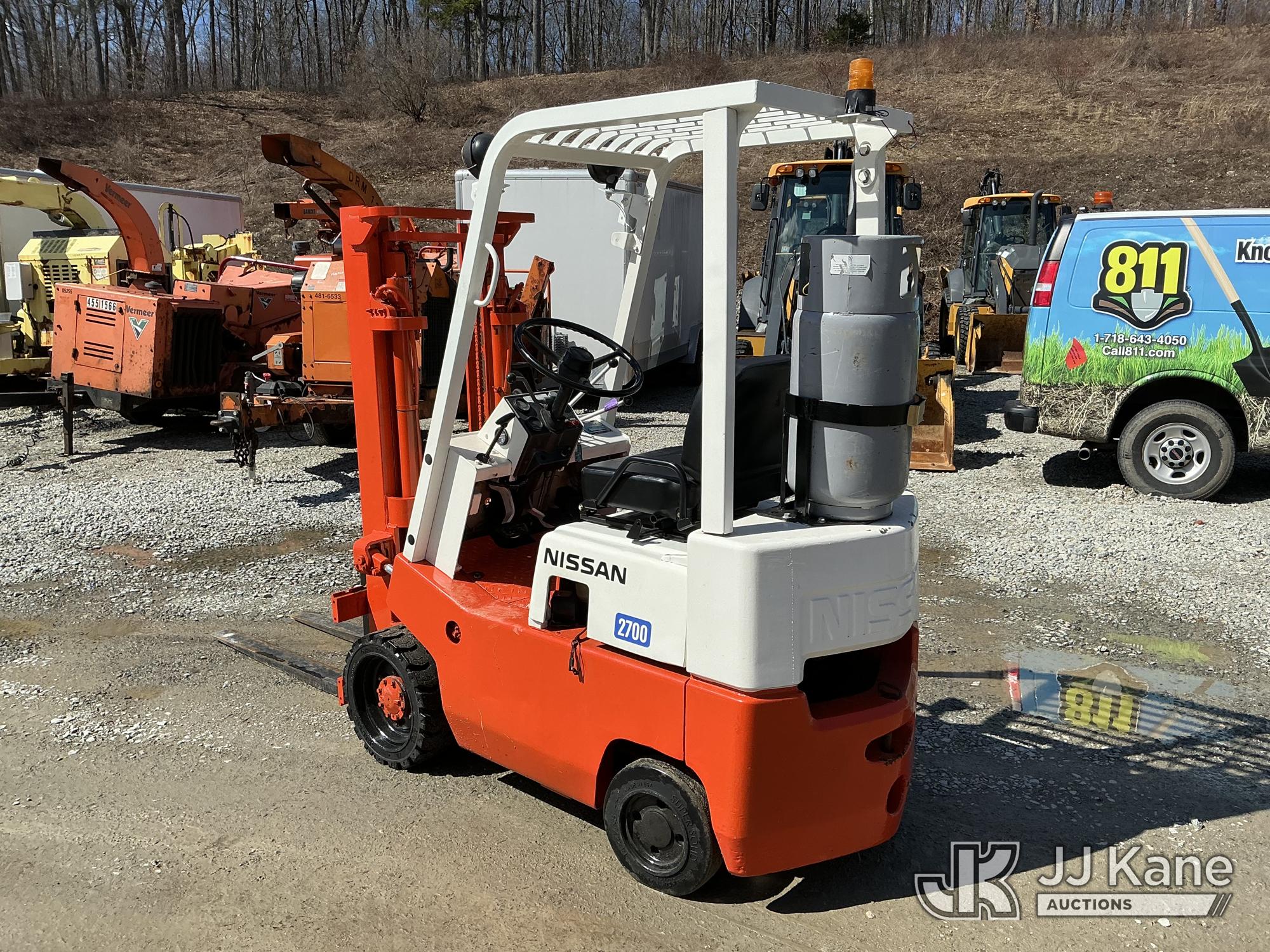 Nissan CF01A14V 2700 Solid Tired Forklift, s/n CF01-023195, Nissan LPG, Shuttle, with 2700 lb lift capacity, 106 max lift height & 4 ft. forks, (Runs, Moves & Operates) (LPG Tank Not Included In Sale) (Reads 5,107 hours)*