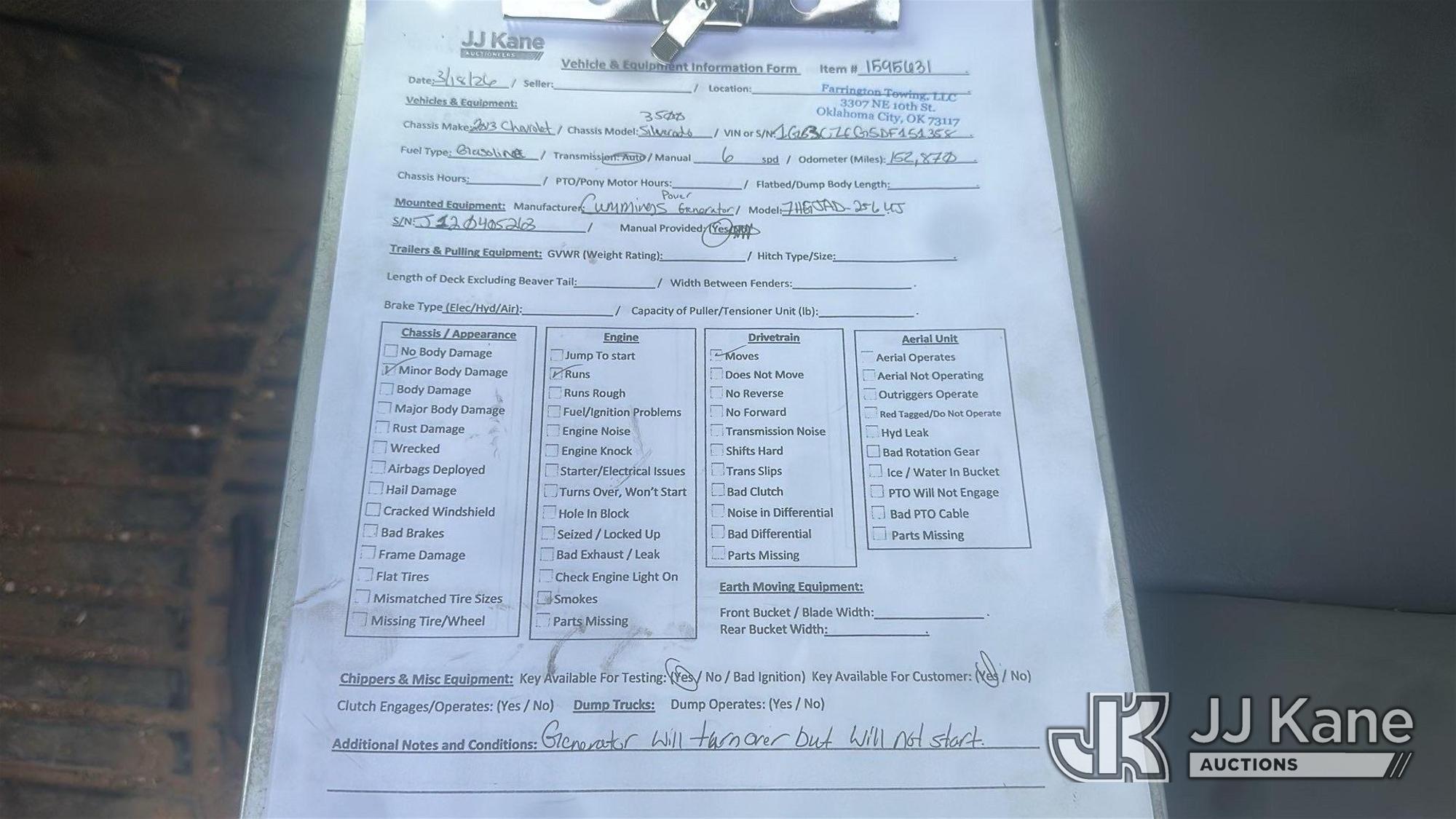 2013 Chevrolet Silverado 3500HD Enclosed Service Truck, 6.0L V8 OHV 16V FFV gas, RWD, 6-Speed Automatic, A/C, with generator, (152,870 miles) Element Lease Return (Runs & Moves) (Traction Control Light On, Generator Does Not Operate, Body/Paint Damage) This is a Titled Item*