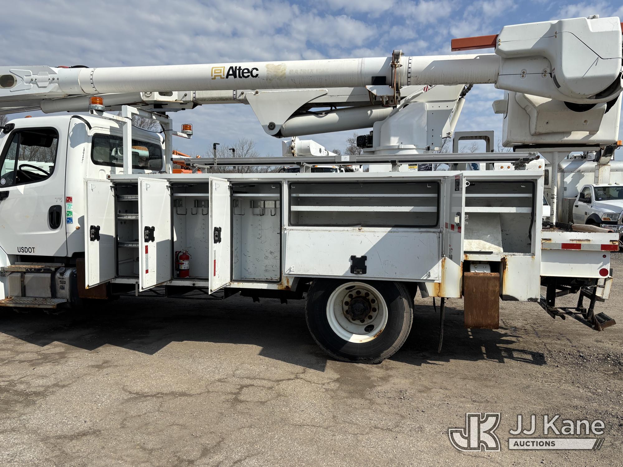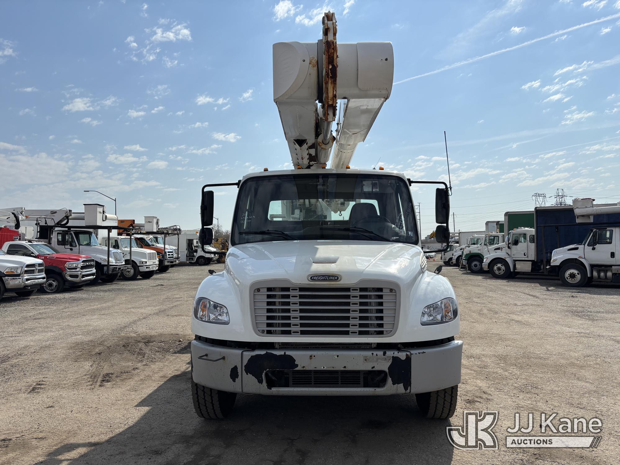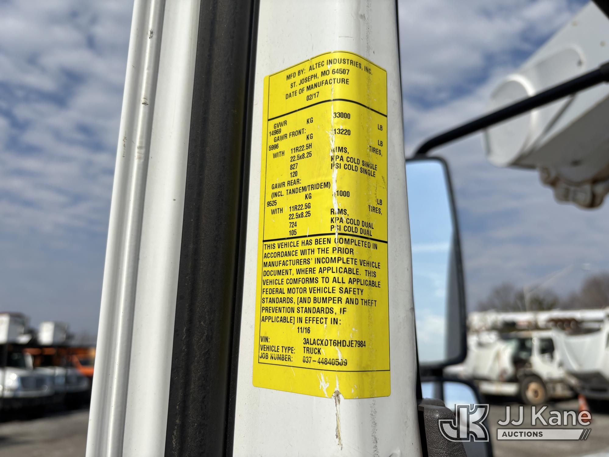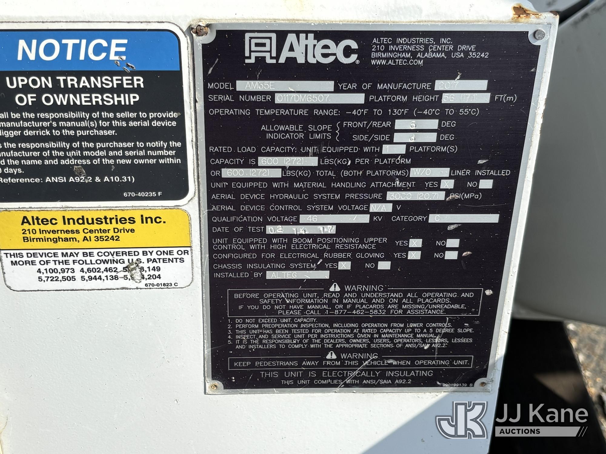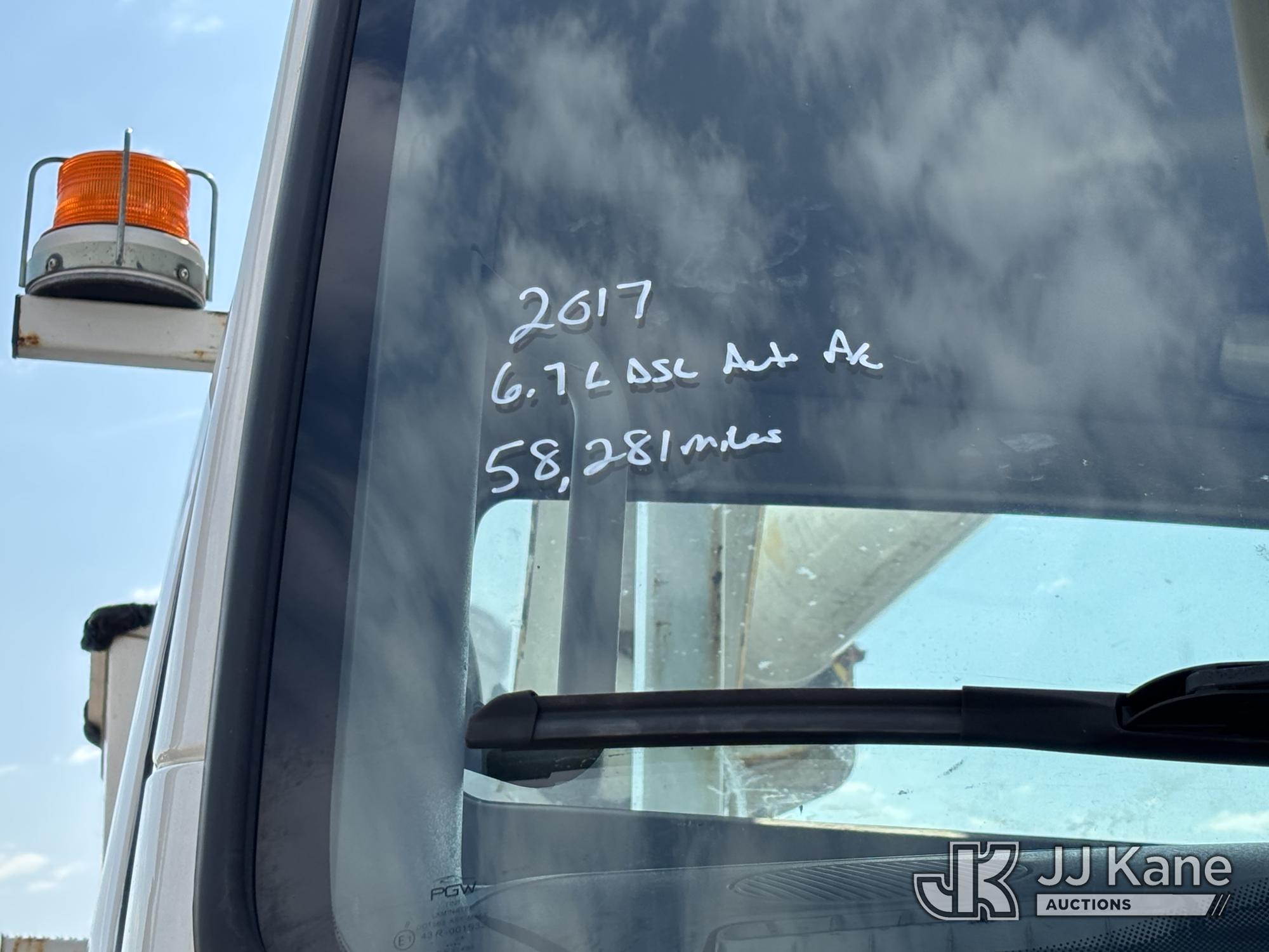 Altec AM55E-MH, 60 ft, Over-Center Material Handling Bucket Truck s/n 0117DM6507, with Two-Man Bucket & 4 Outriggers, rear mounted on 2017 Freightliner M2 106 Utility Truck, 6.7L diesel, 4X2, Auto, A/C, (58,281 miles) (Runs Moves & Upper Condition Unknown, Body & Rust Damage On Utility Body, Hydraulic Leak On Rear Lines, Don’t Operate PTO) This is a Titled Item*