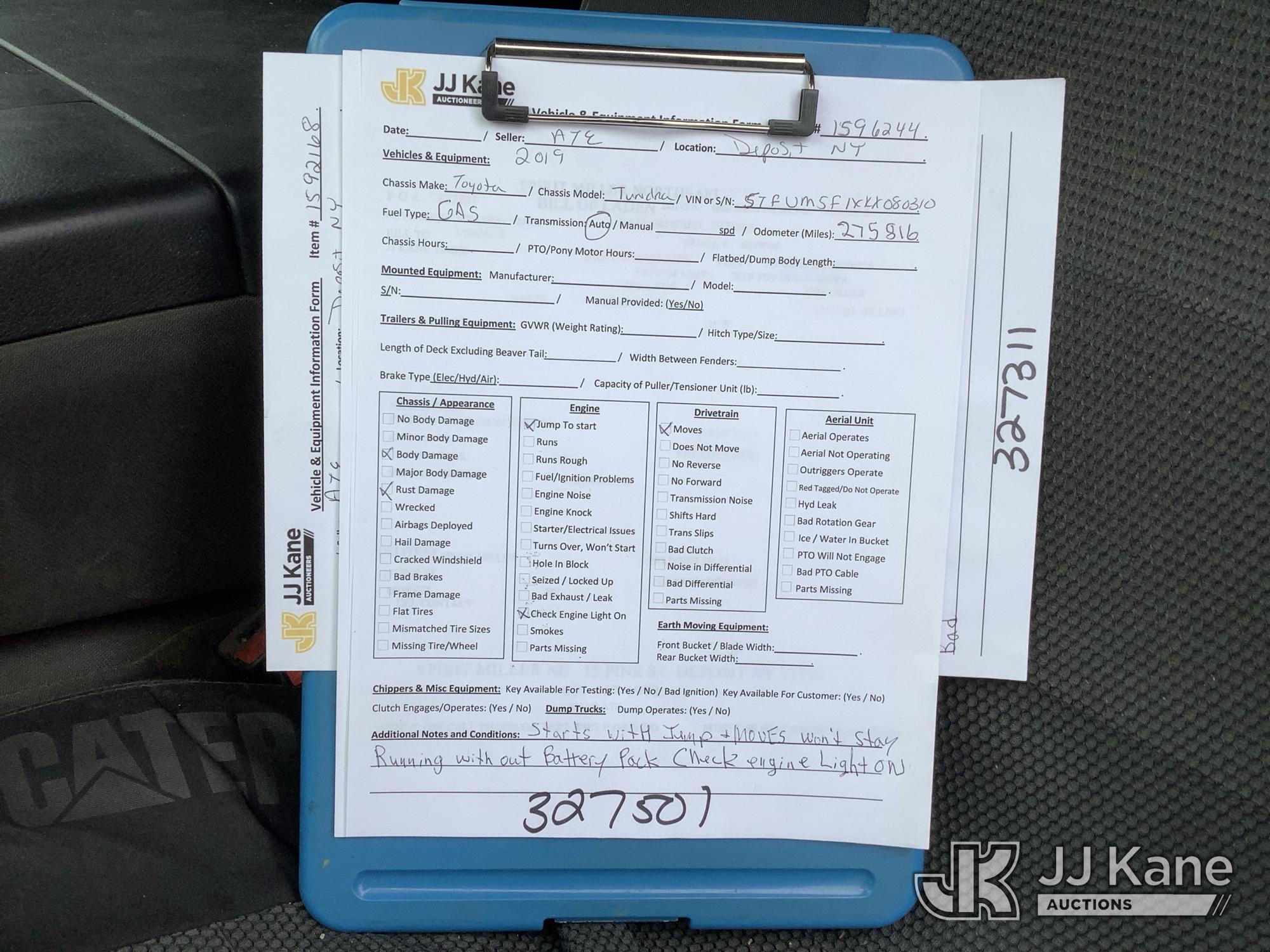2019 Toyota Tundra 4x4 Extended-Cab Pickup Truck, 4.6L V8 DOHC 32V Gas, Auto, A/C, (275,816 miles) (Runs & Moves) (Jump To Start, Won't Stay Running, Condition Unknown, Check Engine Light On, Body Damage) (Seller States: Transmission Issues) This is a Titled Item*