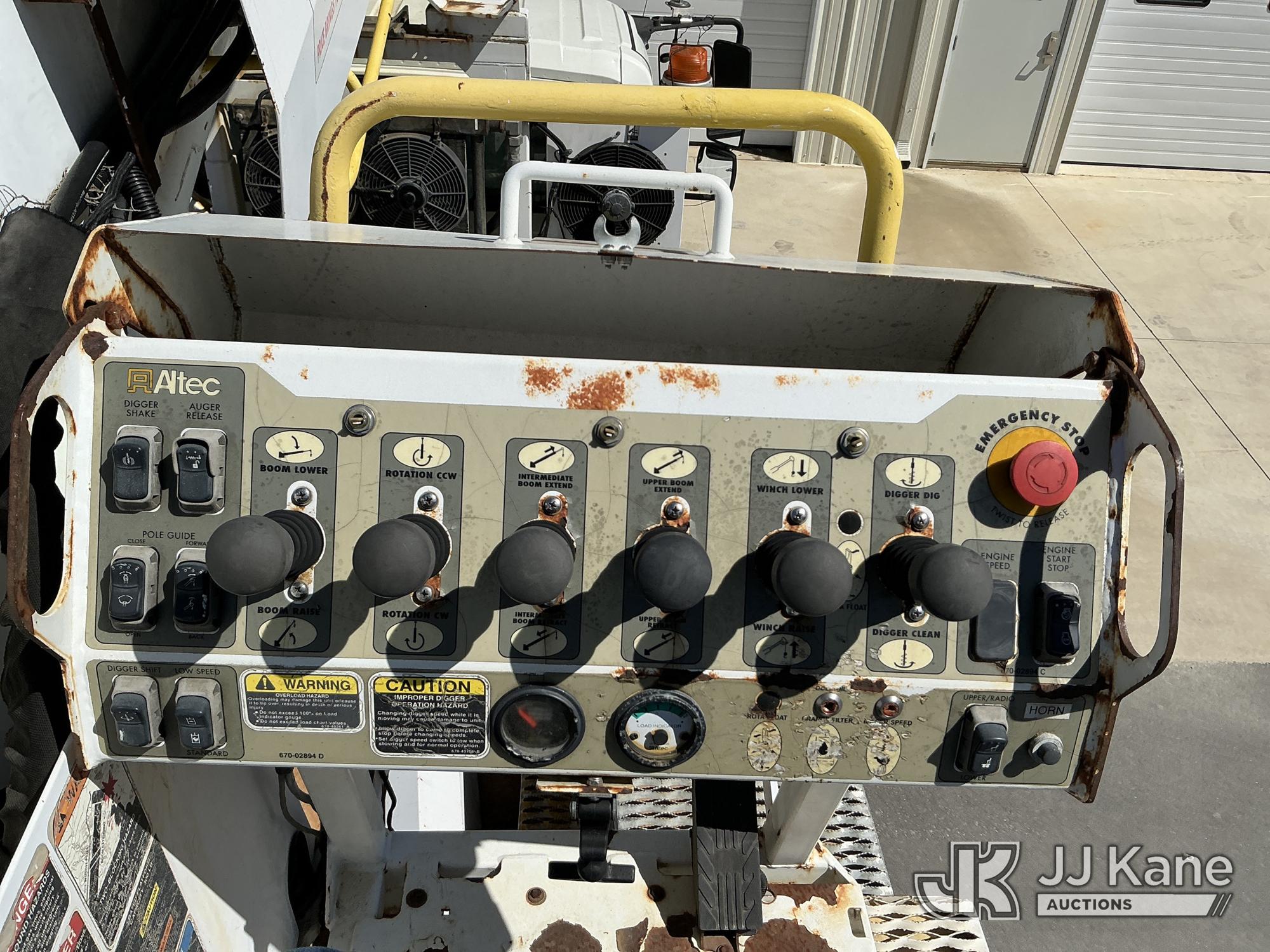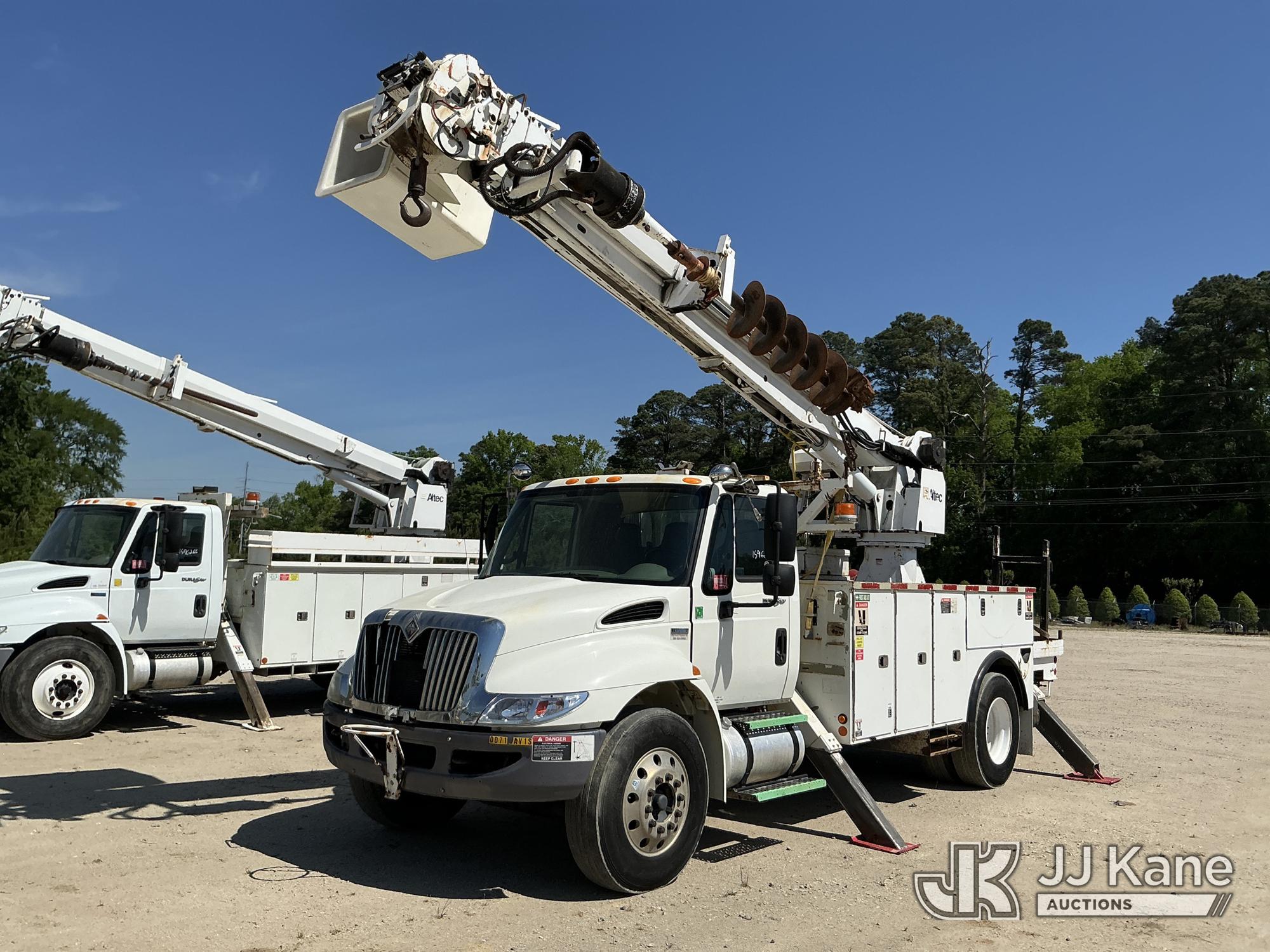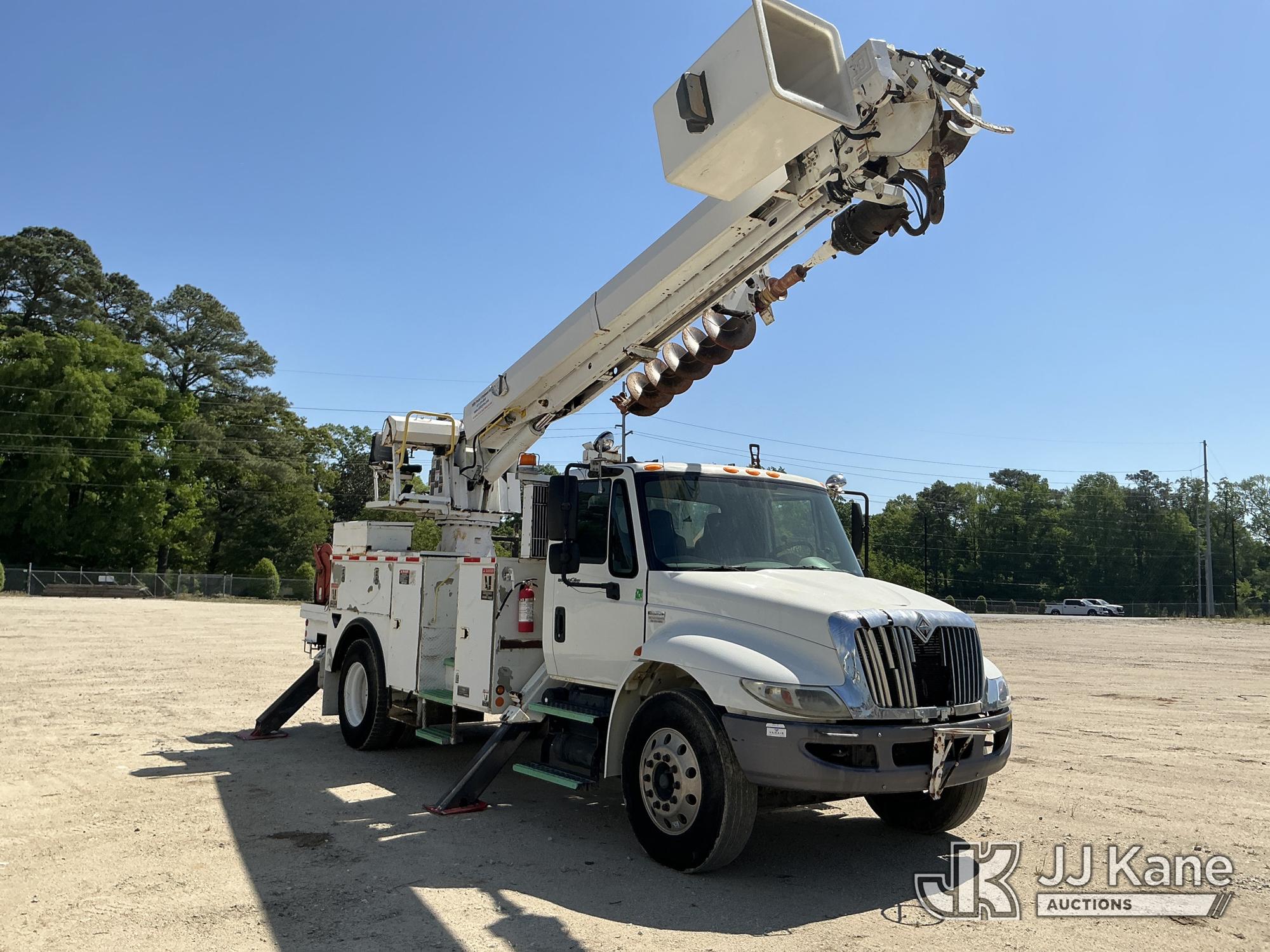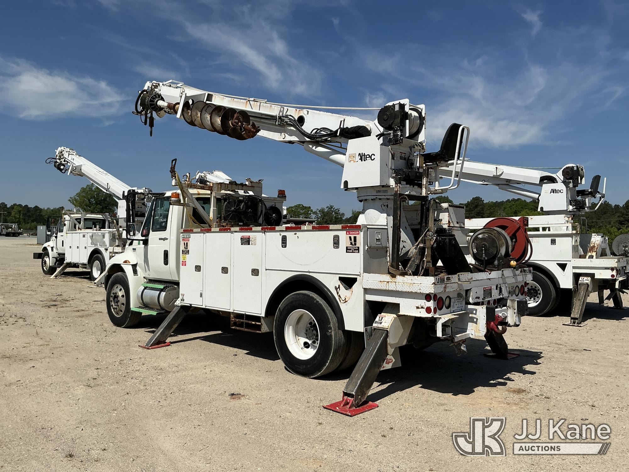 Altec DM47-TR, 12,340 Lb Digger Derrick s/n 0608DV3612, with 47 ft. sheave height, 3 section hydraulic boom, pin on bucket, upper controls, pole guides, heel winch, two speed auger, riding console & 4 hydraulic outriggers, rear mounted on 2009 International 4300 Utility Truck, MaxxForce 7.6L diesel, Auto, A/C, (108,535 miles) Windshield Replaced by Seller prior to Sale (Runs, Moves, Upper Operates, Missing Upper Data Plate, Upper Information verified by Manufacturer) This is a Titled Item*