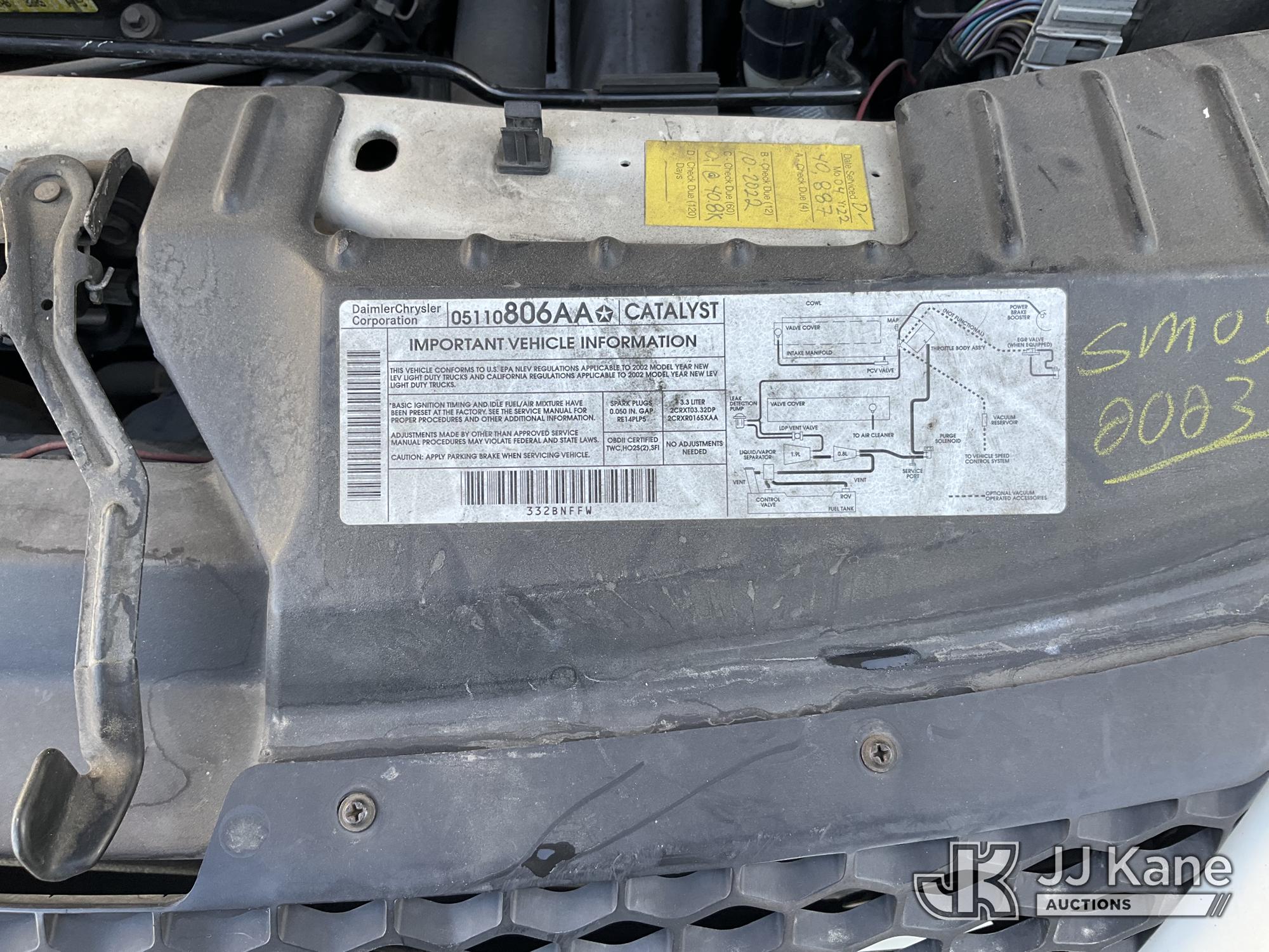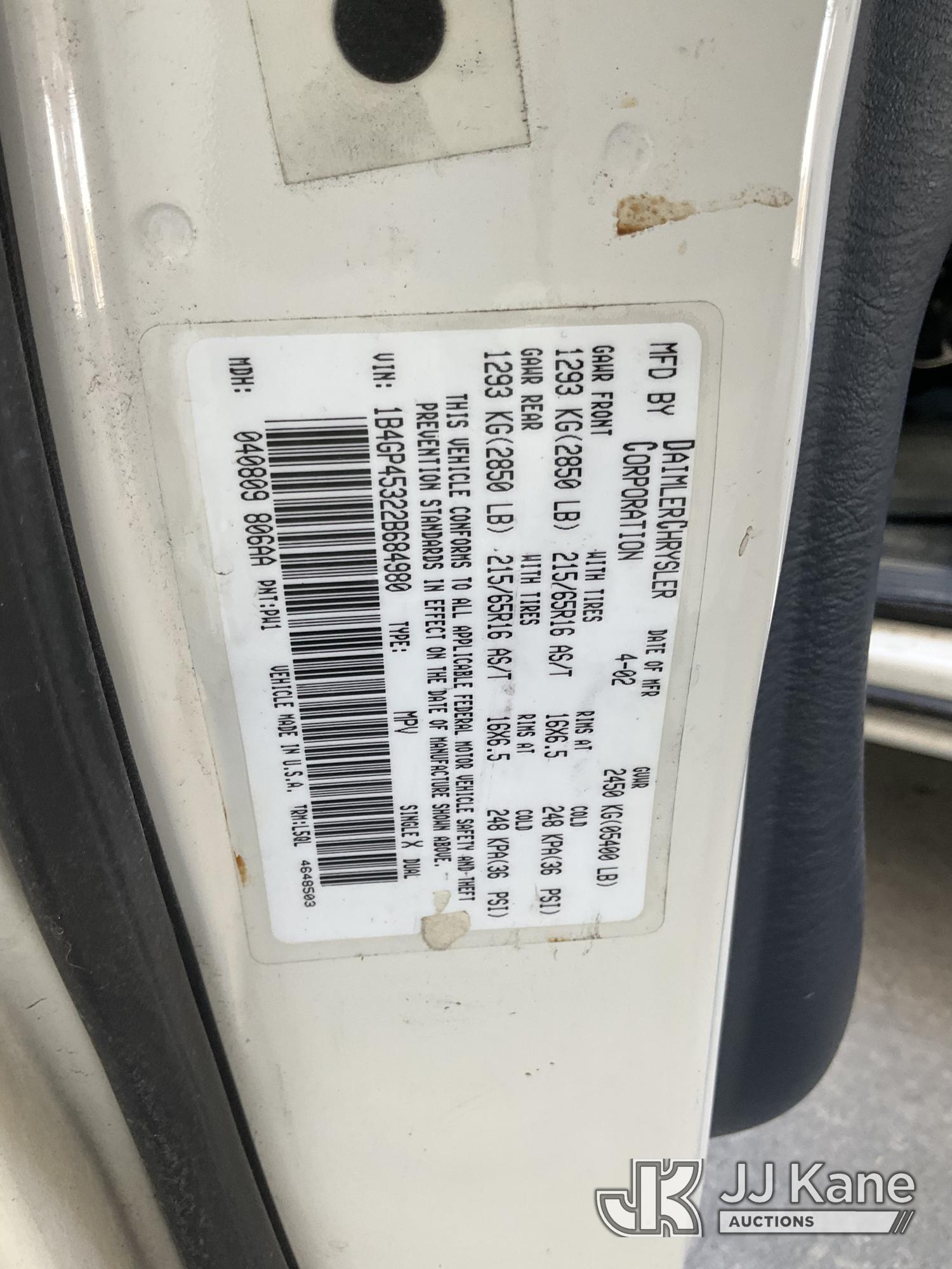 2002 Dodge Caravan Sport Mini Passenger Van, s/n 1B4GP45322B684980, 3.3L V6 OHV 12V FWD, FFV, 4-Speed Automatic, A/C, (Exempt from Odometer Disclosure - Reads 42,701 miles) (Runs & Moves, Missing Mid Row Seats)(Vehicle previously used with a 'cold plate' or protected record registration. Due to the prior status, VIN may not appear in NMVTIS, which could affect DMV title/registration processing. Buyer acknowledges and accepts this) This is a Titled Item*
