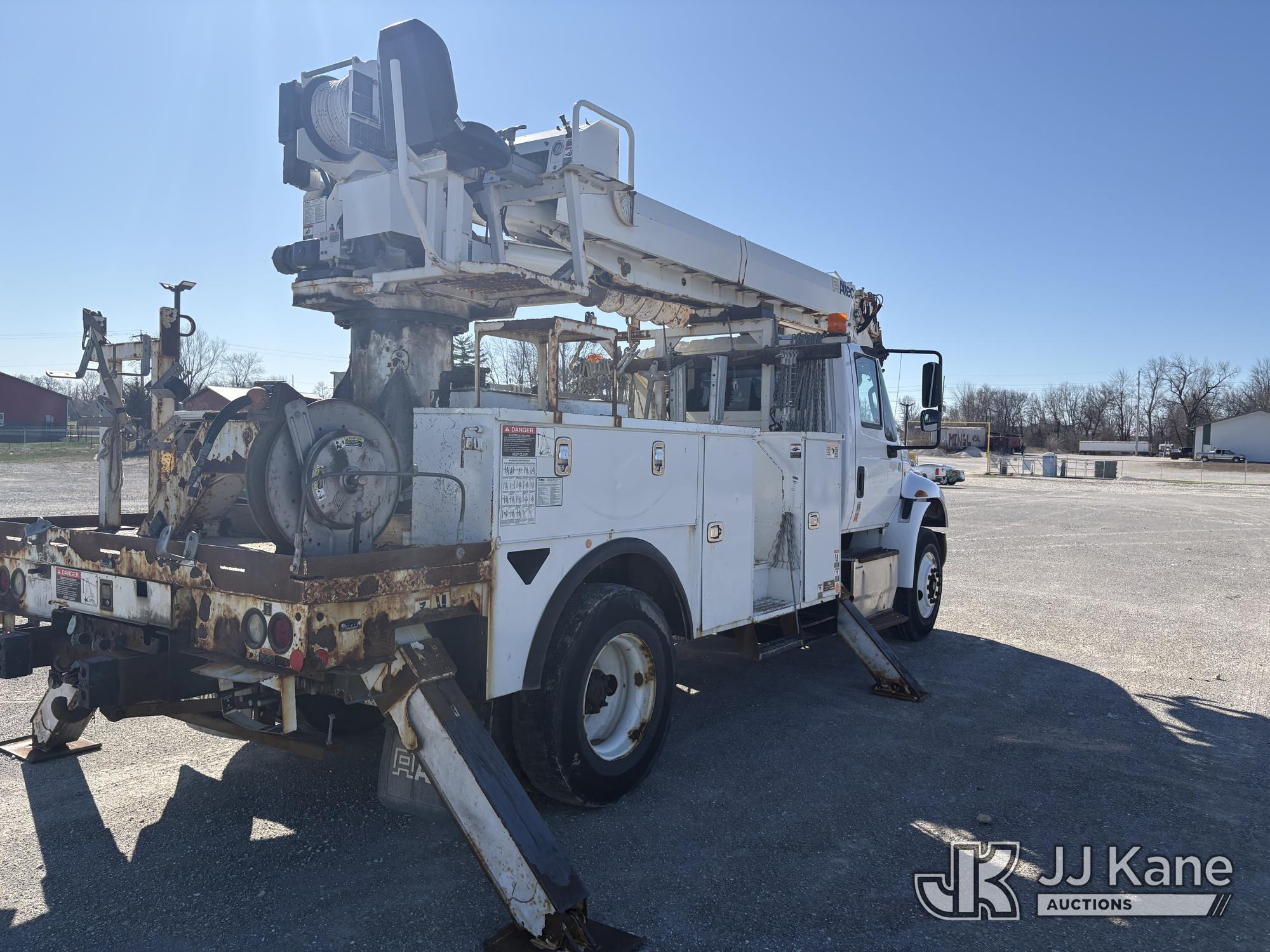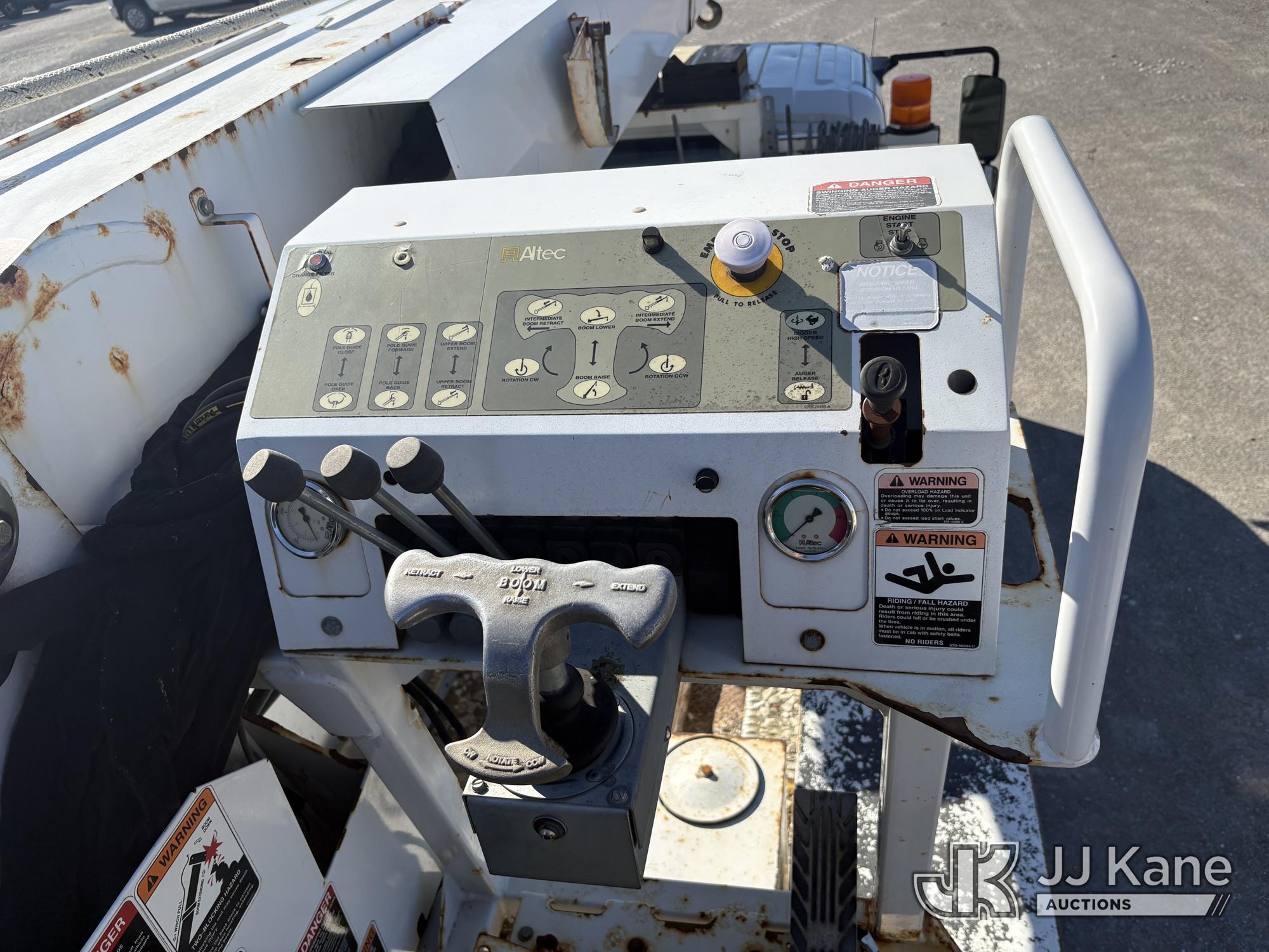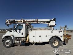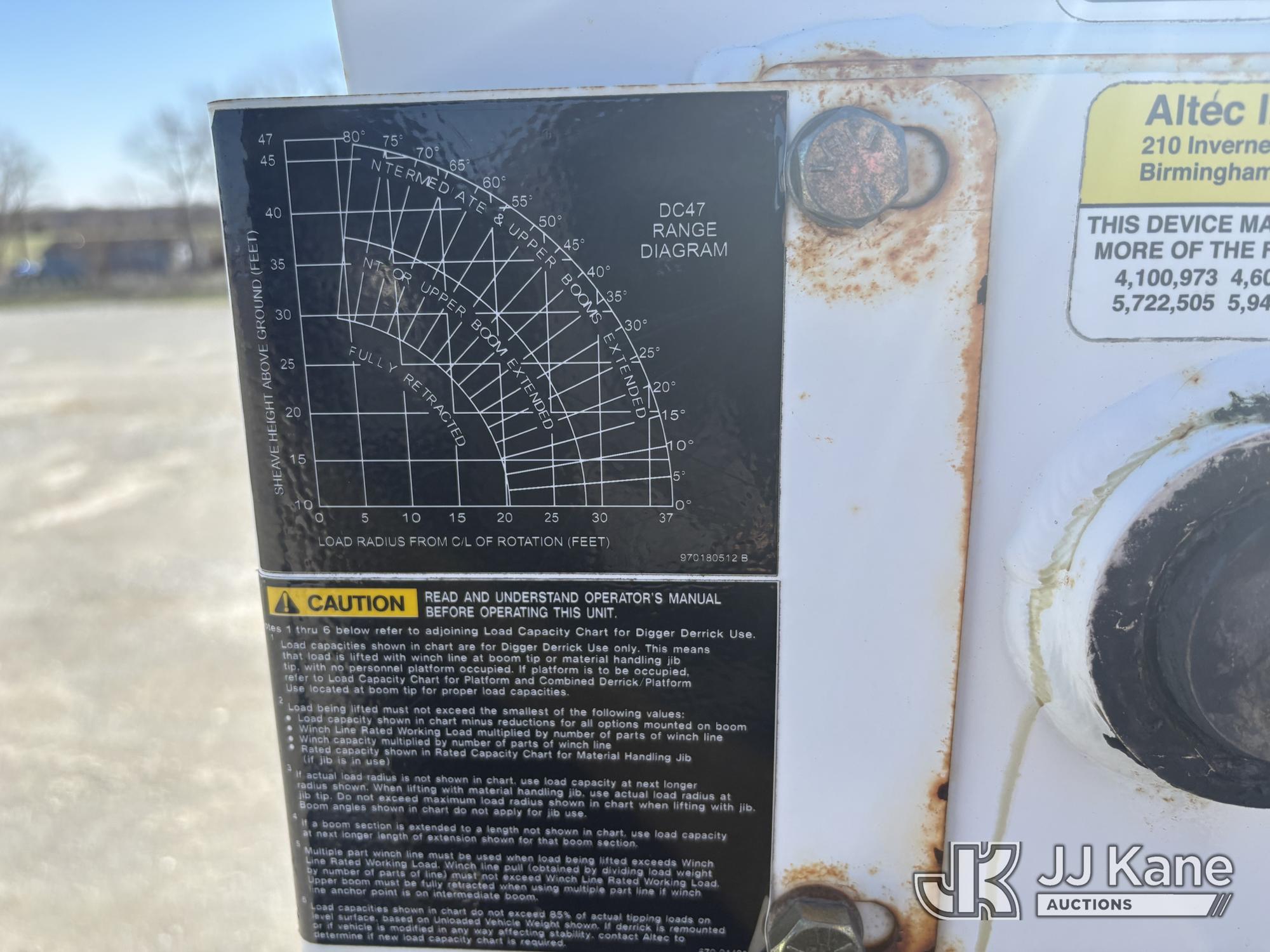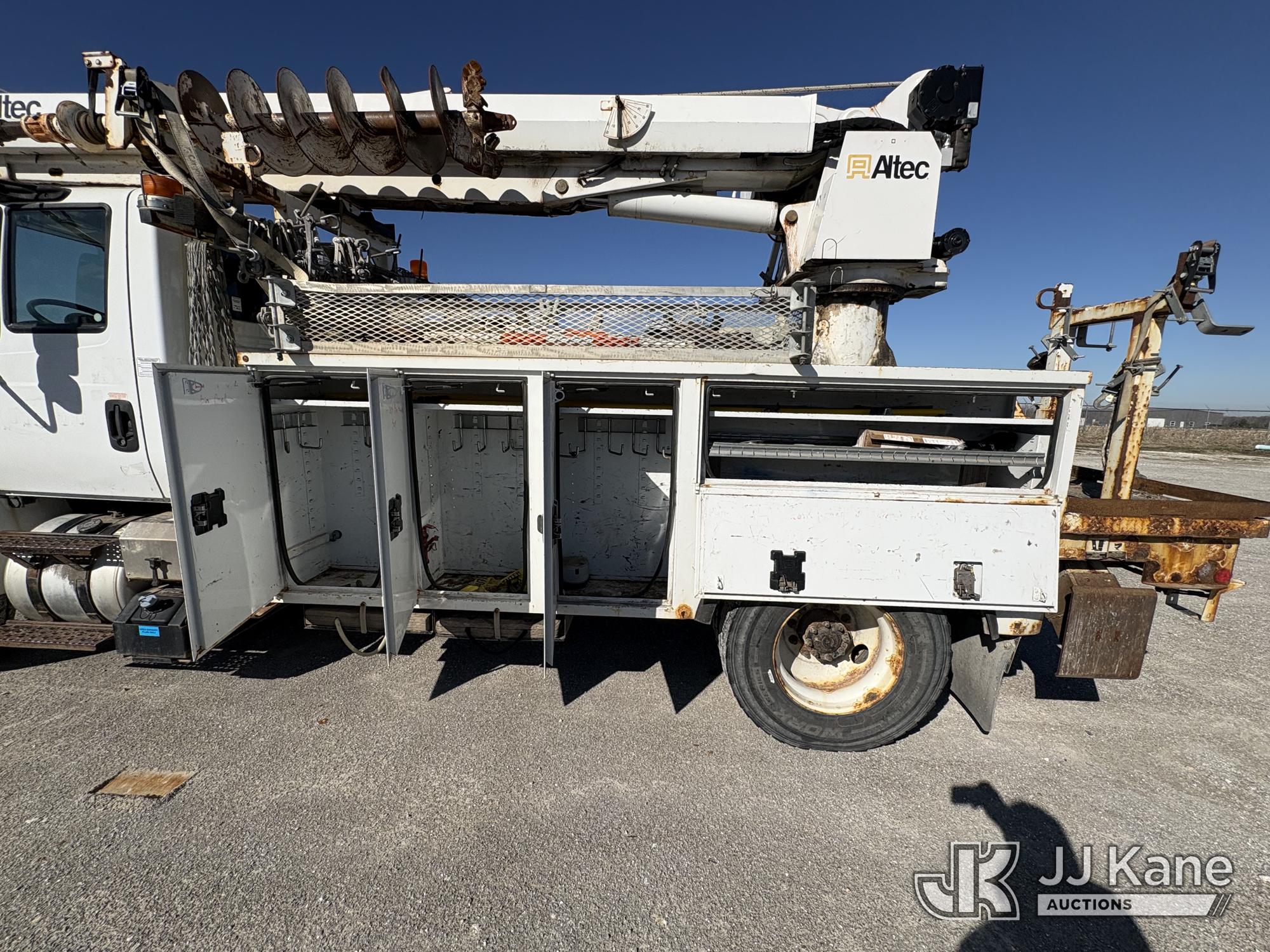 Altec DC47-TR, 23,790 Lb Digger Derrick s/n 1216FU2182, with 47 ft sheave height, 2 spd digger, heel winch, pole grabs, upper controls & riding console, rear mounted on 2018 International DuraStar 4300 Utility Truck, Cummins 4X2, DIESEL, Auto, A/C, (104,527 miles) (Runs, Moves, PTO engages, Outriggers Operate, Upper Unit Not Operating) (Unknown Upper Unit Operating Condition, Will Not Function At Controls, Key Broken Off In Ignition, Rust Damage, Paint Damage) (Reads 13,307 hours) This is a Titled Item*