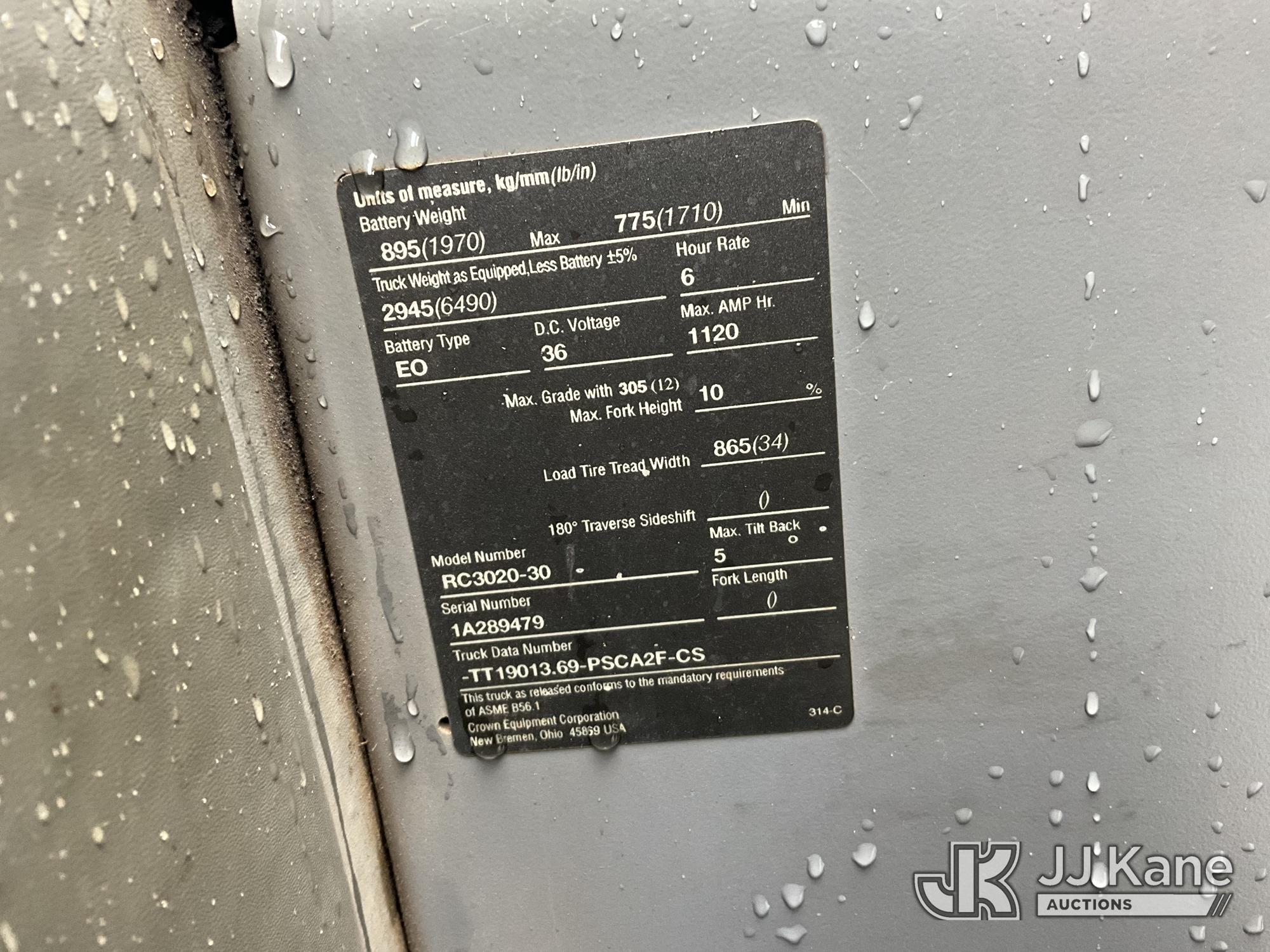 2005 Crown RC3020-30 Rubber Tired Forklift, s/n 1A289479, Battery electric, Hydraulic Drive, with 3,000 lb lift capacity, 8 ft. max lift height & 42 in. forks, (Not Operating, Condition Unknown) (Reads 1,130 hours)*