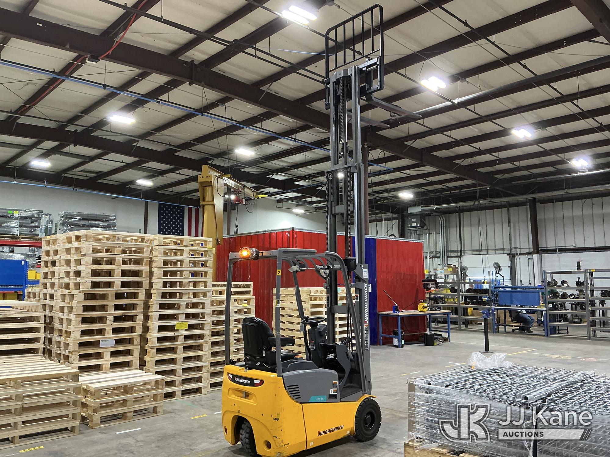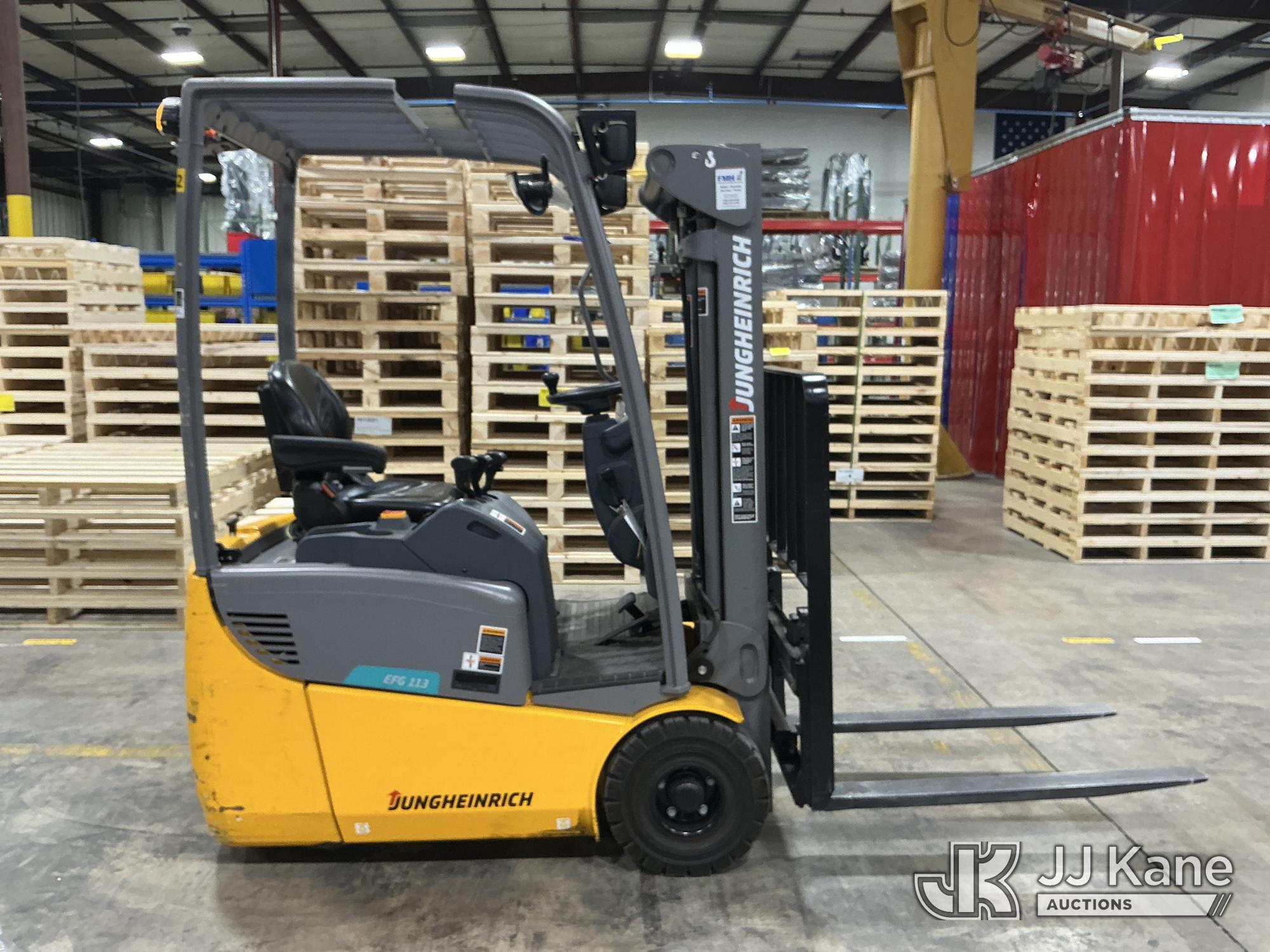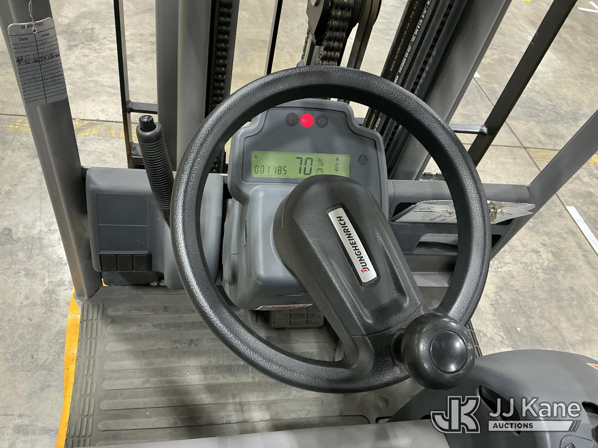 2020 Jungheinrich EFG113 Solid Tired Forklift, s/n FN621640, electric, with 2640lb Lift Capacity, Two Tier Mast, ROPS, charger included, (Runs, Moves & Operates) (Hyd Leak From Underneath) (Reads 1,185 hours)*