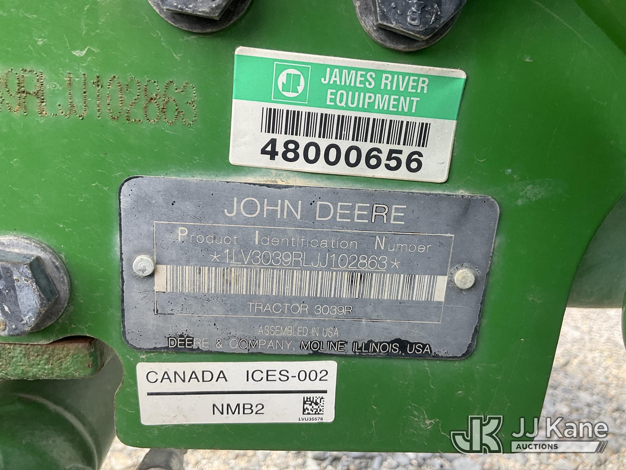 2018 John Deere 3039R Rubber Tired Utility Tractor, s/n 1LV3039RLJJ102863, John Deere diesel, Hydrostatic, with aux hyd, 540 PTO, 3 point hitch & ROPS post, 3039R (Runs, Moves & Operates ) (Reads 302 hours)*