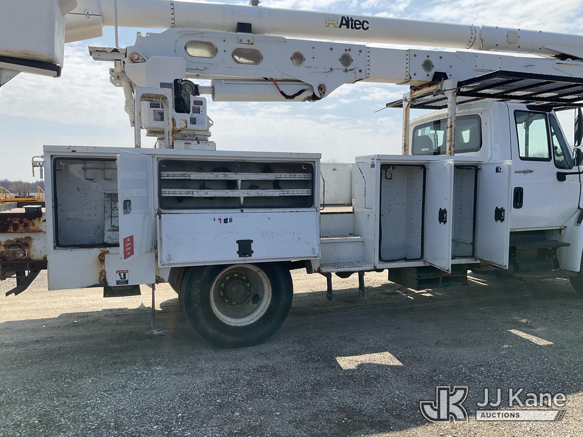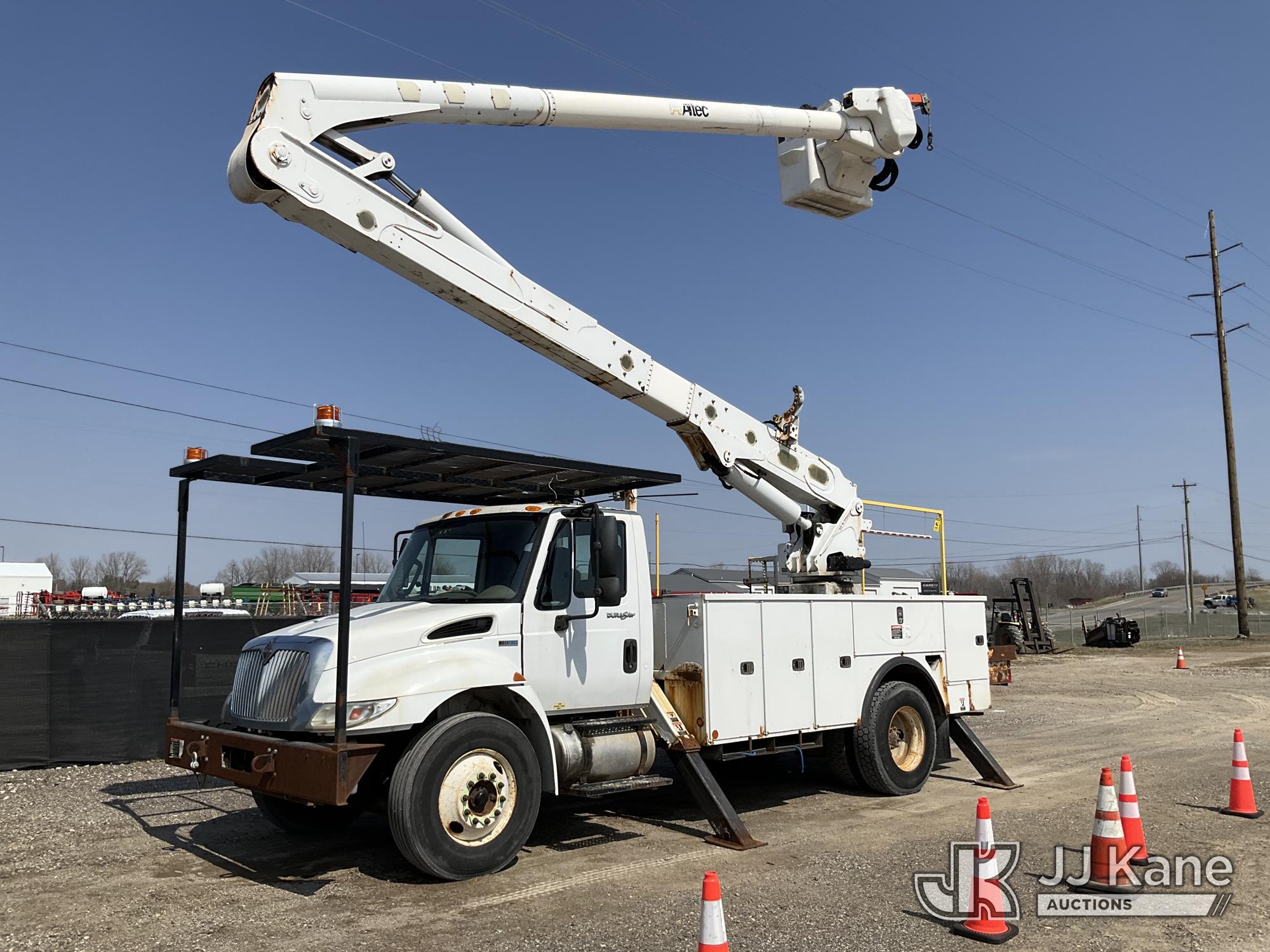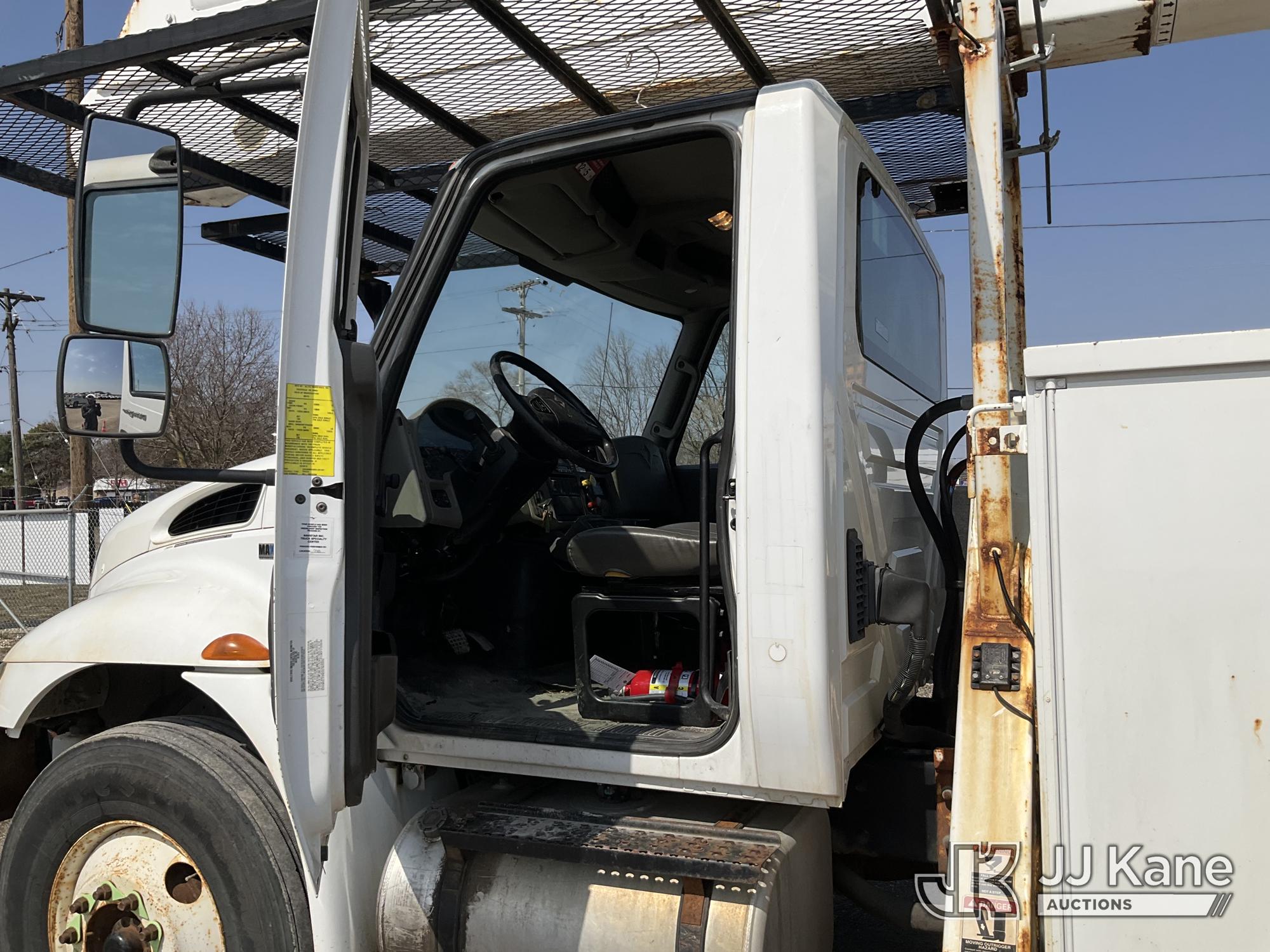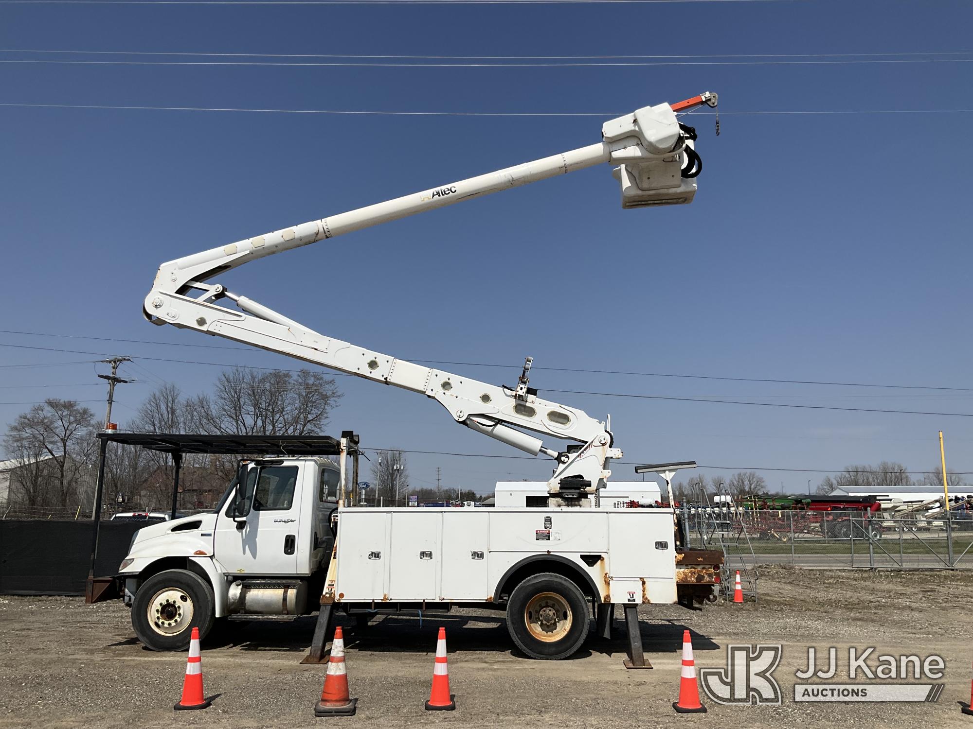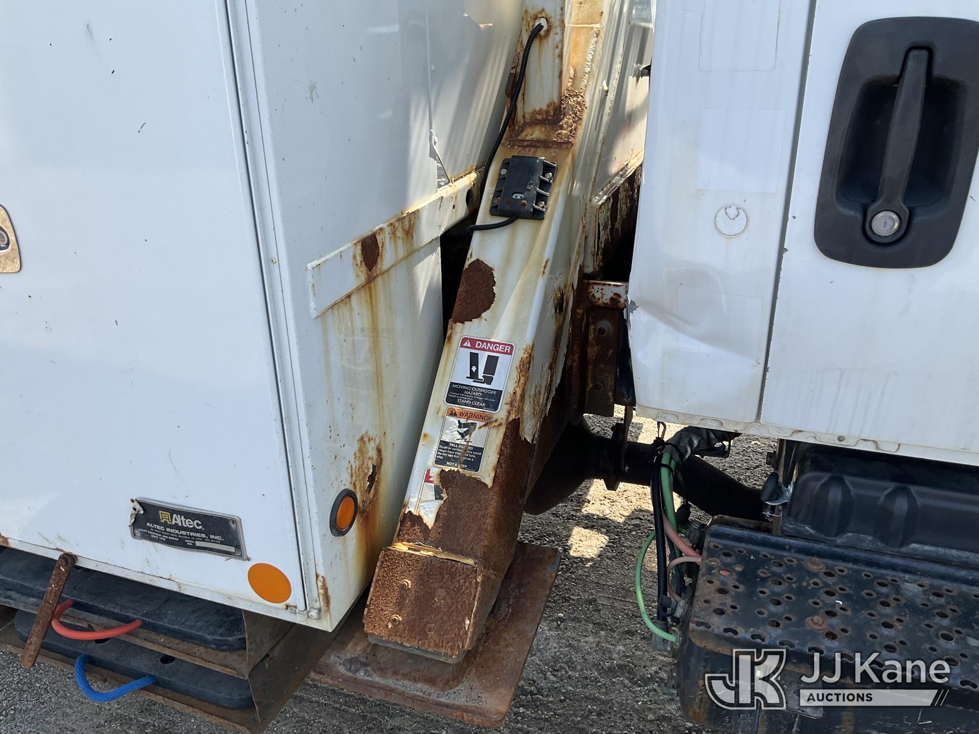 Altec AA55-MH, 60 ft, Material Handling Bucket Truck s/n 0313FH0411, with two man bucket, material handling jib, four hydraulic outriggers, rear mounted on 2014 International DuraStar 4300 Utility Truck, 7.6L L6 DIESEL 4X2, Auto, A/C, (90,630 miles) (Runs, Moves & Upper Operates) (Rust) (Reads 11,451 hours) This is a Titled Item*