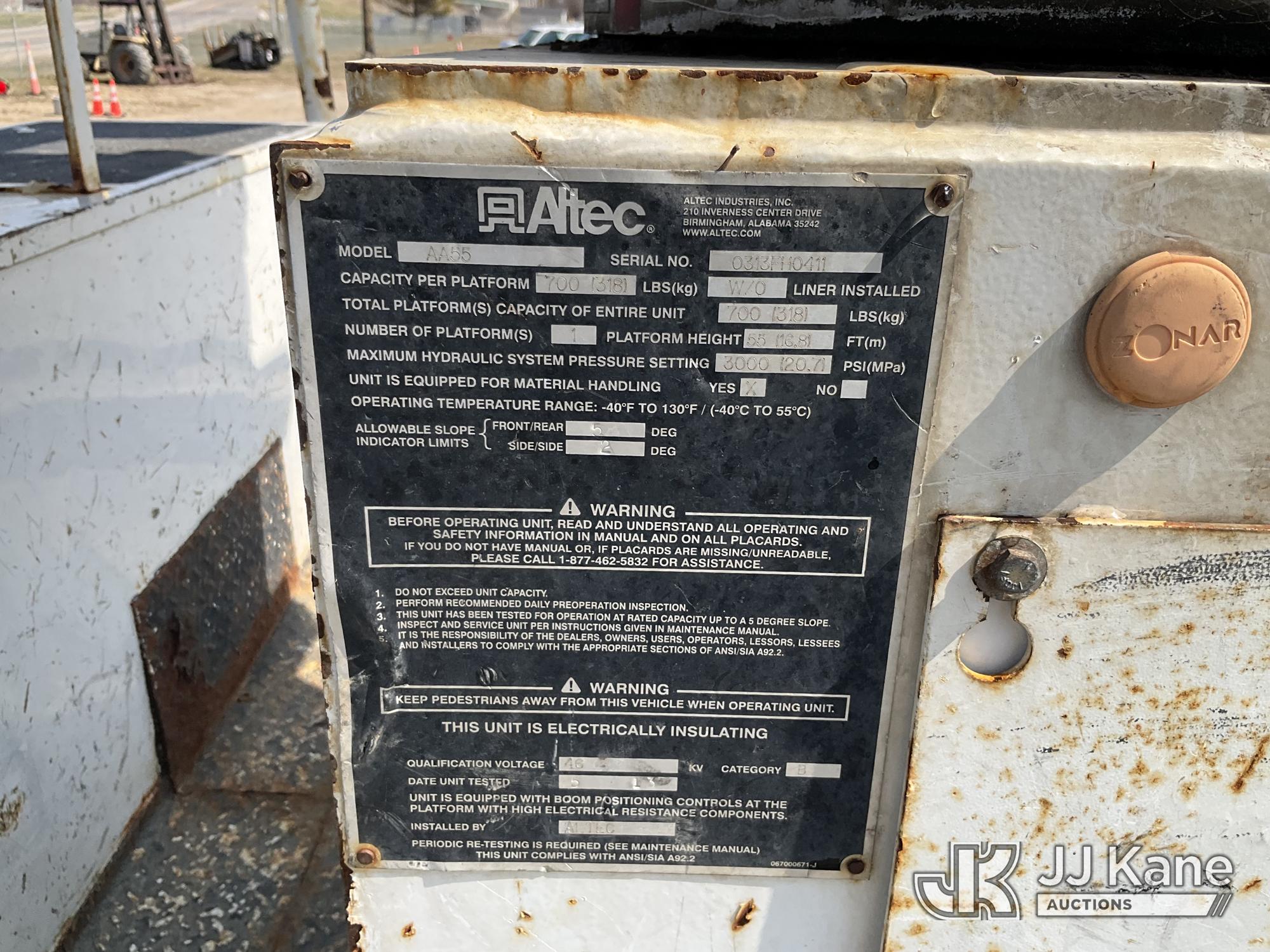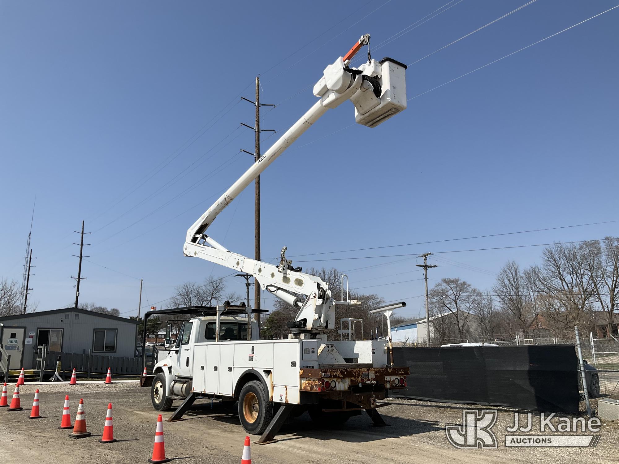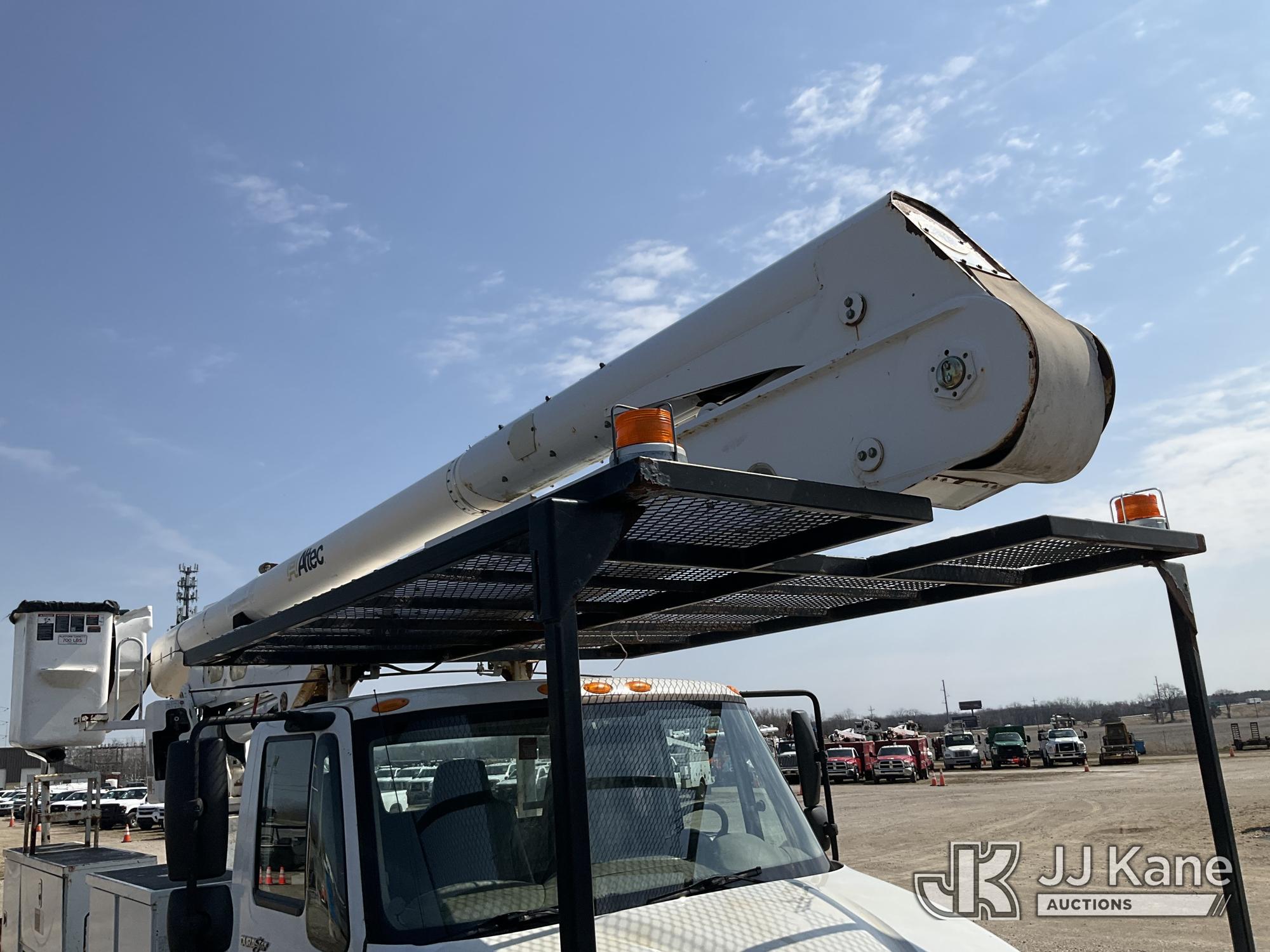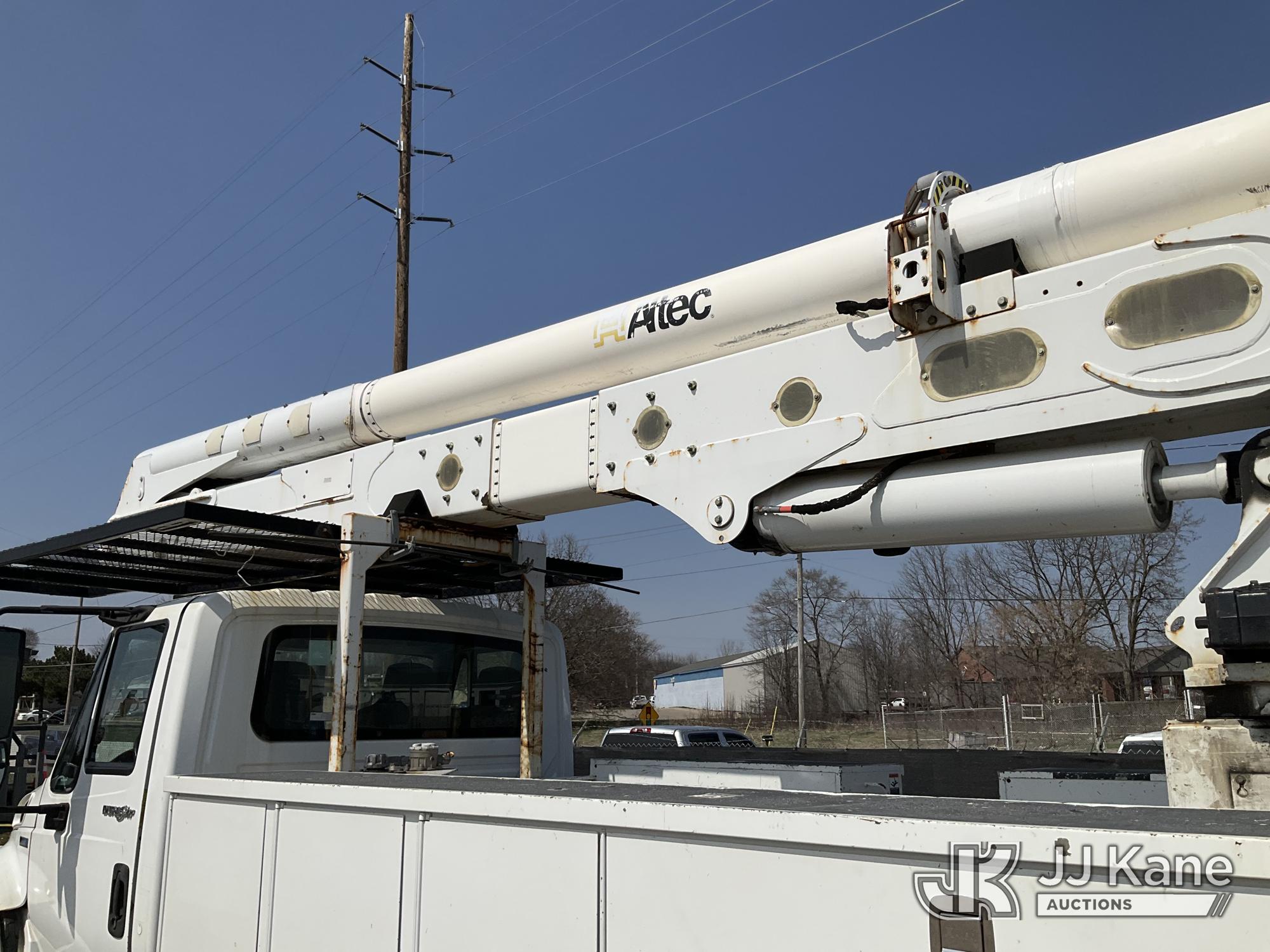 Altec AA55-MH, 60 ft, Material Handling Bucket Truck s/n 0313FH0411, with two man bucket, material handling jib, four hydraulic outriggers, rear mounted on 2014 International DuraStar 4300 Utility Truck, 7.6L L6 DIESEL 4X2, Auto, A/C, (90,630 miles) (Runs, Moves & Upper Operates) (Rust) (Reads 11,451 hours) This is a Titled Item*