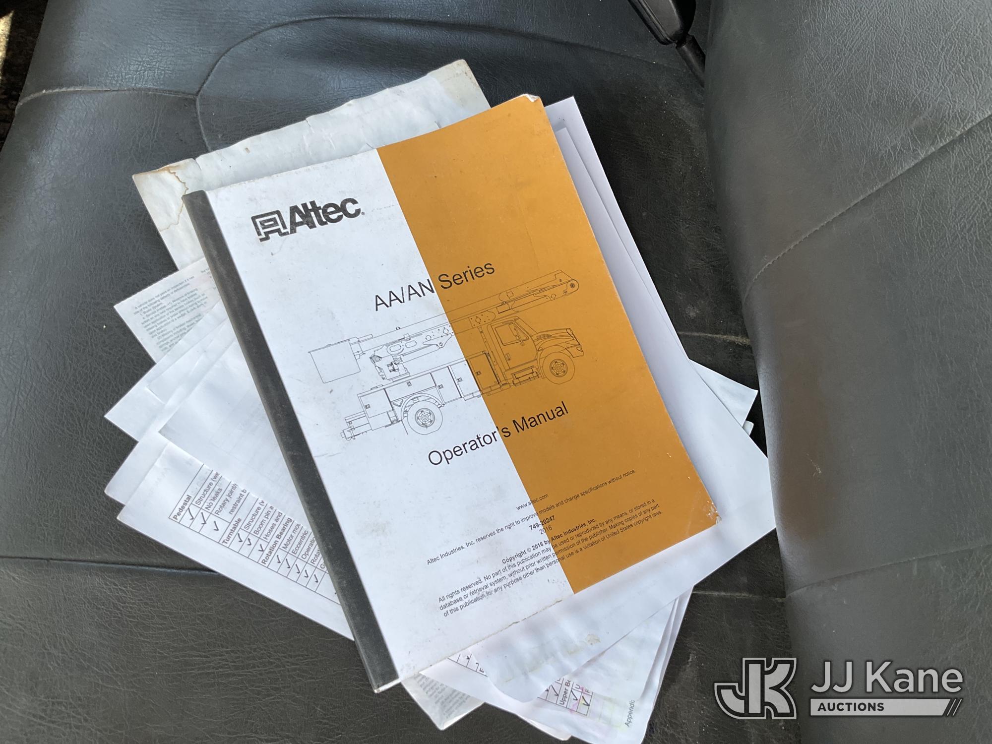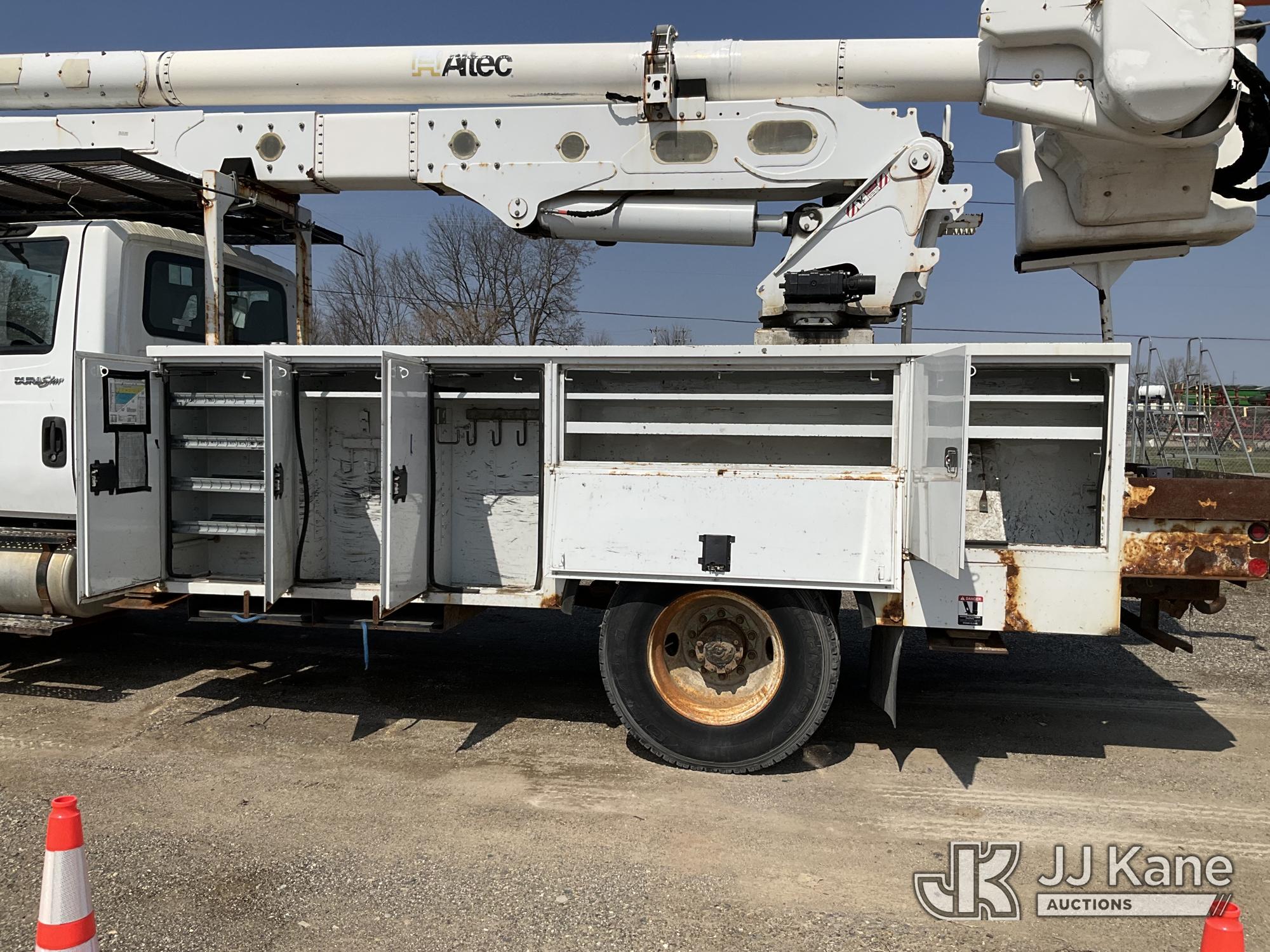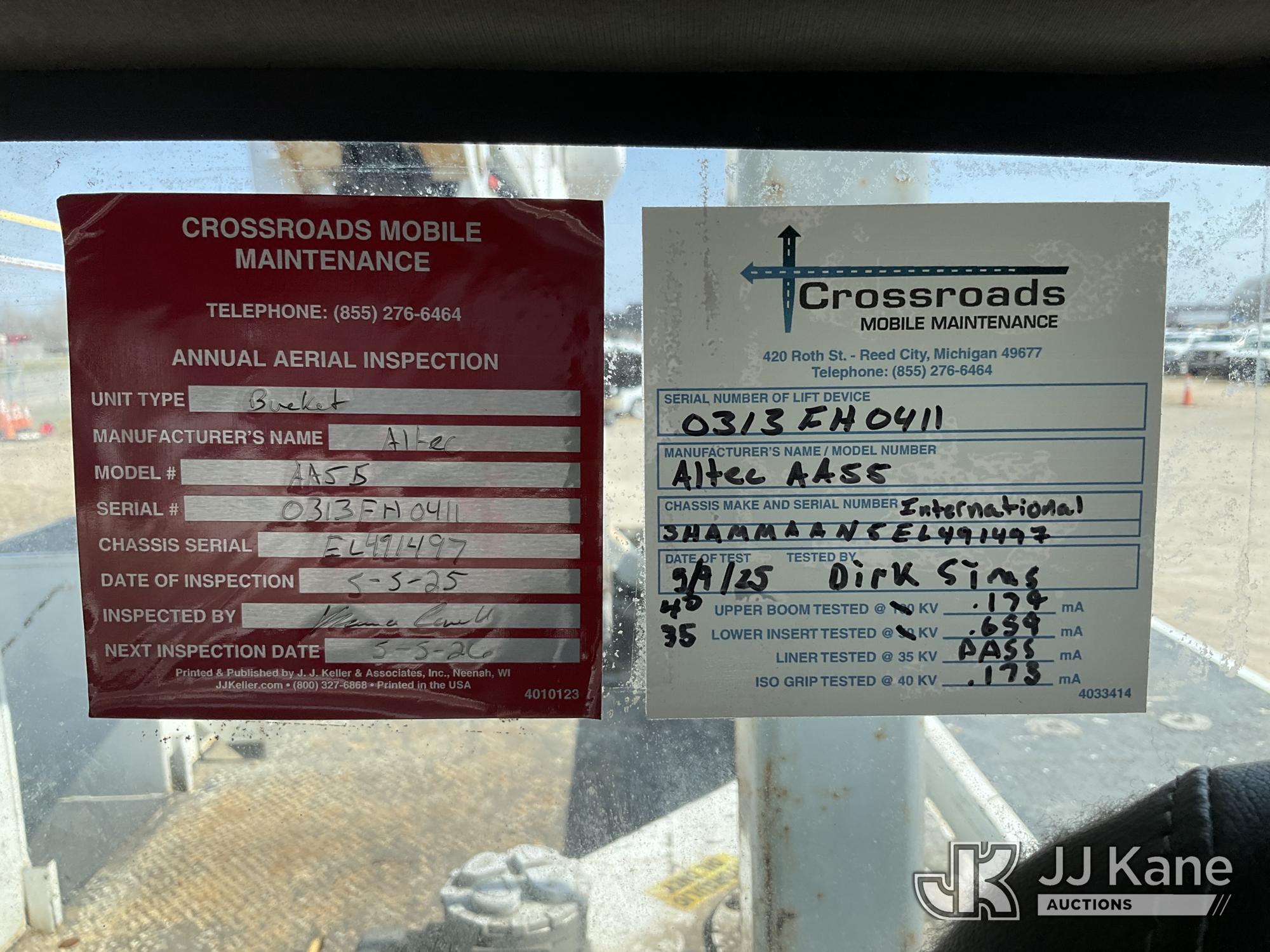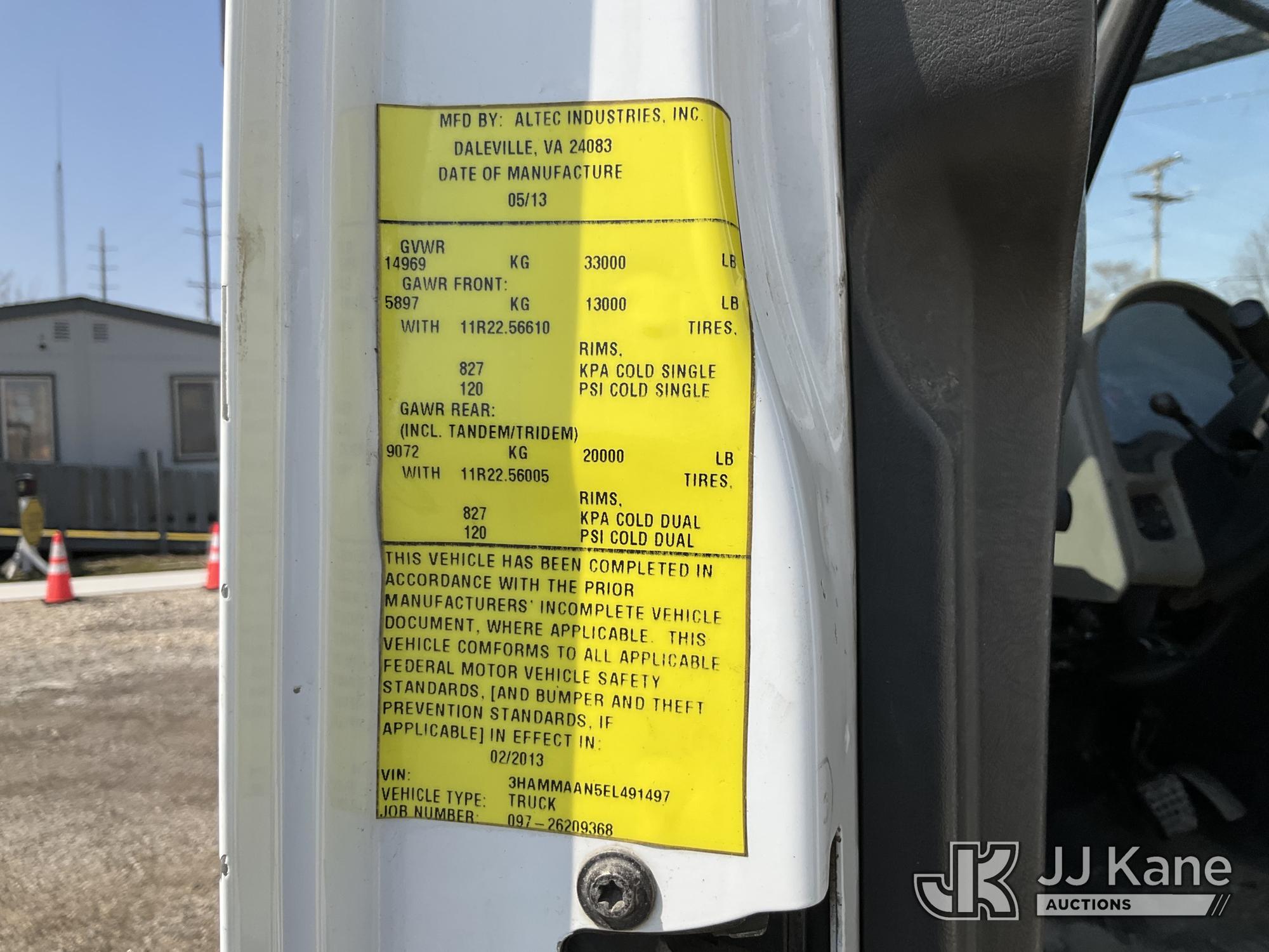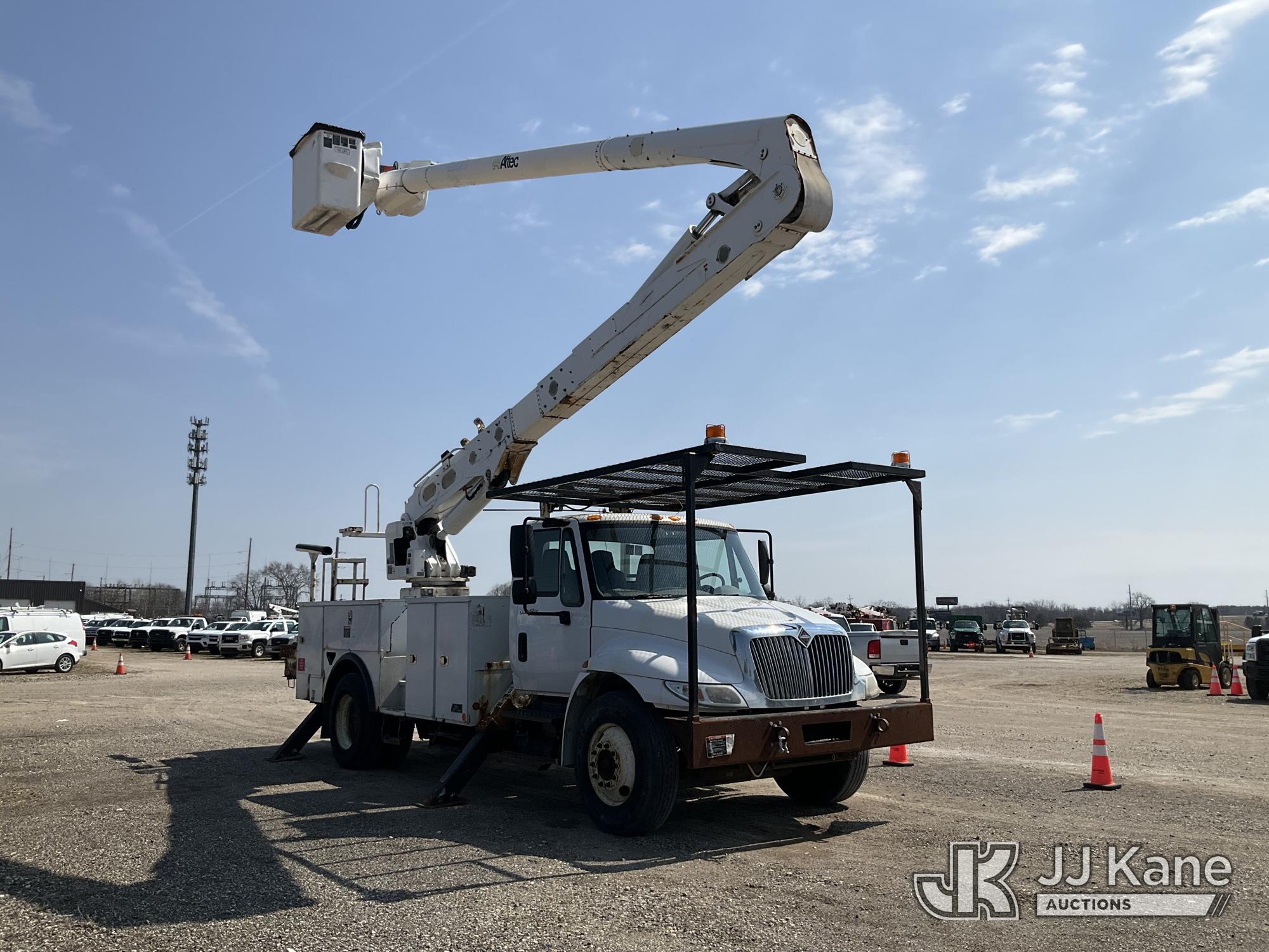 Altec AA55-MH, 60 ft, Material Handling Bucket Truck s/n 0313FH0411, with two man bucket, material handling jib, four hydraulic outriggers, rear mounted on 2014 International DuraStar 4300 Utility Truck, 7.6L L6 DIESEL 4X2, Auto, A/C, (90,630 miles) (Runs, Moves & Upper Operates) (Rust) (Reads 11,451 hours) This is a Titled Item*