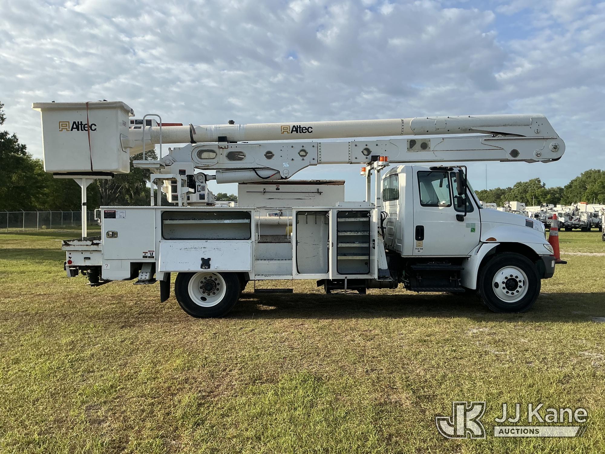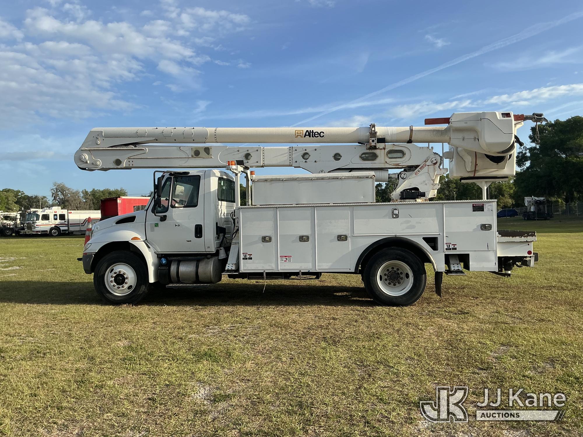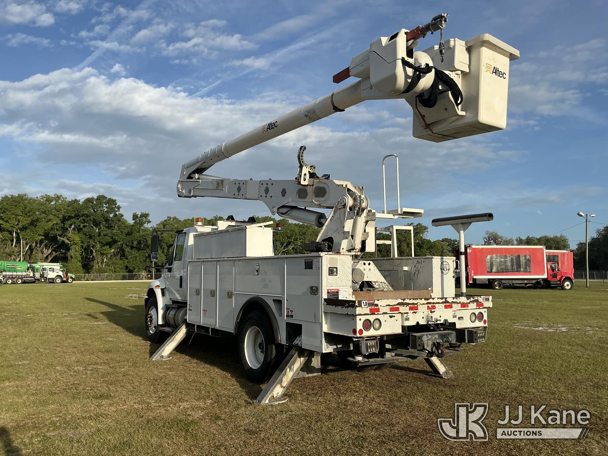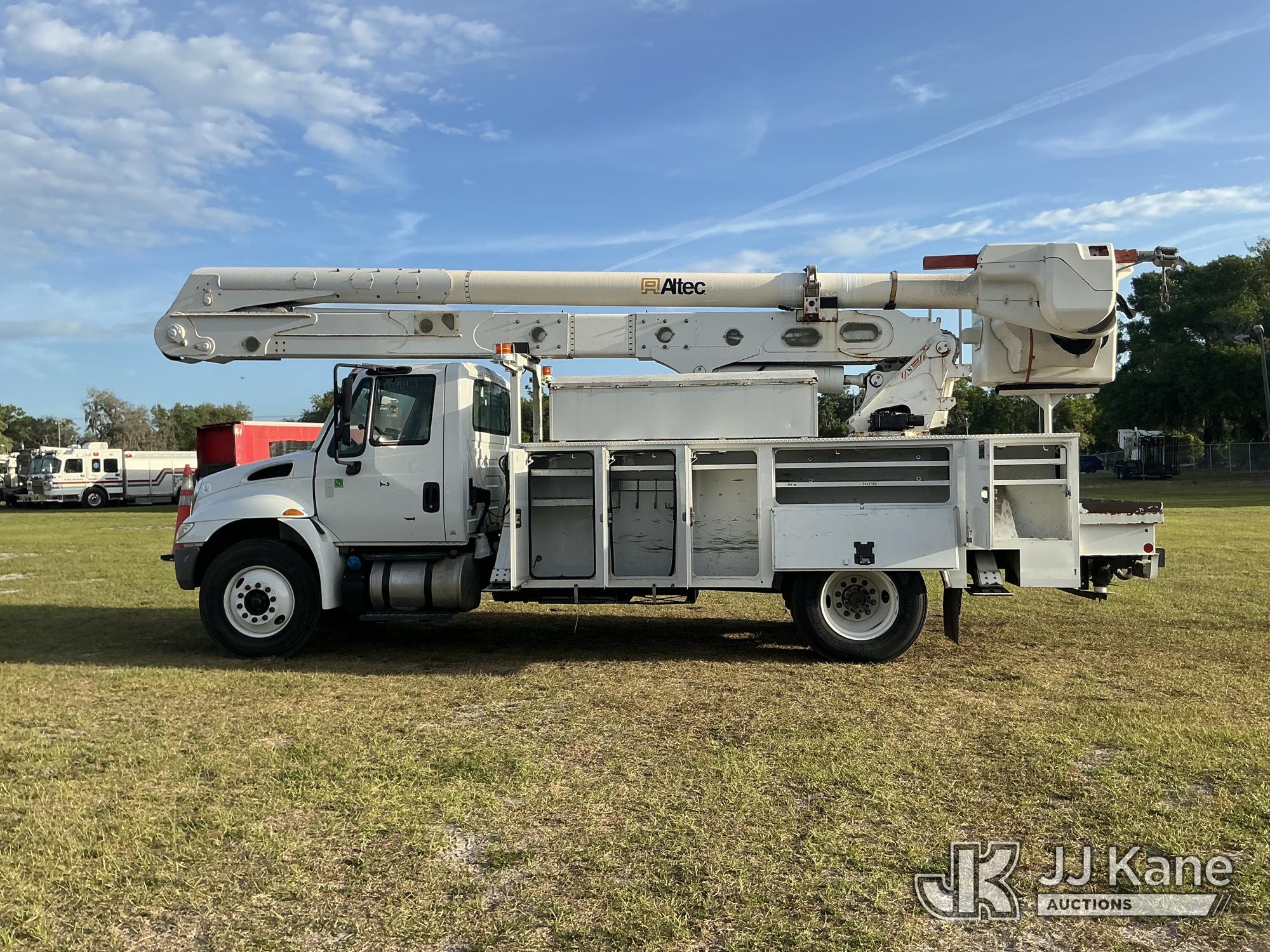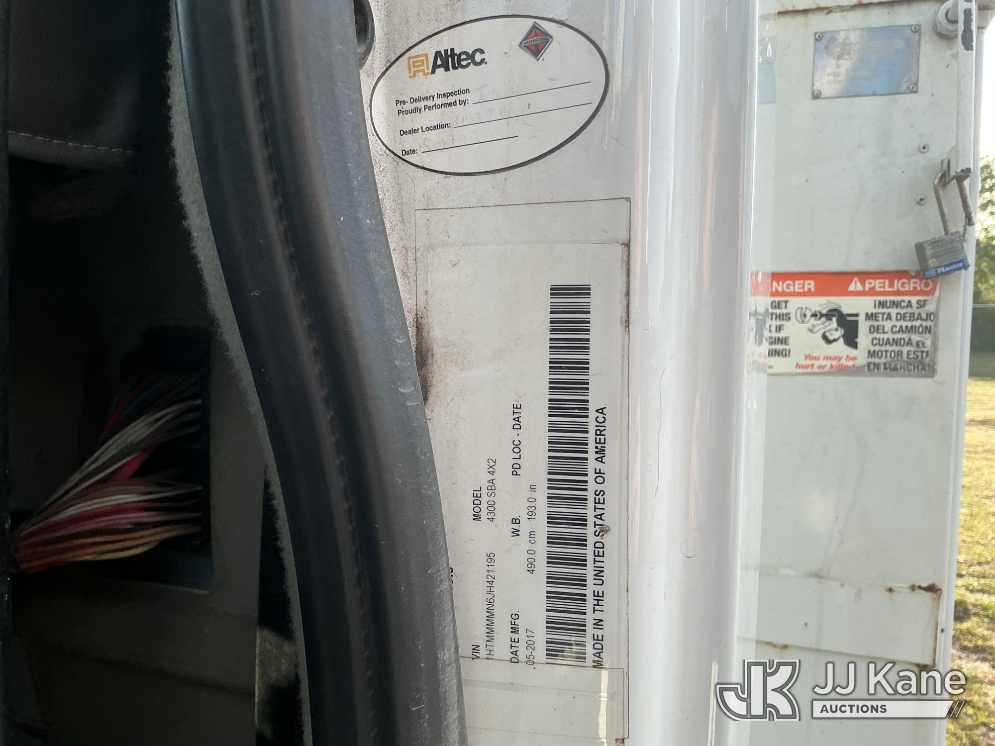 Altec AA55MH, 61 ft, Material Handling Bucket Truck s/n 0617FH4690, with Two-Man Bucket, 4 Hydraulic Outriggers, rear mounted on 2018 International 4300 Utility Truck, Cummins ISB 6.7L Diesel Auto, A/C, (60,933 miles) Radio/Dash Cam Not Included (Runs, Moves & Upper Operates) (Check Engine Light On) (Reads 2,632 hours) This is a Titled Item*